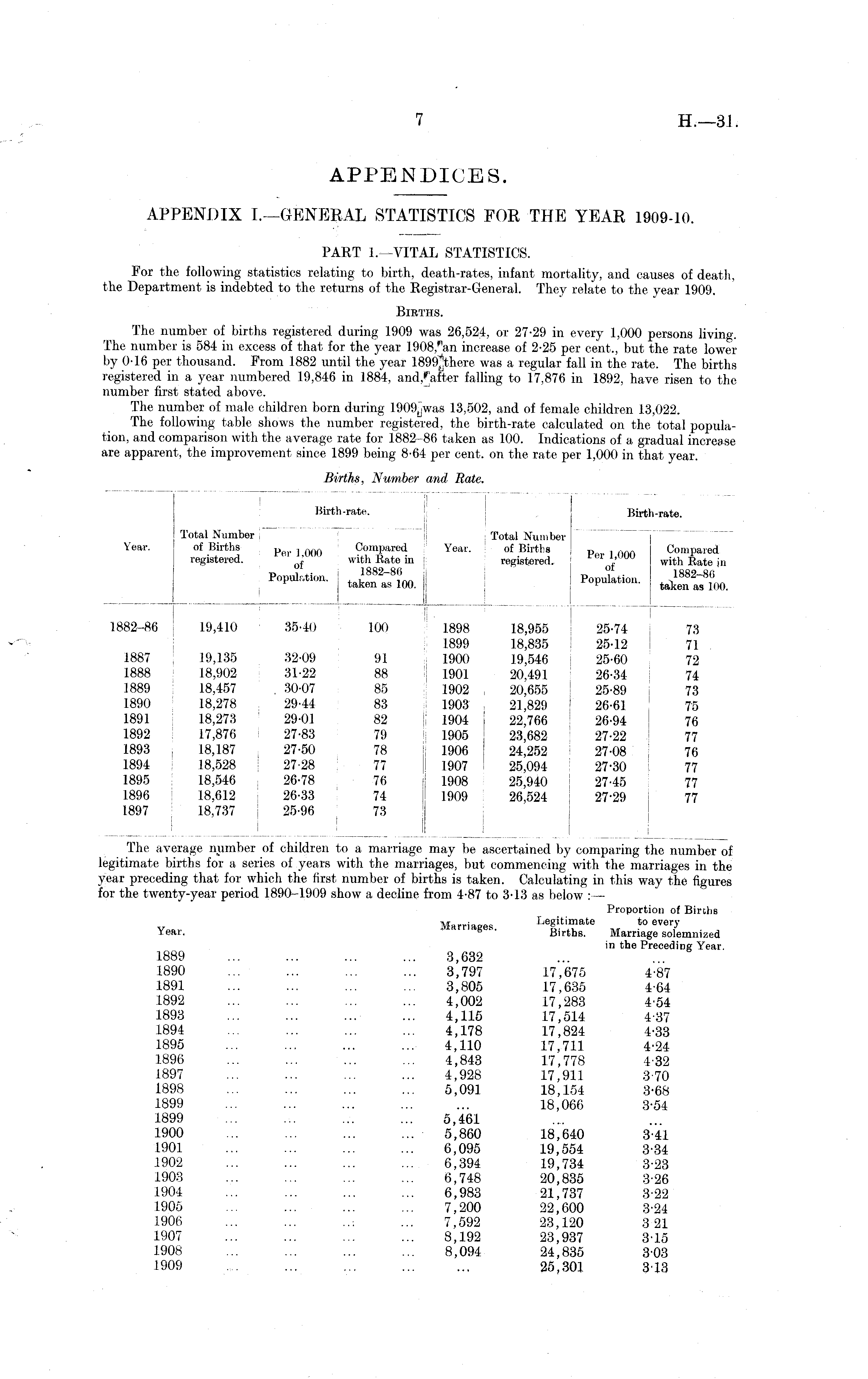 APPENDICES. APPENDIX L—GENERAL STATISTICS FOR THE YEAR 1909-10. PART I.—VITAL STATISTICS. For the following statistics relating to birth, death-rates, infant mortality, and causes of death, the Department is indebted to the returns of the Registrar-General. They relate to the year 1909. Births. The number of births registered during 1909 was 26,524, or 27-29 in every 1,000 persons living. The number is 584 in excess of that for the year increase of 2-25 per cent., but the rate lower by 0-16 per thousand. From 1882 until the year was a regular fall in the rate. The births registered in a year numbered 19,846 in 1884, falling to 17,876 in 1892, have risen to the number first stated above. The number of male children born during 1909 tJ was 13,502, and of female children 13,022. The following table shows the number registered, the birth-rate calculated on the total population, and comparison with the average rate for 1882-86 taken as 100. Indications of a gradual increase are apparent, the improvement since 1899 being 8-64 per cent, on the rate per 1,000 in that year.