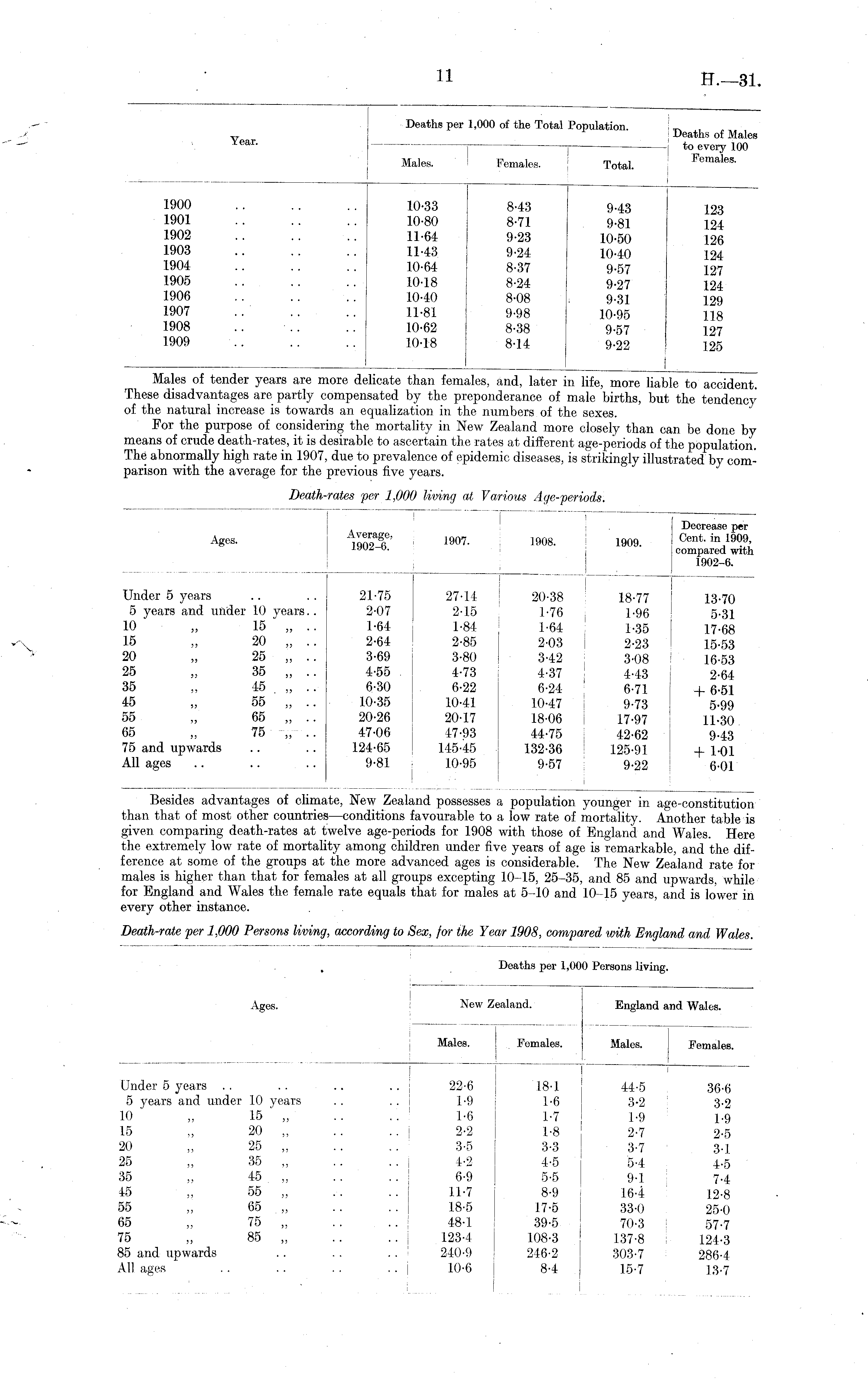 Males of tender years are more delicate than females, and, later in life, more liable to accident. These disadvantages are partly compensated by the preponderance of male births, but the tendency of the natural increase is towards an equalization in the numbers of the sexes. For the purpose of considering the mortality in New Zealand more closely than can be done by means of crude death-rates, it is desirable to ascertain the rates at different age-periods of the population. The abnormally high rate in 1907, due to prevalence of epidemic diseases, is strikingly illustrated by comparison with the average for the previous five years.