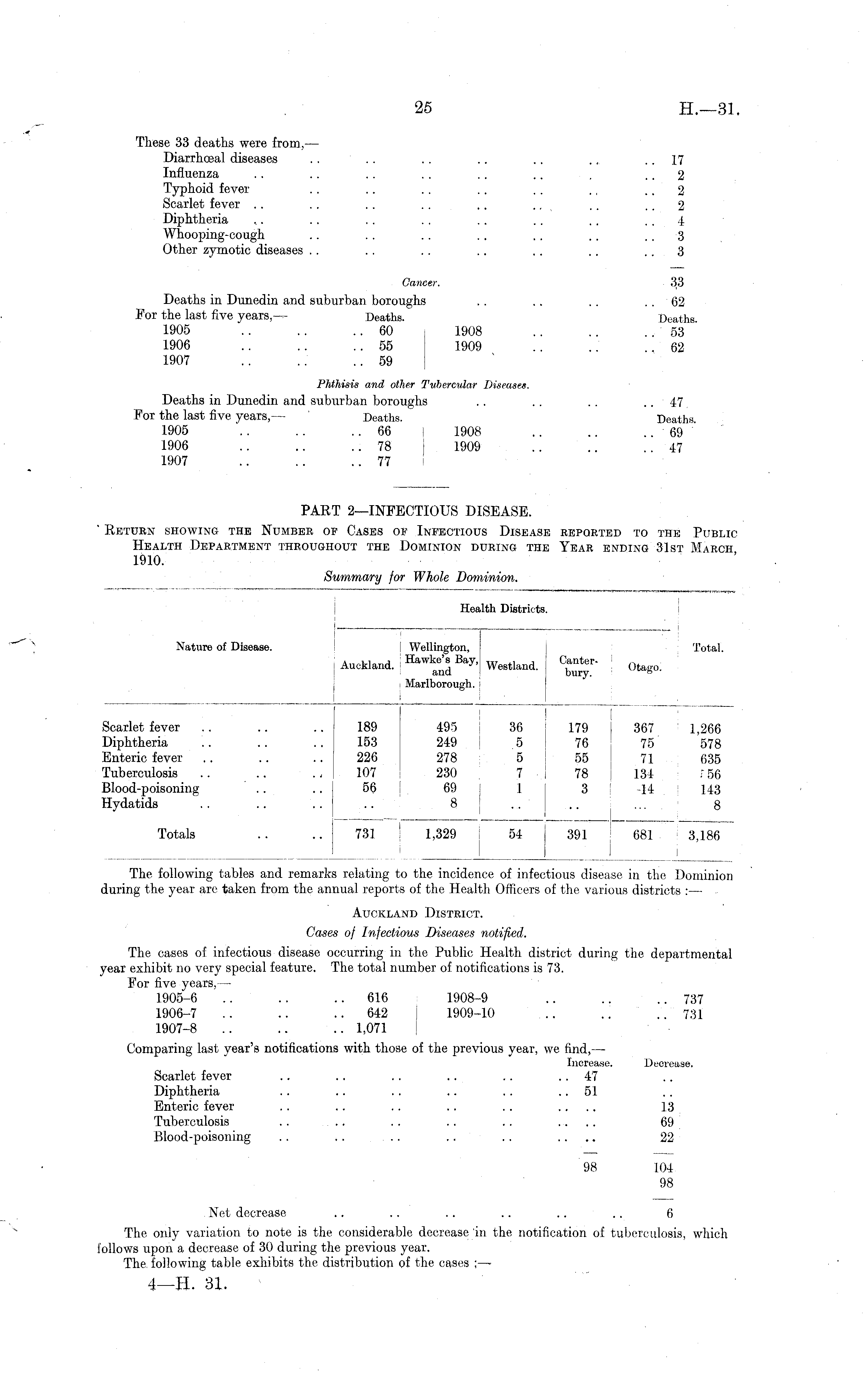 PART 2—INFECTIOUS DISEASE. " Return showing the Number of Cases of Infectious Disease reported to the Public Health Department throughout the Dominion during the Year ending 31st March 1910.