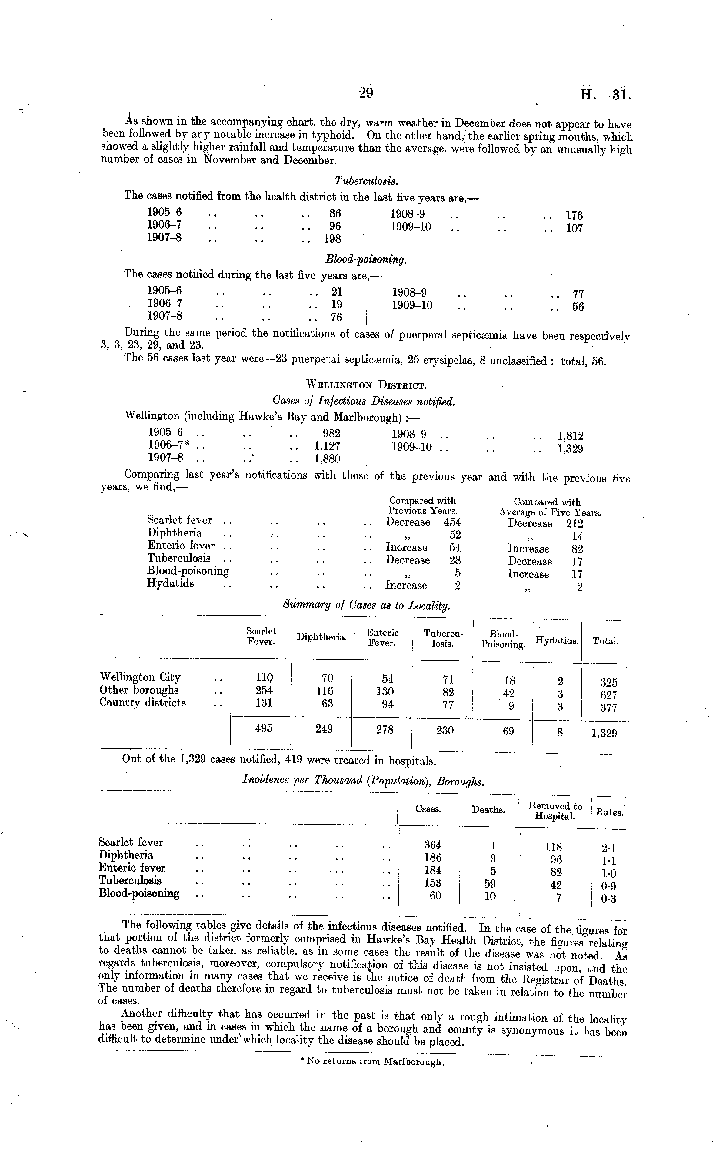 As shown in the accompanying chart, the dry, warm weather in December does not appear to have been followed by any notable increase in typhoid. On the other hand, the earlier spring months, which showed a slightly higher rainfall and temperature than the average, were followed by an unusually high number of cases in November and December. Tuberculosis. The cases notified from the health district in the last five years are, — 1905-6 86 1908-9 .. .. ..176 1906-7 .. .. ..96 1909-10 .. .. 107 1907-8 198 j Blood-poisoning. The cases notified during the last five years are, — 1905-6 .. .. ..21 1908-9 ... 77 1906-7 .. .. ..19 1909-10 56 1907-8 76 During the same period the notifications of cases of puerperal septicaemia have been resnectivelv 3, 3, 23, 29, and 23. ' F ■ ' The 56 cases last year were—23 puerperal septicaemia, 25 erysipelas, 8 unclassified : total, 56. Wellington Distbict. Gases of Infectious Diseases notified. Wellington (including Hawke's Bay and Marlborough) :— 1905-6 .. .. .. 982 1908-9 .. .. 1812 1906-7* 1,127 1909-10 1329 1907-8 .. ..' .. 1,880 Comparing last year's notifications with those of the previous year and with the previous five years, we find, — Compared with Compared with Previous Years. Average of Five Years, bcarlet fever .. •.. .. .. Decrease 454 Decrease 212 Diphtheria .. .. .. .. „ 52 14 Enteric fever .. .. . . .. Increase 54 Increase 82 Tuberculosis .. .. .. .. Decrease 28 Decrease 17 Blood-poisoning .. ~ .. „ 5 Increase 17 Hydatids .. .. .. .. Increase 2 „ 2