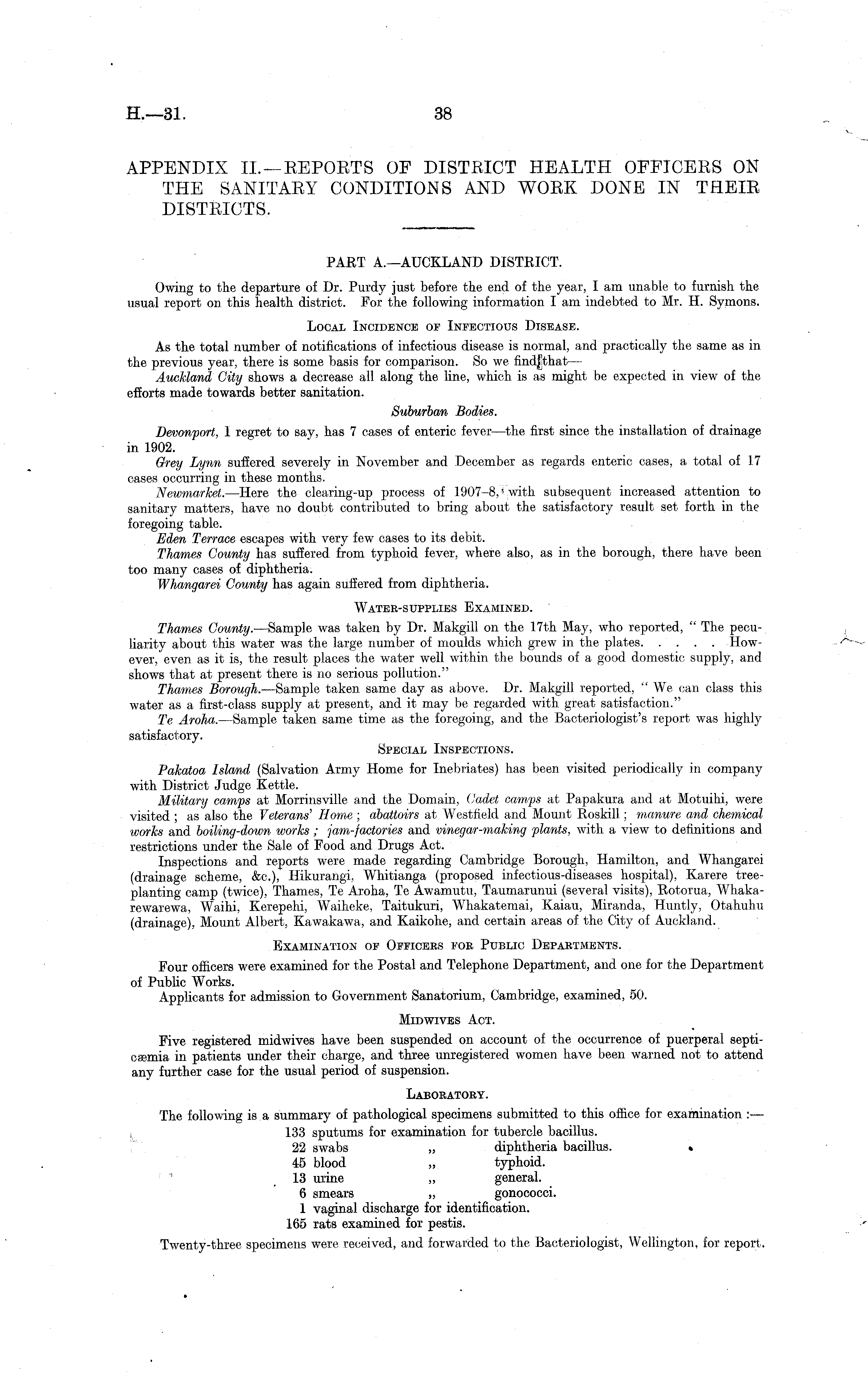 PART A.—AUCKLAND DISTRICT. Owing to the departure of Dr. Purdy just before the end of the year, I am unable to furnish the usual report on this health district. For the following information lam indebted to Mr. H. Symons. Local Incidence of Infectious Disease. As the total number of notifications of infectious disease is normal, and practically the same as in the previous year, there is some basis for comparison. So we findjthat — Auckland City shows a decrease all along the line, which is as might be expected in view of the efforts made towards better sanitation. Suburban Bodies. Devonport, I regret to say, has 7 cases of enteric fever —the first since the installation of drainage in 1902. Grey Lynn suffered severely in November and December as regards enteric cases, a total of 17 cases occurring in these months. Newmarket. —Here the clearing-up process of 1907-8, '■ with subsequent increased attention to sanitary matters, have no doubt contributed to bring about the satisfactory result set forth in the foregoing table. Eden Terrace escapes with very few cases to its debit. Thames County has suffered from typhoid fever, where also, as in the borough, there have been too many cases of diphtheria. Whangarei County has again suffered from diphtheria. Water-supplies Examined. Thames County. —Sample was taken by Dr. Makgill on the 17th May, who reported, " The peculiarity about this water was the large number of moulds which grew in the plates However, even as it is, the result places the water well within the bounds of a good domestic supply, and shows that at present there is no serious pollution." Thames Borough. —Sample taken same day as above. Dr. Makgill reported, "We can class this water as a first-class supply at present, and it may be regarded with great satisfaction." Te Aroha. —Sample taken same time as the foregoing, and the Bacteriologist's report was highly satisfactory. Special Inspections. Pakatoa Island (Salvation Army Home for Inebriates) has been visited periodically in company with District Judge Kettle. Military camps at Morrinsville and the Domain, Cadet camps at Papakura and at Motuihi, were visited ; as also the Veterans' Home ; abattoirs at Westfield and Mount Roskill; manure and chemical works and boiling-down works ; jam-factories and vinegar-making plants, with a view to definitions and restrictions under the Sale of Food and Drugs Act. Inspections and reports were made regarding Cambridge Borough, Hamilton, and Whangarei (drainage scheme, &c), Hikurangi, Whitianga (proposed infectious-diseases hospital), Karere treeplanting camp (twice), Thames, Te Aroha, Te Awamutu, Taumarunui (several visits), Rotorua, Whakarewarewa, Waihi, Kerepehi, Waiheke, Taitukuri, Whakatemai, Kaiau, Miranda, Huntly, Otahuhu (drainage), Mount Albert, Kawakawa, and Kaikohe, and certain areas of the City of Auckland. Examination of Officees fob Public Depabtments. Four officers were examined for the Postal and Telephone Department, and one for the Department of Public Works. Applicants for admission to Government Sanatorium, Cambridge, examined, 50. Midwives Act. Five registered midwives have been suspended on account of the occurrence of puerperal septicaemia in patients under their charge, and three unregistered women have been warned not to attend any further case for the usual period of suspension. Labobatoby. The following is a summary of pathological specimens submitted to this office for examination :— i 133 sputums for examination for tubercle bacillus. 22 swabs „ diphtheria bacillus. • 45 blood „ typhoid. ; ' 13 urine „ general. 6 smears „ gonococci. 1 vaginal discharge for identification. 165 rats examined for pestis. Twenty-three specimens were received, and forwarded to the Bacteriologist, Wellington, for report.