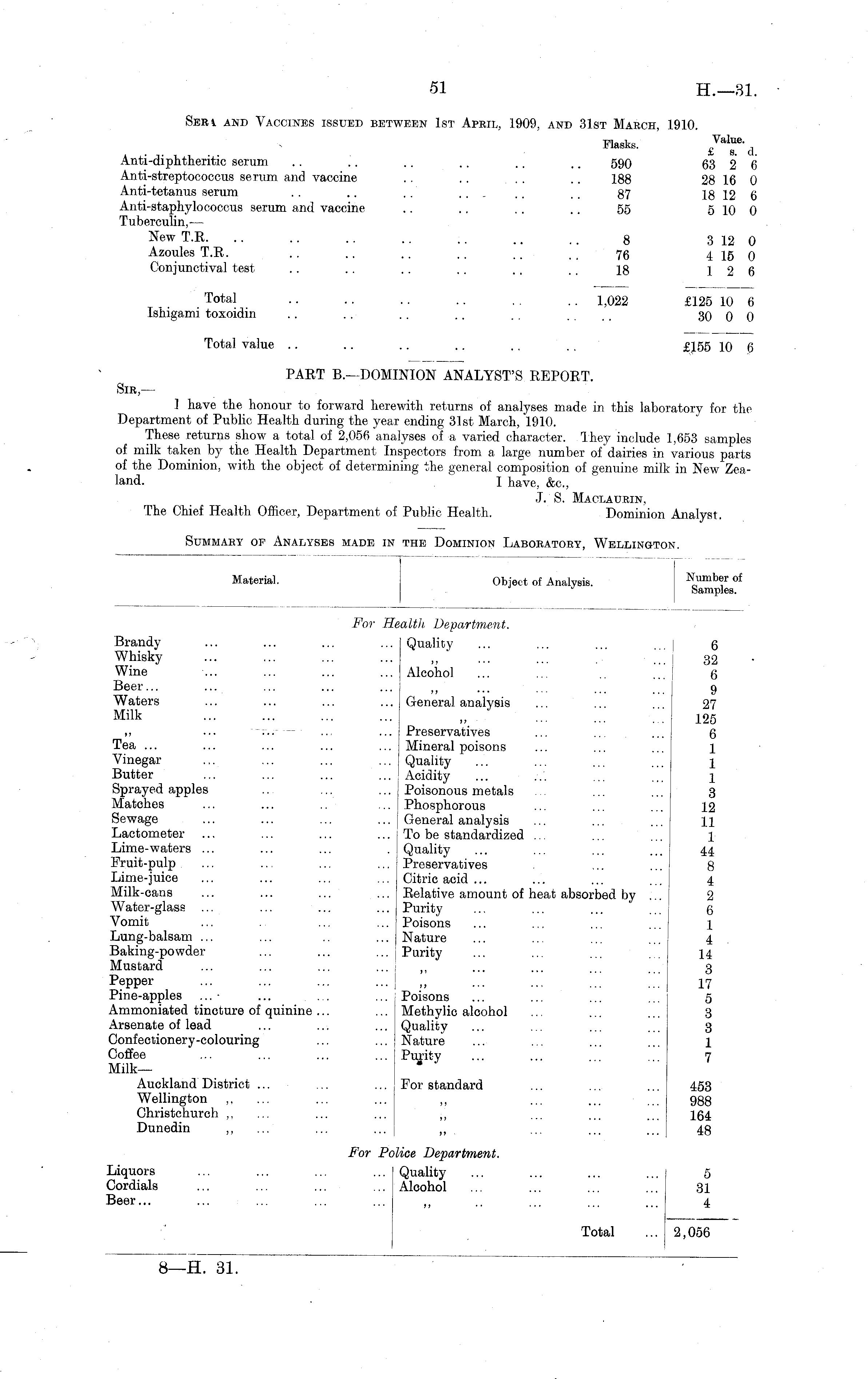 Sbbi and Vaccines issued between Ist Apbil, 1909, and 31st March, 1910. Flasks. £ Val r - d Anti-diphtheritic serum .. .. .. .. ~ .. 590 63 2 6 Anti-streptococcus serum and vaccine . . . . . . .. 188 28 16 0 Anti-tetanus serum .. .. .. .. .. ~ 87 18 12 6 Anti-staphylo coccus serum and vaccine .. .. . . .. 55 510 0 Tuberculin, — New T.R 8 3 12 0 Azoules T.R. .. .. .. .. .. .. 76 415 0 Conjunctival test .. .. .. .. .. ~ 18 12 6 Total .. .. .. .. .. .. 1,022 £125 10 6 Ishigami toxoidin . . . . . . .. . , .... 30 0 0 Total value .. .. .. .. .. .. £155 10 q PART B.—DOMINION ANALYST'S REPORT. Sir — ] have the honour to forward herewith returns of analyses made in this laboratory for the Department of Public Health during the year ending 31st March, 1910. These returns show a total of 2,056 analyses of a varied character. They include 1,653 samples of milk taken by the Health Department Inspectors from a large number of dairies in various parts of the Dominion, with the object of determining the general composition of genuine milk in New Zealand. I have, &c, J. S. Maclaubin, The Chief Health Officer, Department of Public Health. Dominion Analyst.
