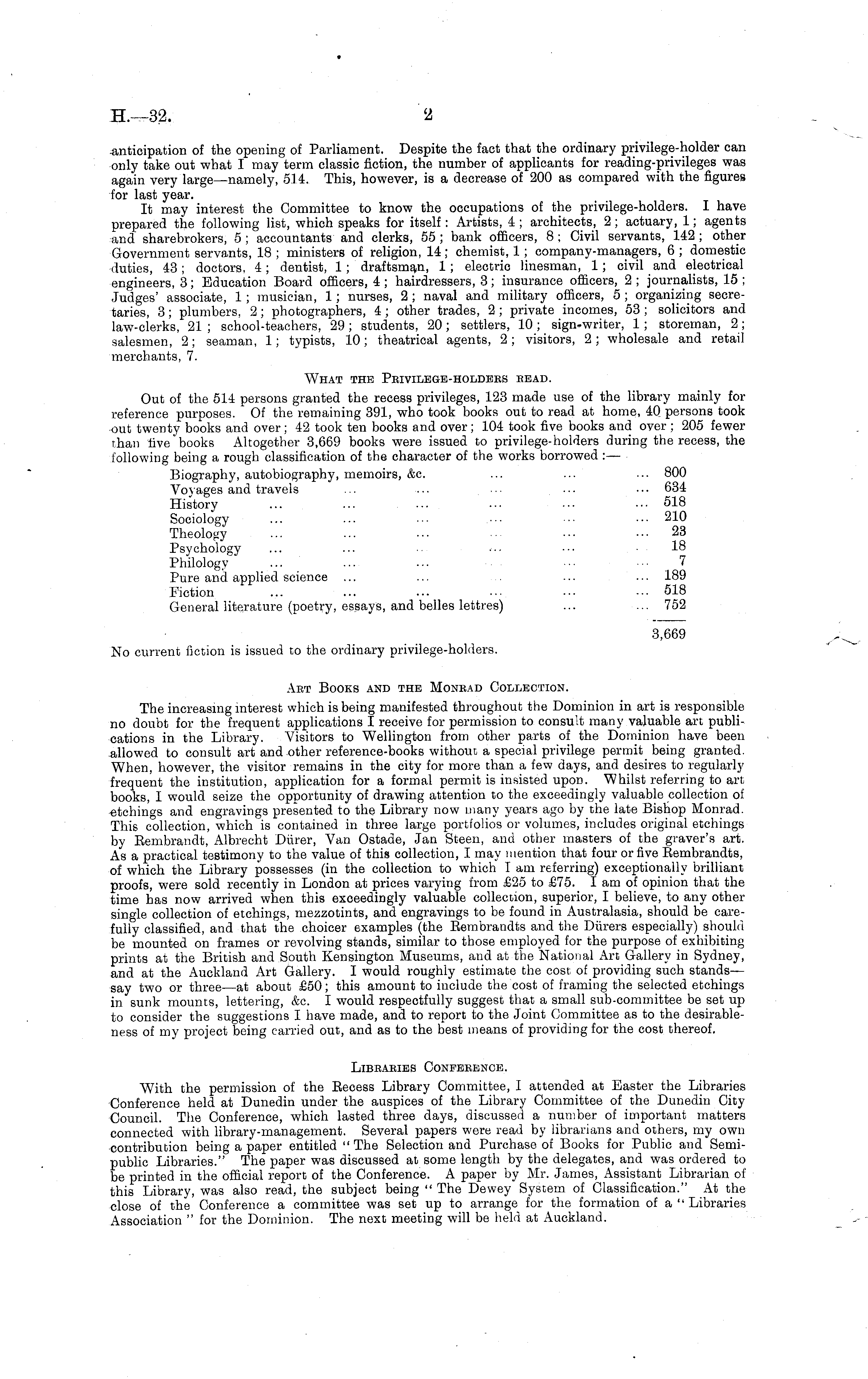 anticipation of the opening of Parliament. Despite the fact that the ordinary privilege-holder can only take out what I may term classic fiction, the number of applicants for reading-privileges was again very large—namely, 5.14. This, however, is a decrease of 200 as compared with the figures for last year. It may interest the Committee to know the occupations of the privilege-holders. I have prepared the following list, which speaks for itself: Artists, 4 ; architects, 2; actuary, 1; agents and sharebrokers, 5 ; accountants and clerks, 55 ; bank officers, 8 ; Civil servants, 142 ; other Government servants, 18 ; ministers of religion, 14; chemist, 1 ; company-managers, 6 ; domestic duties, 43; doctors, 4; dentist, 1; draftsman, 1; electric linesman, 1; civil and electrical engineers, 3; Education Board officers, 4; hairdressers, 3; insurance officers, 2 ; journalists, 15 ; Judges' associate, 1; musician, 1; nurses, 2 ; naval and military officers, 5 ; organizing secretaries, 3; plumbers, 2; photographers, 4; other trades, 2 ; private incomes, 53 ; solicitors and law-clerks, 21; school-teachers, 29; students, 20; settlers, 10; sign-writer, 1; storeman, 2; salesmen, 2; seaman, 1; typists, 10; theatrical agents, 2; visitors, 2; wholesale and retail merchants, 7. What the Privilege-holders bead. Out of the 514 persons granted the recess privileges, 123 made use of the library mainly for reference purposes. Of the remaining 391, who took books out to read at home, 40 persons took out twenty books and over; 42 took ten books and over; 104 took five books and over ; 205 fewer than five books Altogether 3,669 books were issued to privilege-holders during the recess, the following being a rough classification of the character of the works borrowed :— Biography, autobiography, memoirs, &c. ... ... ... 800 Voyages and travels ... ... . ... •■• •■• 634 History ... ... ... ... ■•• ■•■ 518 Sociology ... ... ■■■ ■•■ ••• ••• 210 Theology ... ... •■• ■•• •■■ ••• 23 Psychology ... ... ■ ••• ••• .■■ 18 Philology ... ... ... •'•• ■■■ 7 Pure and. applied science ... ... ... ■■■ ■•• 189 Fiction ... ... ... •■■ ■■■ •■• 518 General literature (poetry, essays, and belles lettres) ... ... 752 3,669 No current fiction is issued to the ordinary privilege-holders. Art Books and the Monrad Collection. The increasing interest which is being manifested throughout the Dominion in art is responsible no doubt for the frequent applications I receive for permission to consult many valuable art publications in the Library. Visitors to Wellington from other parts of the Dominion have been .allowed to consult art and other reference-books without a special privilege permit being granted. When, however, the visitor remains in the city for more than a few days, and desires to regularly frequent the institution, application for a formal permit is insisted upon. Whilst referring to art books, I would seize the opportunity of drawing attention to the exceedingly valuable collection of etchings and engravings presented to the Library now many years ago by the late Bishop Monrad. This collection, which is contained in three large portfolios or volumes, includes original etchings by Rembrandt, Albrecht Diirer, Van Ostade, Jan Steen, and other masters of the graver's art. As a practical testimony to the value of this collection, I may mention that four or five Eembrandts, of which the Library possesses (in the collection to which I am referring) exceptionally brilliant proofs, were sold recently in London at prices varying from £25 to £75. lam of opinion that the time has now arrived when this exceedingly valuable collection, superior, I believe, to any other single collection of etchings, mezzotints, and engravings to be found in Australasia, should be carefully classified, and that the choicer examples (the Eembrandts and the Diirers especially) should be mounted on frames or revolving stands, similar to those employed for the purpose of exhibiting prints at the British and South Kensington Museums, and at the National Art Gallery in Sydney, and at the Auckland Art Gallery. I would roughly estimate the cost of providing such stands— say two or three—at about £50; this amount to include the cost of framing the selected etchings in sunk mounts, lettering, &c. I would respectfully suggest that a small sub-committee be set up to consider the suggestions I have made, and to report to the Joint Committee as to the desirableness of my project being carried out, and as to the best means of providing for the cost thereof. Libraries Conference. With the permission of the Eecess Library Committee, I attended at Easter the Libraries Conference held at Dunedin under the auspices of the Library Committee of the Dunedin City Council. The Conference, which lasted three days, discussed a number of important matters connected with library-management. Several papers were read by librarians and others, my own contribution being a paper entitled "The Selection and Purchase of Books for Public and Semipublic Libraries." The paper was discussed at some length by the delegates, and was ordered to be printed in the official report of the Conference. A paper by Mr. James, Assistant Librarian of this Library, was also read, the subject being " The Dewey System of Classification." At the close of the Conference a committee was set up to arrange for the formation of a" Libraries Association " for the Dominion. The next meeting will be held at Auckland.