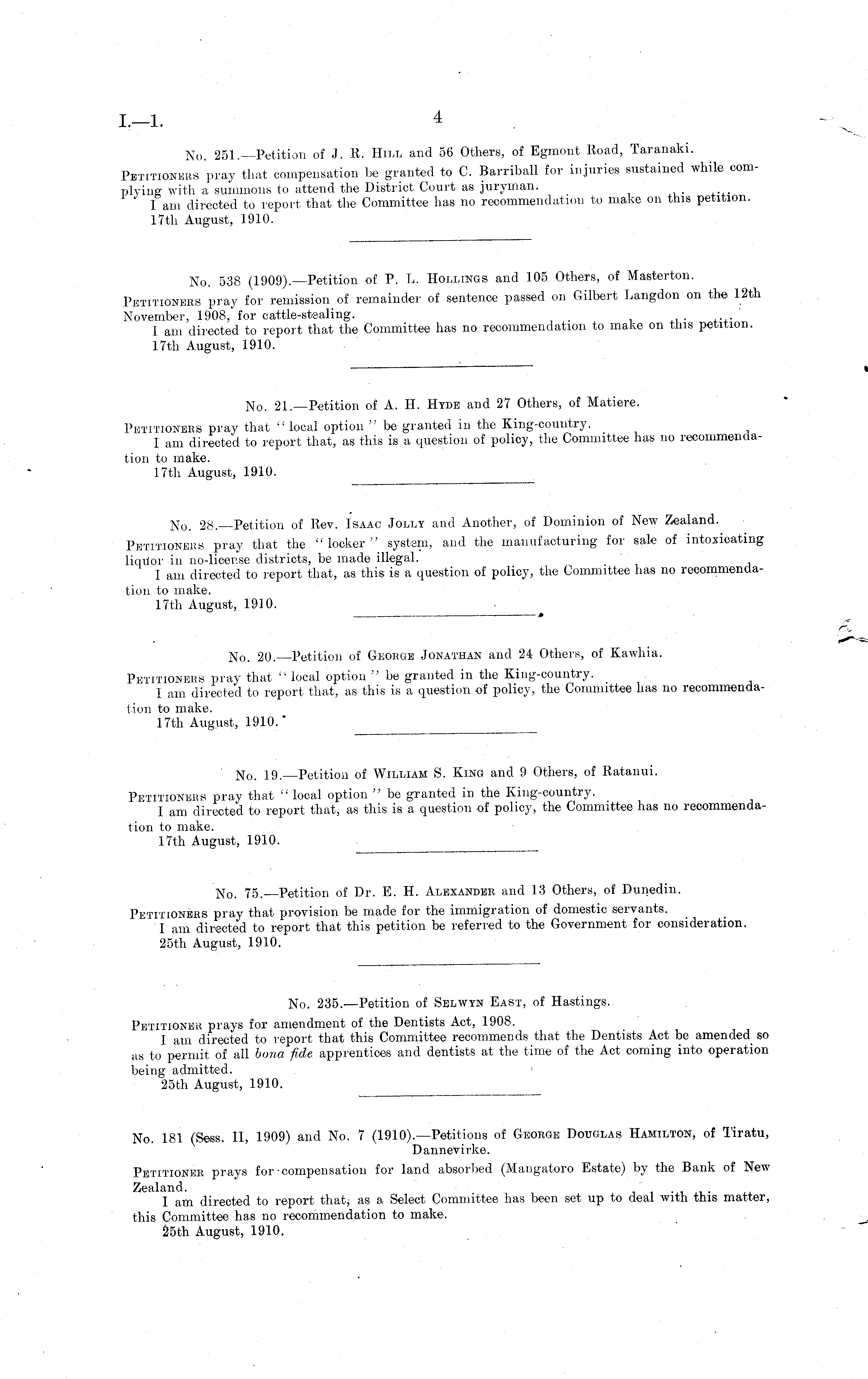 No. 19.—Petition of William S. King and 9 Others, of Ratanui. Petitioners pray that " local option " be granted in the King-country. I am directed to report that, as this is a question of policy, the Committee has no recommendation to make. 17th August, 1910.