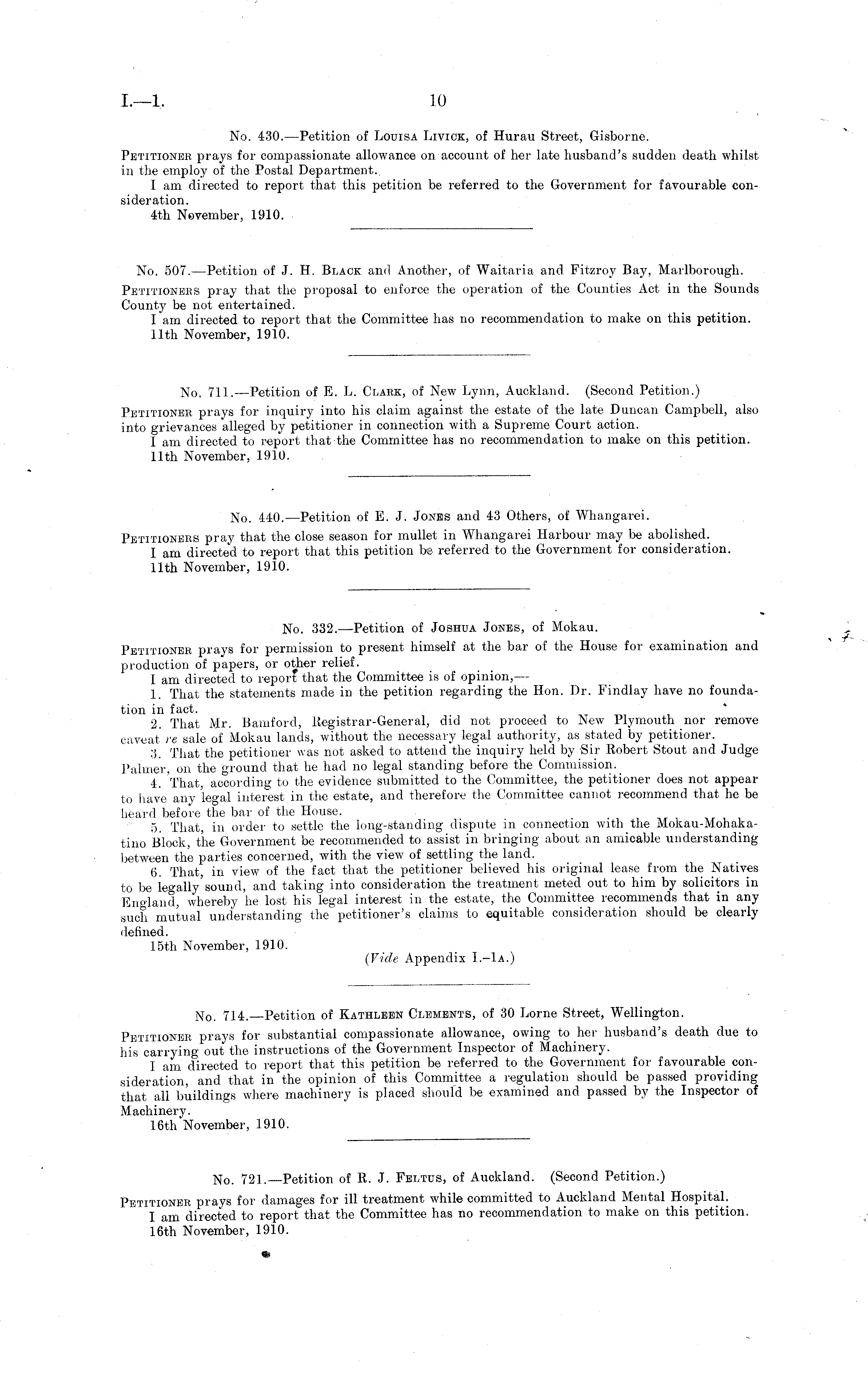 No. 721.—Petition of R. J. Feltus, of Auckland. (Second Petition.) Petitioner prays for damages for ill treatment while committed to Auckland Mental Hospital. I am directed to report that the Committee has no recommendation to make on this petition. 16th November, 1910.