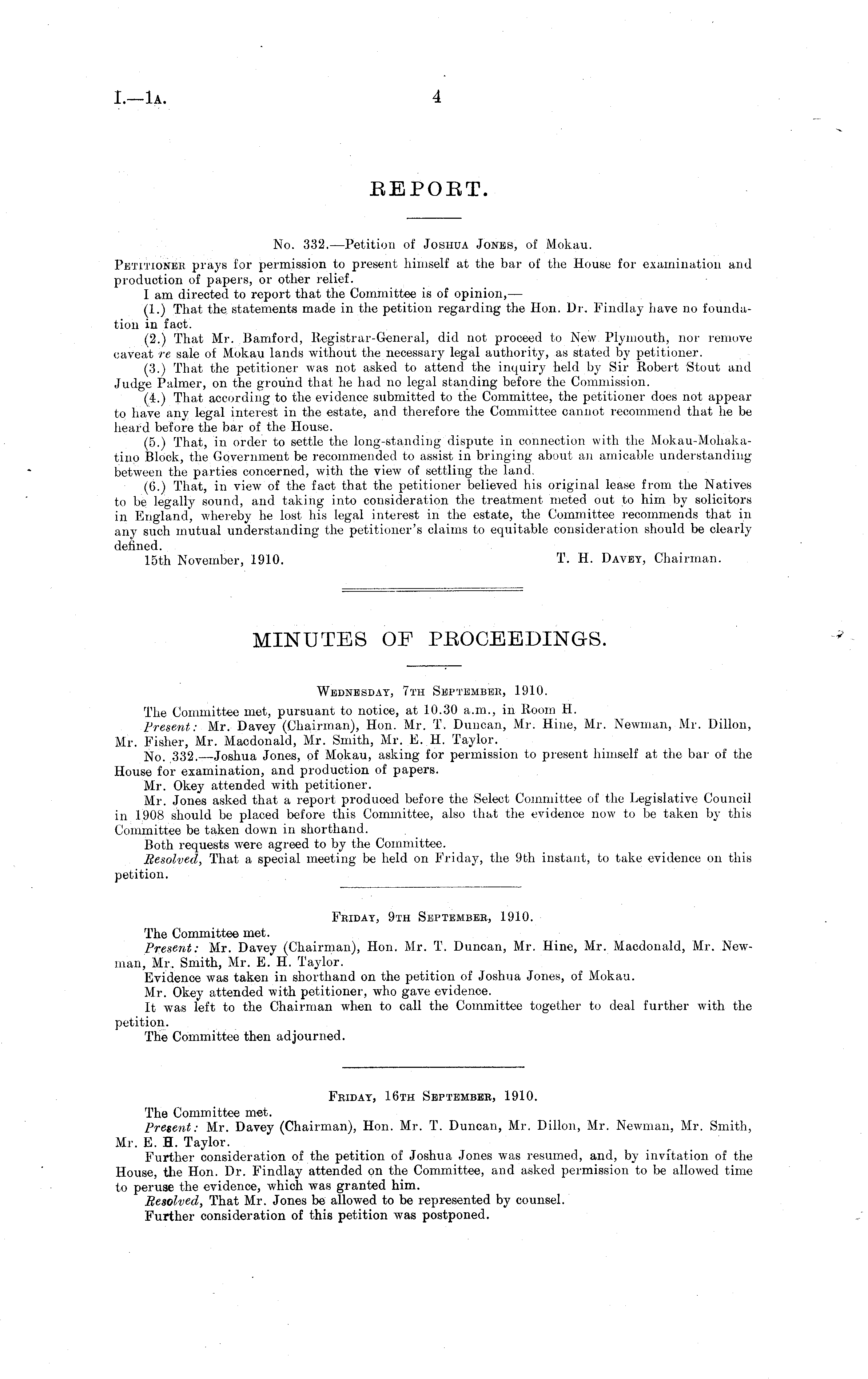 MINUTES OF PBOCEEDINGS. Wednesday, 7th September, 1910. The Committee met, pursuant to notice, at 10.30 a.m., in Room H. Present: Mr. Davey (Chairman), Hon. Mr. T. Duncan, Mr. Hive, Mr. Newman, Mr. Dillon, Mr. Fisher, Mr. Macdonald, Mr. Smith, Mr. E. H. Taylor. No. 332.—Joshua Jones, of Mokau, asking for permission to present himself at the bar of the House for examination, and production of papers. Mr. Okey attended with petitioner. Mr. Jones asked that a report produced before the Select Committee of the Legislative Council in 1908 should be placed before this Committee, also that the evidence now to be taken by this Committee be taken down in shorthand. Both requests were agreed to by the Committee. Resolved, That a special meeting be held on Friday, the 9th instant, to take evidence on this petition.