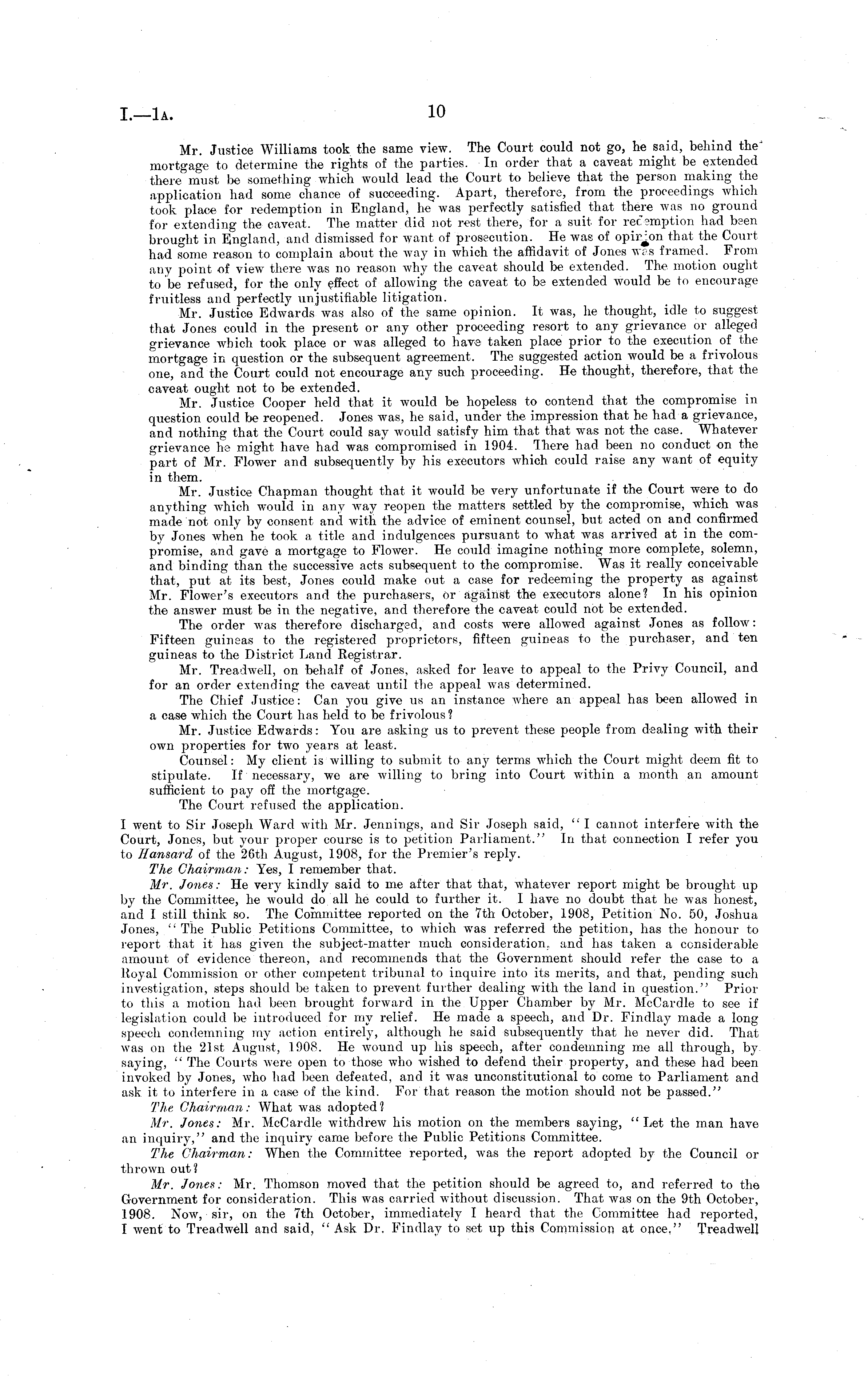Mr. Justice Williams took the same view. The Court could not go, he said, behind the mortgage to determine the rights of the parties. In order that a caveat might be extended there must be something which would lead the Court to believe that the person making the application had some chance of succeeding. Apart, therefore, from the proceedings which took, place for redemption in England, he was perfectly satisfied that there was no ground for extending the caveat. The matter did not rest there, for a suit for recemption had been brought in England, and dismissed for want of prosecution. He was of opir-ton that the Court had some reason to complain about the way in which the affidavit of Jones wes framed. From any point of view there was no reason why the caveat should be extended. The motion ought to be refused, for the only effect of allowing the caveat to be extended would be to encourage fruitless and perfectly unjustifiable litigation. Mr. Justice Edwards was also of the same opinion. It was, he thought, idle to suggest that Jones could in the present or any other proceeding resort to any grievance or alleged grievance which took place or was alleged to have taken place prior to the execution of the mortgage in question or the subsequent agreement. The suggested action would be a frivolous one, and the Court could not encourage any such proceeding. He thought, therefore, that the caveat ought not to be extended. Mr. Justice Cooper held that it would be hopeless to contend that the compromise in question could be reopened. Jones was, he said, under the impression that he had a grievance, and nothing that the Court could say would satisfy him that that was not the case. Whatever grievance he might have had was compromised in 1904. There had been no conduct on the part of Mr. Flower and subsequently by his executors which could raise any want of equity in them. Mr. Justice Chapman thought that it would be very unfortunate if the Court were to do anything which would in any way reopen the matters settled by the compromise, which was made not only by consent and with the advice of eminent counsel, but acted on and confirmed by Jones when he took a title and indulgences pursuant to what was arrived at in the compromise, and gave a mortgage to Flower. He could imagine nothing more complete, solemn, and binding than the successive acts subsequent to the compromise. Was it really conceivable that, put at its best, Jones could make out a case for redeeming the property as against Mr. Flower's executors and the purchasers, or against the executors alone? In his opinion the answer must be in the negative, and therefore the caveat could not be extended. The order was therefore discharged, and costs were allowed against Jones as follow: Fifteen guineas to the registered proprietors, fifteen guineas to the purchaser, and ten guineas to the District Land Registrar. Mr. Treadwell, on behalf of Jones, asked for leave to appeal to the Privy Council, and for an order extending the caveat until the appeal was determined. The Chief Justice: Can you give us an instance where an appeal has been allowed in a case which the Court has held to be frivolous ? Mr. Justice Edwards: You are asking us to prevent these people from dealing with their own properties for two years at least. Counsel: My client is willing to submit to any terms which the Court might deem fit to stipulate. If necessary, we are willing to bring into Court within a month an amount sufficient to pay off the mortgage. The Court refused the application. I went to Sir Joseph Ward with Mr. Jennings, and Sir Joseph said, " I cannot interfere with the Court, Jones, but your proper course is to petition Parliament." In that connection I refer you to Hansard of the 26th August, 1908, for the Premier's reply. The Chairman: Yes, I remember that. Mr. Jones: He very kindly said to me after that that, whatever report might be brought up by the Committee, he would do all he could to further it. I have no doubt that he was honest, and I still think so. The Committee reported on the 7th October, 1908, Petition No. 50, Joshua Jones, "The Public Petitions Committee, to which was referred the petition, has the honour to report that it has given the subject-matter much consideration, and has taken a considerable amount of evidence thereon, and recommends that the Government should refer the case to a Royal Commission or other competent tribunal to inquire into its merits, and that, pending such investigation, steps should be taken to prevent further dealing with the land in question." Prior to this a motion had been brought forward in the Upper Chamber by Mr. McCardle to see if legislation could be introduced for my relief. He made a speech, and Dr. Findlay made a long speech condemning my action entirely, although he said subsequently that he never did. That was on the 21st August, 1908. He wound up his speech, after condemning me all through, by. saying, " The Courts were open to those who wished to defend their property, and these had been invoked by Jones, who had been defeated, and it was unconstitutional to come to Parliament and ask it to interfere in a case of the kind. For that reason the motion should not be passed." The Chairman : What was adopted ? Mr. Jones: Mr. McCardle withdrew his motion on the members saying, "Let the man have an inquiry," and the inquiry came before the Public Petitions Committee. The Chairman: When the Committee reported, was the report adopted by the Council or thrown out? Mr. Jones: Mr. Thomson moved that the petition should be agreed to, and referred to the Government for consideration. This was carried without discussion. That was on the 9th October, 1908. Now, sir, on the 7th October, immediately I heard that the Committee had reported, I went to Treadwell and said, "Ask Dr. Findlay to set up this Commission at once," Treadwell