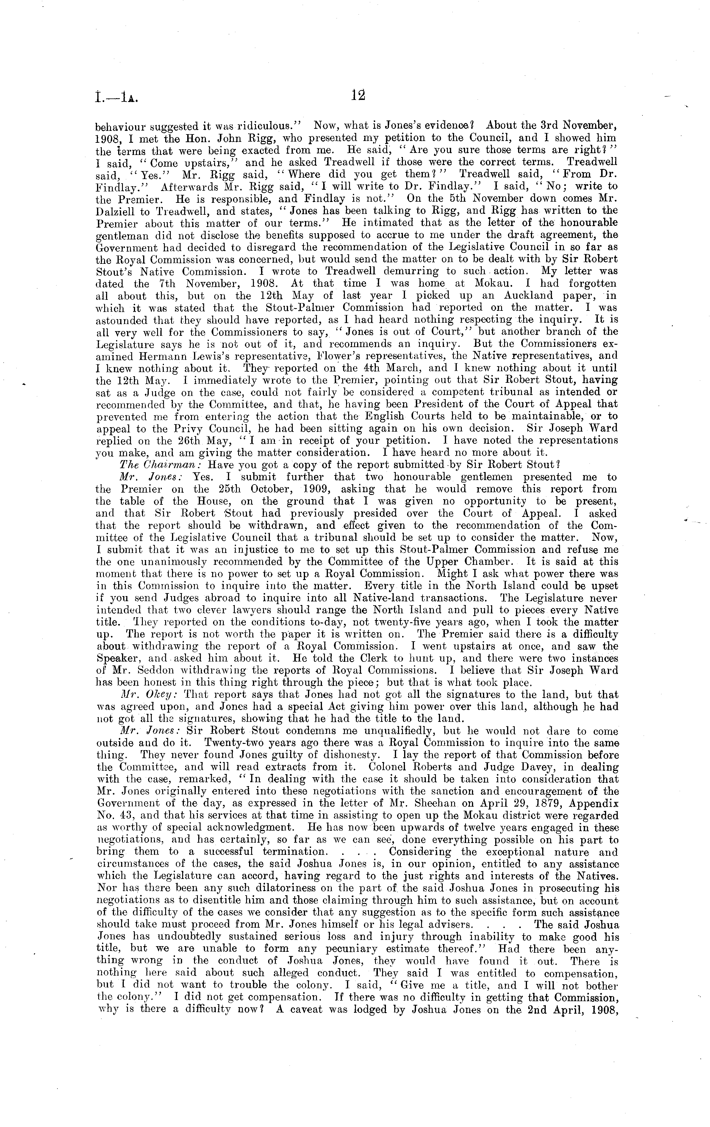 behaviour suggested it was ridiculous." Now, what is Jones's evidence? About the 3rd November, 1908, I met the Hon. John Rigg, who presented my petition to the Council, and I showed him the lerms that were being exacted from me. He said, " Are you sure those terms are right? " I said, " Come upstairs," and he asked Treadwell if those were the correct terms. Treadwell said, "Yes." Mr. Rigg said, "Where did you get them?" Treadwell said, "From Dr. Findlay." Afterwards Mr. Rigg said, "I will write to Dr. Findlay." I said, "No; write to the Premier. He is responsible, and Findlay is not." On the sth November down comes Mr. Dalziell to Treadwell, and states, " Jones has been talking to Rigg, and Rigg has written to the Premier about this matter of our terms." He intimated that as the letter of the honourable gentleman did not disclose the benefits supposed to accrue to me under the draft agreement, the Government had decided to disregard the recommendation of the Legislative Council in so far as the Royal Commission was concerned, but would send the matter on to be dealt with by Sir Robert Stout's Native Commission. I wrote to Treadwell demurring to such action. My letter was dated the 7th November, 1908. At that time I was home at Mokau. I had forgotten all about this, but on the 12th May of last year I picked up an Auckland paper, in which it was stated that the Stout-Palmer Commission had reported on the matter. I was astounded that they should have reported, as I had heard nothing respecting the inquiry. It is all very well for the Commissioners to say, " Jones is out of Court," but another branch of the Legislature says he is not out of it, and recommends an inquiry. But the Commissioners examined Hermann Lewis's representative, Flower's representatives, the Native representatives, and I knew nothing about it. They reported on the 4th March, and I knew nothing about it until the 12th May. I immediately wrote to the Premier, pointing out that Sir Robert Stout, having sat as a Judge on the case, could not fairly be considered a competent tribunal as intended or recommended by the Committee, and that, he having been President of the Court of Appeal that prevented me from entering the action that the English Courts held to be maintainable, or to appeal to the Privy Council, he had been sitting again on his own decision. Sir Joseph Ward replied on the 26th May, " I am in receipt of your petition. I have noted the representations you make, and am giving the matter consideration. I have heard no more about it. The Ghairman: Have you got a copy of the report submitted by Sir Robert Stout? Mr. Jones: Yes. I submit further that two honourable gentlemen presented me to the Premier on the 25th October, 1909, asking that he would remove this report from the table of the House, on the ground that I was given no opportunity to be present, and that Sir Robert Stout had previously presided over the Court of Appeal. I asked that the report should be withdrawn, and effect given to the recommendation of the Committee of the Legislative Council that a tribunal should be set up to consider the matter. Now, I submit that it was an injustice to me to set up this Stout-Palmer Commission and refuse me the one unanimously recommended by the Committee of the Upper Chamber. It is said at this moment that there is no power to set up a Royal Commission. Might I ask what power there was in this Commission to inquire into the matter. Every title in the North Island could be upset if you send Judges abroad to inquire into all Native-land transactions. The Legislature never intended that two clever lawyers should range the North Island and pull to pieces every Native title. They reported on the conditions to-day, not twenty-five years ago, when I took the matter up. The report is not worth the paper it is written on. The Premier said there is a difficulty about withdrawing the report of a Royal Commission. I went upstairs at once, and saw the Speaker, and asked him about it. He told the Clerk to hunt up, and there were two instances of Mr. Seddon withdrawing the reports of Royal Commissions. I believe that Sir Joseph Ward has been honest in this thing right through the piece; but that is what took place. Mr. Okey: That report says that Jones had not got all the signatures to the land, but that was agreed upon, and Jones had a special Act giving him power over this land, although he had not got all the signatures, showing that he had the title to the land. Mr. Jones: Sir Robert Stout condemns me unqualifiedly, but he would not dare to come outside and do it. Twenty-two years ago there was a Royal Commission to inquire into the same thing. They never found Jones guilty of dishonesty. I lay the report of that Commission before the Committee, and will read extracts from it. Colonel Roberts and Judge Davey, in dealing with the case, remarked, " In dealing with the case it should be taken into consideration that Mr. Jones originally entered into these negotiations with the sanction and encouragement of the Government of the day, as expressed in the letter of Mr. Sheehan on April 29, 1879, Appendix No. 43, and that his services at that time in assisting to open up the Mokau district were regarded as worthy of special acknowledgment. He has now been upwards of twelve years engaged in these negotiations, and has certainly, so far as we can see, done everything possible on his part to bring them to a successful termination. . . . Considering the exceptional nature and circumstances of the cases, the said Joshua Jones is, in our opinion, entitled to any assistance which the Legislature can accord, having regard to the just rights and interests of the Natives. Nor has thsre been such dilatoriness on the part of the said Joshua Jones in prosecuting his negotiations as to disentitle him and those claiming through him to such assistance, but on account of the difficulty of the cases we consider that any suggestion as to the specific for