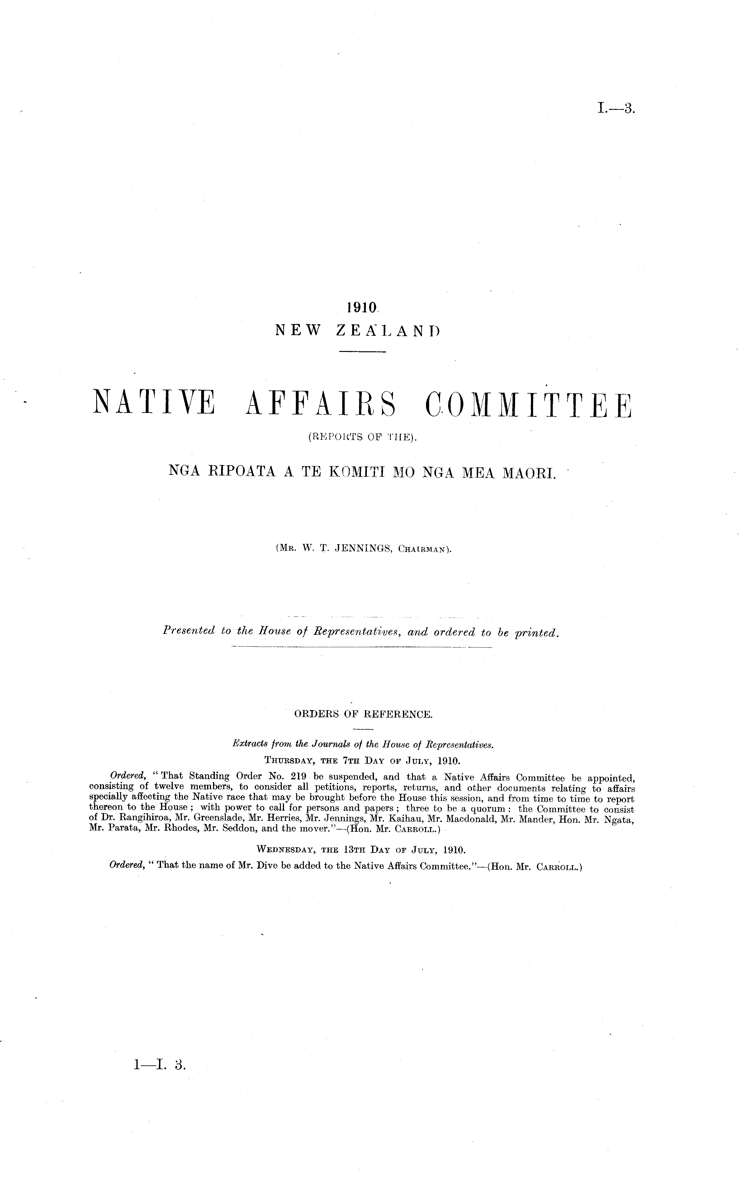 ORDERS OF REFERENCE. Extracts from the Journals of the House of Representatives. Thursday, the 7th Day of July, 1910. Ordered, " That Standing Order No. 219 be suspended, and that a Native Affairs Committee be appointed, consisting of twelve members, to consider all petitions, reports, returns, and other documents relating to affairs specially affecting the Native race that may be brought before the House this session, and from time to time to report thereon to the House ; with power to call for persons and papers ; three to be a quorum : the Committee to consist of Dr. Rangihiroa, Mr. Greenslade, Mr. Horries, Mr. Jennings, Mr. Kaihau, Mr. Macdonald, Mr. Mander, Hon. Mr. Ngata, Mr. Parata, Mr. Rhodes, Mr. Seddon, and the mover."—(Hon. Mr. Carroll.) Wednesday, the 13th Day or July, 1910. Ordered, " That the name of Mr. Dive be added to the Native Affairs Committee."—(Hon. Mr. Carroll.)