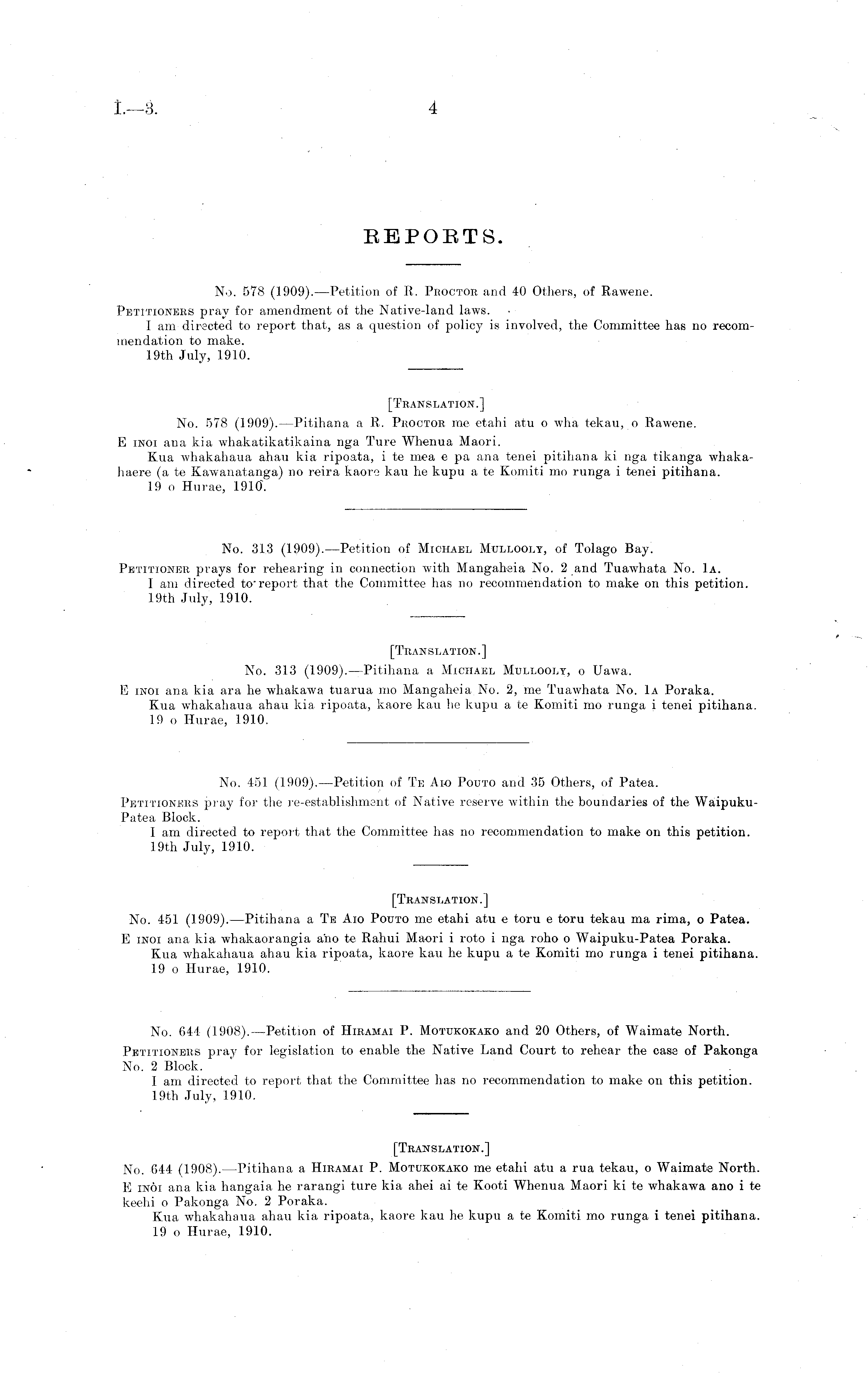 [Translation.] No. 578 (1909). —Pitihana a R. Proctor me etahi atu o wha tekau, o Rawene. E inoi ana Ida whakatikatikaina nga Ture Whenua Maori. Kua whakahaua ahau kia ripoata, i te mea e pa ana tenei pitihana ki nga tikanga whakaliaere (a te Kawanatanga) no reira kaore kau he kupu a te Komiti mo runga i tenei pitihana. 19 o Hurae, 1910.