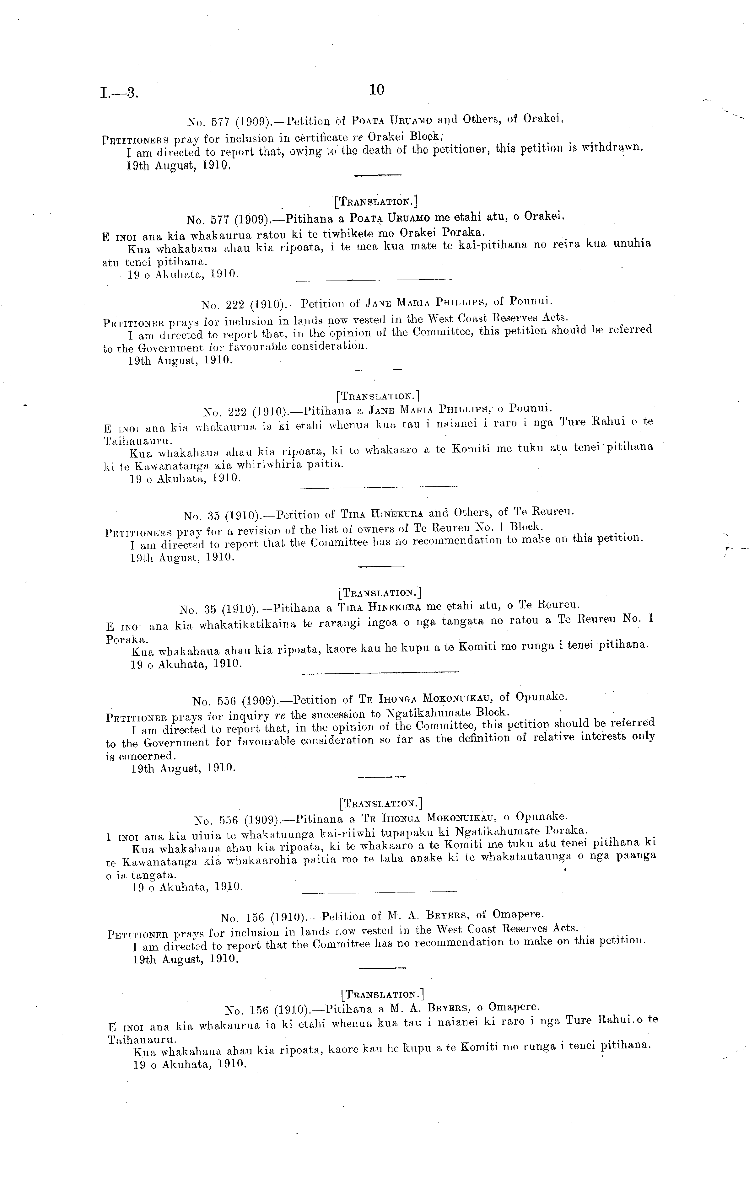 [Translation.] No. 35 (1910).— Pitihana a Tira Hinekura me etahi atu, o Te Reureu. E inoi ana kia whakatikatikaina te rarangi ingoa o nga tangata no ratou a Te Reureu No. 1 ""Kua whakahaua ahau kia ripoata, kaore kau he kupu a te Komiti mo runga i tenei pitihana. 19 o Akuhata, 1910.