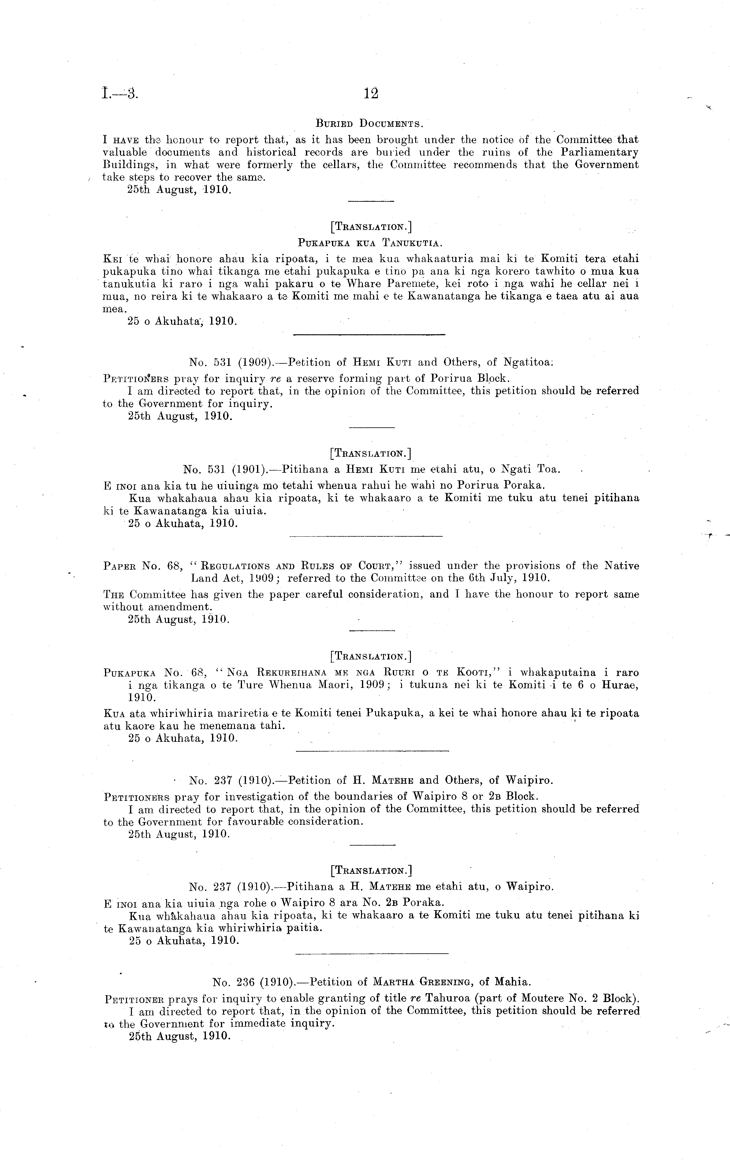 [Translation.] PUKAPUKA KUA TaNUKUTIA. Kei te whai honore ahau kia ripoata, i te mea kua whakaaturia mai ki te Komiti tera etahi pukapuka tino whai tikanga me etahi pukapuka e tine pa ana ki nga korero tawhito o mua kua tanukutia ki raro i nga wahi pakaru o te Whare Paremete, kei roto i nga wahi he cellar nei 1 mua, no reira ki te whakaaro a te Komiti me mahi e te Kawanatanga he tikanga e taea atu ai aua mea. 25 o Akuhata, 1910.