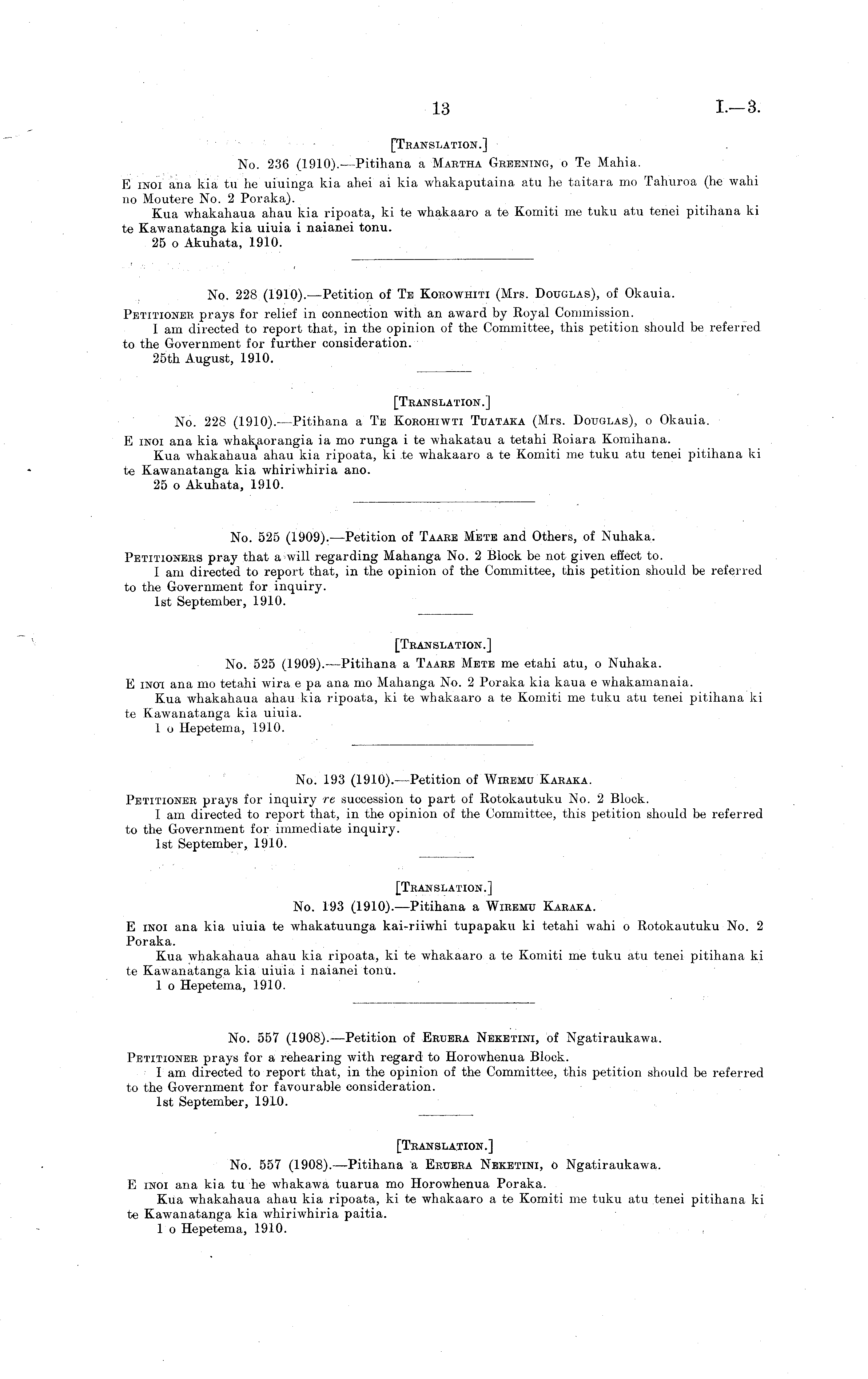 [Translation.] No. 228 (1910). —Pitihana a Te Korohiwti Tuataka (Mrs. Douglas), o Okauia. E inoi ana kia whakaorangia ia mo runga i te whakatau a tetahi Roiara Komihana. Kua whakahaua ahau kia ripoata, ki te whakaaro a te Komiti me tuku atu tenei pitihana ki te Kawanatanga kia whiriwhiria ano. 25 o Akuhata, 1910.