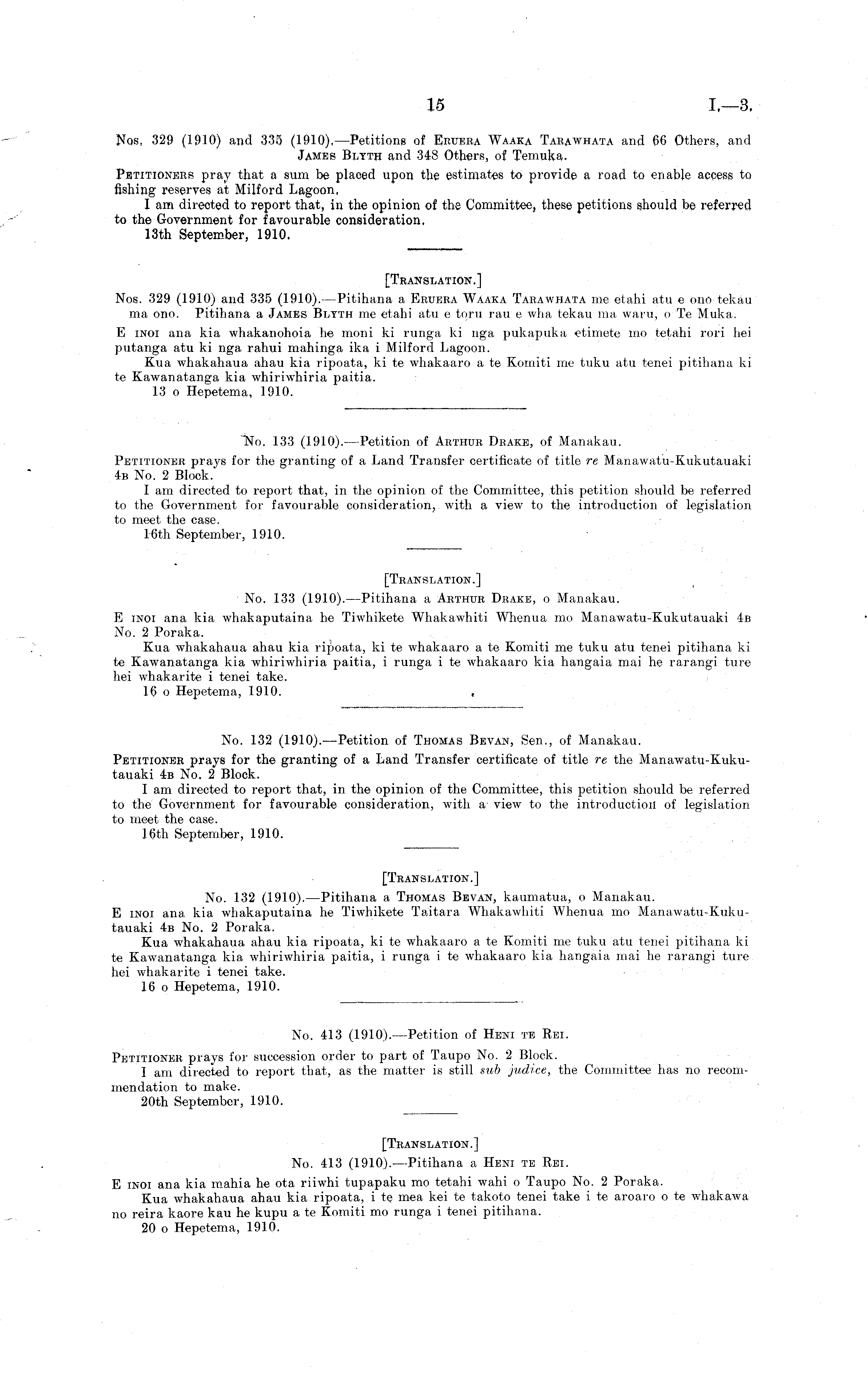 [Translation.] Nos. 329 (1910) and 335 (1910). —Pitihana a Ebueba Waaka Tabawhata me etahi atu e ono tekau ma ono. Pitihana a James Blyth me etahi atu e toru rau e wha tekau ma warn, oTe Muka. E inoi ana kia whakanohoia he moni ki runga ki nga pukapuka etimete mo tetahi. rori hei putanga atu ki nga rahui mahinga ika i Milford Lagoon. Kua whakahaua ahau kia ripoata, ki te whakaaro a te Komiti me tuku atu tenei pitihana ki te Kawanatanga kia whiriwhiria paitia. 13 o Hepetema, 1910.