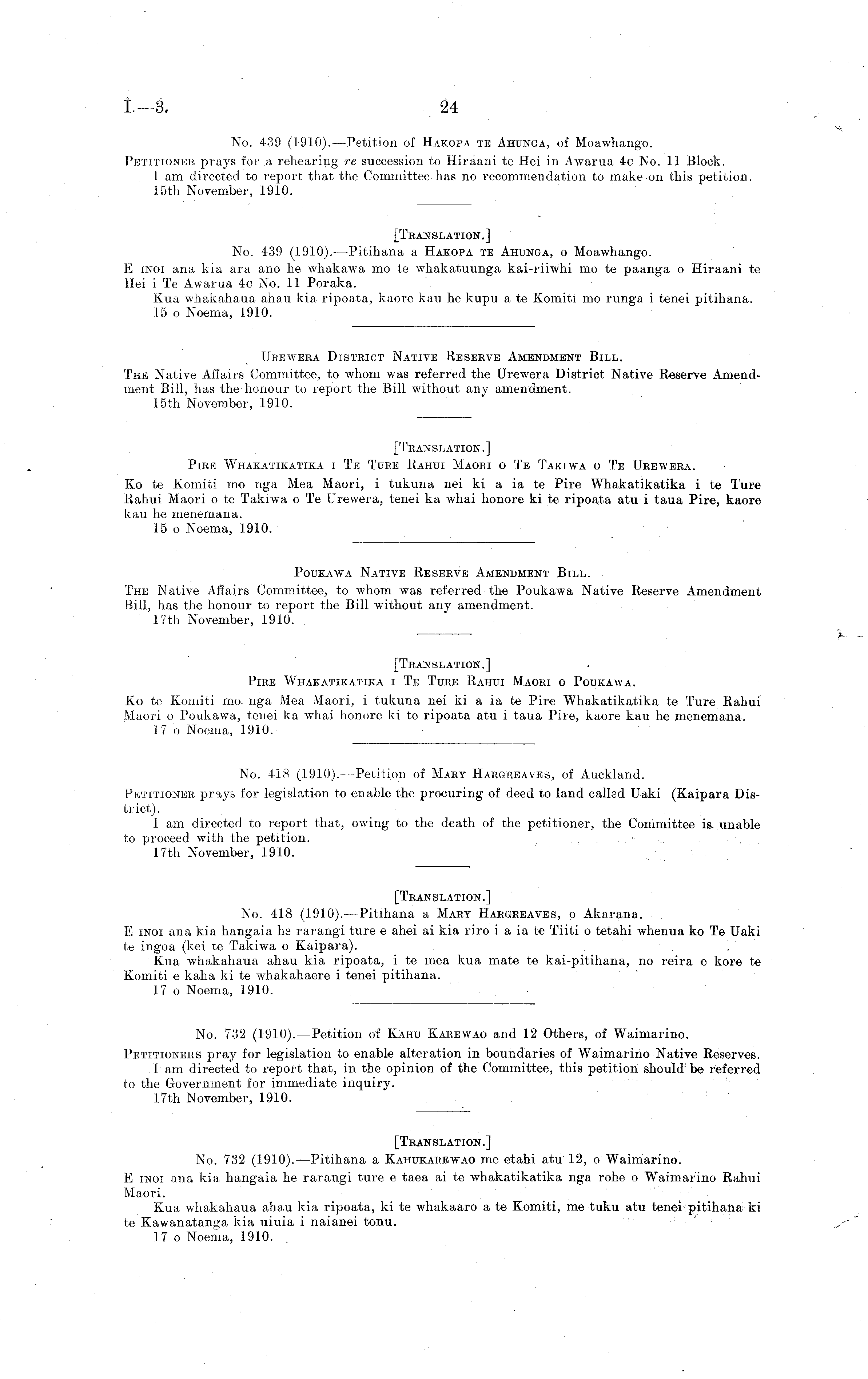 [Translation.] No. 439 (1910). —Pitihana a Hakopa te Ahunga, o Moawhango. E inoi ana kia ara ano he whakawa mo te whakatuunga kai-riiwhi mo te paanga o Hiraani te Hei i Te Awarua 4c No. 11 Poraka. Kua whakahaua ahau kia ripoata, kaore kau he kupu a te Komiti mo runga i tenei pitihana. 15 o Noema, 1910.