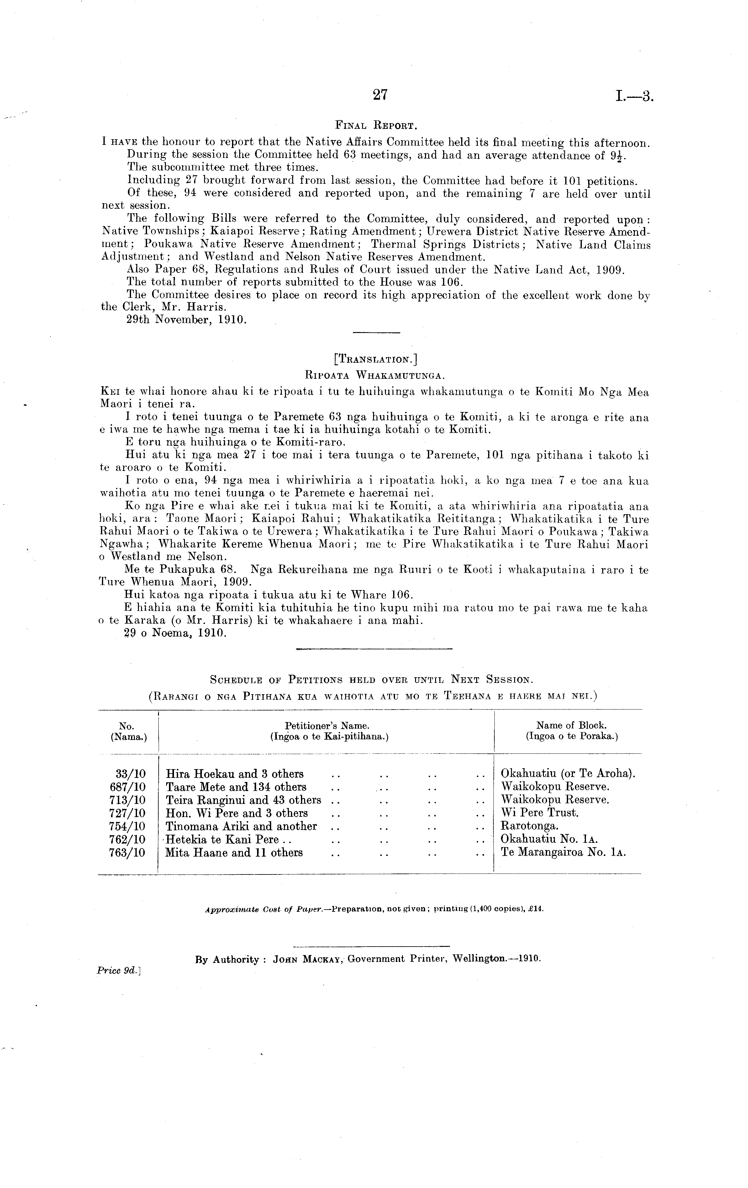 [Translation.] Ripoata Whakamutunga. Kei te whai honore ahau ki te ripoata i tu te huihuinga whakamutunga o te Komiti Mo Nga Mea Maori i tenei ra. I roto i tenei tuunga o te Paremete 63 nga huihuinga o te Komiti, a ki te aronga e rite ana e iwa me te hawhe nga mema i tae ki ia huihuinga kotahi o te Komiti. E toru nga huihuinga o te Komiti-raro. Hui atu ki nga mea 27 i toe mai i tera tuunga o te Paremete, 101 nga pitihana i takoto ki te aroaro o te Komiti. I roto o ena, 94 nga mea i whiriwhiria a i ripoatatia hoki, a ko nga mea 7 e toe ana kua waihotia atu mo tenei tuunga o te Paremete e haeremai nei. Ko nga Pire e whai ake r.ei i tukua mai ki te Komiti, a ata whiriwhiria ana ripoatatia ana hoki, ara : Taone Maori; Kaiapoi Rahui; Whakatikatika Reititanga ; Whakatikatika ite Ture Rahui Maori o te Takiwa o te Urewera; Whakatikatika i te Ture Rahui Maori o Poukawa; Takiwa Ngawha; Whakarite Kereme Whenua Maori; me te Pire Whakatikatika i te Ture Rahui Maori o Westland me Nelson. Me te Pukapuka 68. Nga Rekureihana me nga Ruuri ote Kooti i whakaputaina i raro ite Ture Whenua Maori, 1909. Hui katoa nga ripoata i tukua atu ki te Whare 106. E hiahia ana te Komiti kia tuhituhia he tino kupu mihi ma ratou mo te pai rawa me te kaha o te Karaka (o Mr. Harris) ki te whakahaere i ana mahi. 29 o Noema, 1910.