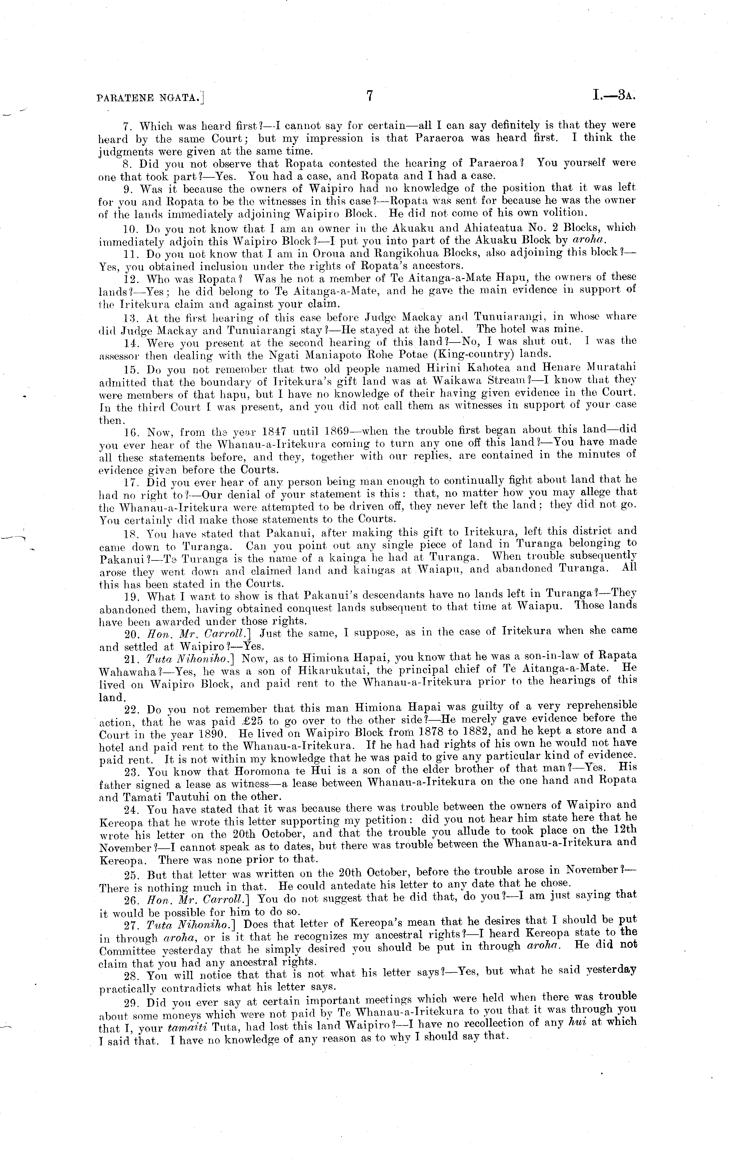 7. Which was heard first? —I cannot say for certain—all I can say definitely is that they were heard by the same Court; but my impression is that Paraeroa was heard first. I think the judgments were given at the same time. 8. Did you not observe that Ropata contested the hearing of Paraeroa? You yourself were one that took part?— Yes. You had a case, and Ropata and I had a case. 9. Was it because the owners of Waipiro had no knowledge of the position that it was left for you and Ropata to be the witnesses in this case?—Ropata was sent for because he was the owner of the lands immediately adjoining Waipiro Block. He did not come of his own volition. 10. Do you not know that I am an owner in the Akuaku and Ahiateatua No. 2 Blocks, which immediately'adjoin this Waipiro Block 2— I put you into part of the Akuaku Block by aroha. 11. Do you' not know that I am in Oroua and Rangikohua Blocks, also adjoining this block?— Yes, you obtained inclusion under the rights of Ropata's ancestors. 12. Who was Ropata? Was he not a member of Te Aitanga-a-Mate Hapu, the owners of these lands? —Yes; he did belong to Te Aitanga-a-Mate, and he gave the main evidence in support of the Iritekura claim and against your claim. 13. At the first hearing of this case before Judge Mackay and Tunuiarangi, in whose whare did Judge Mackay and Tunuiarangi stay?—He stayed at the hotel. The hotel was mine. 14. Were you present at the second hearing of this land? —No, I was shut out. 1 was the assessor then dealing with the Ngati Maniapoto Rohe Potae (King-country) lands. 15. Do you not remember that two old people named Hirini Kahotea and Henare Muratahi admitted that the boundary of Iritekura's gift land was at Waikawa Stream ? —I know that they were members of that hapu, but I have no knowledge of their having given evidence in the Court. In the third Court I was present, and you did not call them as witnesses in support of your case then. 16. Now, from the year 1847 until 1869— when the trouble first began about this land—did you ever hear of the Whanau-a-Iritekura coming to turn any one off this land?— You have made all these statements before, and they, together with our replies, arc contained in the minutes of evidence given before the Courts. 17. Did you ever hear of any person being man enough to continually fight about land that he had no right to ?—Our denial of'your statement is this : that, no matter how you may allege that the Whanau-a-Iritekura were attempted to be driven off, they never left the land; they did not go. You certainly did make those statements to the Courts. 18. You have stated that Pakanui, after making this gift to Iritekura, left this district and came down to Turanga. Can you point out any single piece of land in Turanga belonging to Pakanui?--T» Turanga is the name of a kainga he had at Turanga. When trouble subsequently arose they went down and claimed land and kaingas at Waiapu, and abandoned Turanga. All this has been stated in the Courts. 19. What I want to show is that Pakanui's descendants have no lands left in luranga?—ihey abandoned them, having obtained conquest lands subsequent to that time at Waiapu. Those lands have been awarded under those rights. 20. Hon. Mr. Carroll.] Just the same, I suppose, as in the case of Iritekura when she came and settled at Waipiro?—Yes. 21. Tuta Nihoniho.] Now, as to Himiona Hapai, you know that he was a son-in-law ot Kapata Wahawaha? —Yes, he was a son of Hikarukutai, the principal chief of Te Aitanga-a-Mate. He lived on Waipiro Block, and paid rent to the Whanau-a-Tritekura prior to the hearings of this land. ... 22. Do you not remember that this man Himiona Hapai was guilty of a very reprehensible action, that he was paid .£25 to go over to the other side?—He merely gave evidence before the Court in the year 1890. He lived on Waipiro Block from 1878 to 1882, and he kept a store and a hotel and paid rent to the Whauau-a-Iritekura. If he had had rights of his own he would not have paid rent. It is not within my knowledge that he was paid to give any particular kind of evidence. 23. You know that Horomona te Hui is a son of the elder brother of that man?— Yes. His father signed a lease as witness—a lease between Whanau-a-Iritekura on the one hand and Ropata and Tamati Tautuhi on the other. . . 24 You have stated that it was because there was trouble between the owners of Waipiro and Kereopa that he wrote this letter supporting my petition: did you not hear him state here that he wrote his letter on the 20th October, and that the trouble you allude to took place on the 12th November?—l cannot speak as to dates, but there was trouble between the Whanau-a-Iritekura and Kereopa. There was none prior to that. 25 But that letter was written on the 20th October, before the trouble arose in November?— There is nothing much in that. He could antedate his letter to any date that he chose. _ 26. Hon. Mr. Carroll.] You do not suggest that he did that, do you?—l am just saying that it would be possible for him to do so. 27 Tuta Nihoniho ] Does that letter of Kereopa's mean that he desires that 1 should be put in through aroha, or is it that he recognizes my ancestral rights?—l heard Kereopa state to the Committee yesterday that he simply desired you should be put in through aroha. He did not claim that you had any ancestral rights. +^j OT , 28. You will notice that that is not what his letter says?— Yes, but what he said yesterday practically contradicts what his letter says. 29 Did you ever say at certain important meetings which were held when there was trouble about'some moneys which were not paid by Te Whanau-a-Iritekura to you that it was through you that I, your tamaiti Tuta, had lost this land Waipiro?—l have no recollection of any hui at which I said'that. I have no knowledge of any reason as to why I should say that.