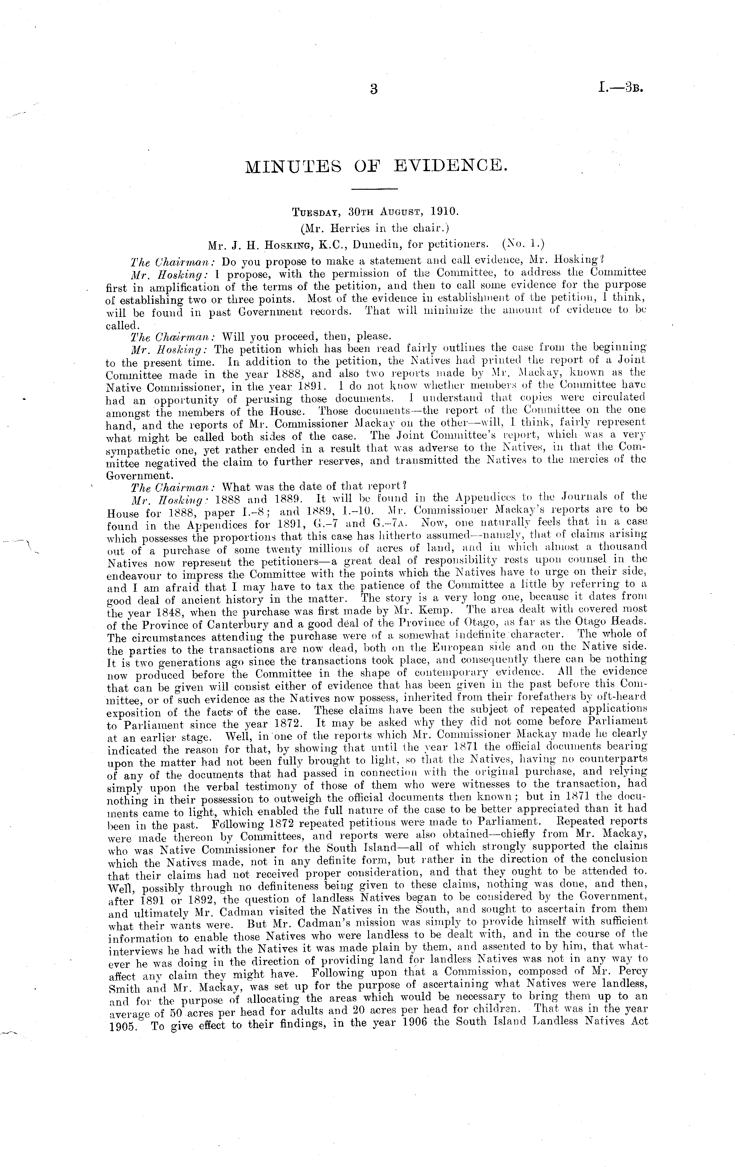 MINUTES OF EVIDENCE. Tuesday, 30th August, 1910. (Mr. Herries in the chair.) Mr. J. H. Hosking, K.C., Dunedin, for petitioners. (No. 1.) The Chairman: Do you propose to make a statement and call evidence, Mr. Hosking? Mr. Hosking: 1 propose, with the permission of the Committee, to address the Committee first in amplification of the terms of the petition, and then to call some evidence for the purpose of establishing two or three points. Most of the evidence in establishment of the petition, 1 think, will be found in past Government records. That will minimize the amount of evidence to be called. The Chairman: Will you proceed, then, please. Mr. Hosking: The petition which has been read fairly outlines the case from the beginning to the present time. In addition to the petition, the Natives had printed the report of a Joint Committee made in the year 1888, and also two reports made by Mr. Mackay, known as the Native Commissioner, in the. year 1891. 1 do not know whether members of the Committee have had an opportunity of perusing those documents. 1 understand that copies were circulated amongst the members of the House. Those documents—the report of the Committee on the one hand, and the reports of Mr. Commissioner Mackay on the other —will, 1 think, fairly represent what'might be called both sides of the case. The Joint Committee's report, which was a very sympathetic one, yet rather ended in a result that was adverse to the Natives, in that the Committee negatived the claim to further reserves, and transmitted the Natives to the mercies of the Government. The Chairman: What was the date of that report ? Mr. Hosking- 1888 and 1889. It will be found in the Appendices to the Journals of the House for 1888, paper 1.-8; and 1889, 1.-10. Mr. Commissioner Mackay's reports are to be found in the Appendices for 1891, G.-7 and G.-7a. Now, one naturally feels that in a case which possesses the proportions that this case has hitherto assumed.- -namely, that of claims arising out of a purchase of some twenty millions of acres of land, and in which almost a thousand Natives now represent the petitioners—a great deal of responsibility rests upon counsel in the endeavour to impress the Committee with the points which the Natives have to urge on their side, and I am afraid that I may have to tax the patience of the Committee a little by referring to a good deal of ancient history in the matter. The story is a very long one, because it dates from the year 1848, when the purchase was first made by Mr. Kemp. The area dealt with covered most of the Province of Canterbury and a good deal of the Province of Otago, as far as the Otago Heads. The circumstances attending the purchase were of a somewhat indefinite character. The whole of the parties to the transactions are now dead, both on the European side and on the Native side. It is two generations ago since the transactions took place, and consequently there can be nothing now produced before the Committee in the shape of contemporary evidence. All the evidence that can be given will consist either of evidence that has been given in the past before this Committee, or of such evidence as the Natives now possess, inherited from their forefathers by oft-heard exposition of the facts- of the case. These claims have been the subject of repeated applications to Parliament since the year 1872. It may be asked why they did not come before Parliament at an earlier stage. Well, in one of the reports which Mr. Commissioner Mackay made he clearly indicated the reason for that, by showing that until the year 1871 the official documents bearing upon the matter had not been fully brought to light, so that the Natives, having no counterparts of any of the documents that had passed in connection with the original purchase, and. relying simply upon the verbal testimony of those of them who were witnesses to the transaction, had nothing in their possession to outweigh the official documents then known; but in 1871 the documents came to light, which enabled the full nature of the case to be better appreciated than it had been in the past. Following 1872 repeated petitions were made to Parliament. Repeated reports were made thereon by Committees, and reports were also obtained—chiefly from Mr. Mackay, who was Native Commissioner for the South Island—all of which strongly supported the claims which the Natives made, not in any definite form, but rather in the direction of the conclusion that their claims had not received proper consideration, and that they ought to be attended to. Well, possibly through no definiteness being given to these claims, nothing was done, and then, after 1891 or 1892, the question of landless Natives began to be considered by the Government, and ultimately Mr. C adman visited the Natives in the South, and sought to ascertain from them what their wants were. But Mr. Cadman's mission was simply to provide himself with sufficient information to enable those Natives who were landless to be dealt with, and in the course of the interviews he had with the Natives it was made plain by them, and assented to by him, that whatever he was doing in the direction of providing land for landless Natives was not in any way to affect any claim they might have. Following upon that a Commission, composed of Mr. Percy Smith and Mr Mackay, was set up for the purpose of ascertaining what Natives were landless, 'and for the purpose of allocating the areas which would be necessary to bring them up to an average of 50 acres per head for adults and 20 acres per head for children. That was in the year 1905 To give effect to their findings, in the year 1906 the South Island Landless Natives Act