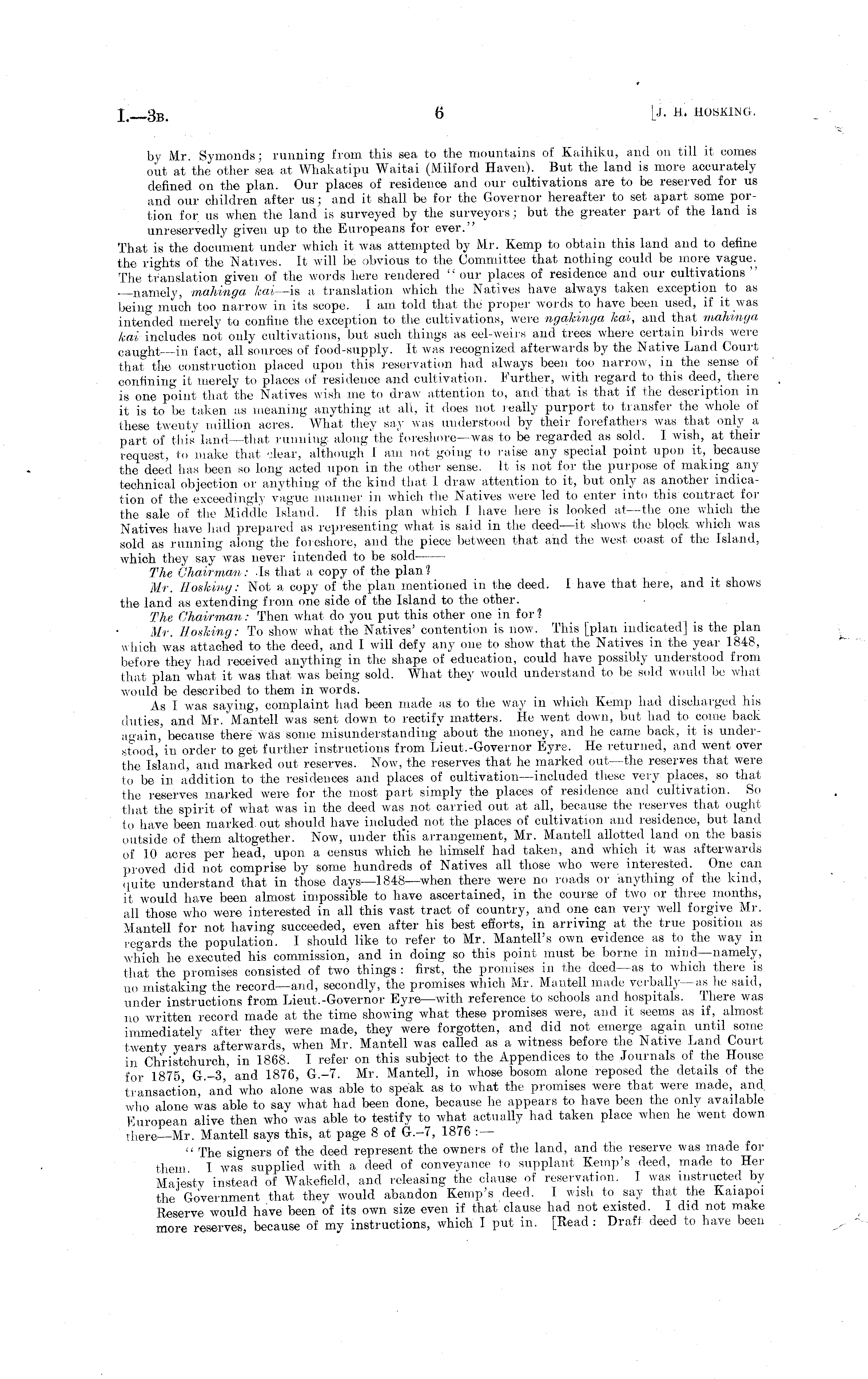 by Mr. Symonds; running from this sea to the mountains of Kaihiku, and on till it comes out at the other sea at Whakatipu Waitai (Milford Haven). But the land is more accuratelydefined on the plan. Our places of residence and our cultivations are to be reserved for us and our children after us ; and it shall be for the Governor hereafter to set apart some portion for us when the land is surveyed by the surveyors; but the greater part of the land is unreservedly given up to the Europeans for ever." That is the document under which it was attempted by Mr. Kemp to obtain this land and to define the rights of the Natives. It will be obvious to the Committee that nothing could be more vague. The translation given of the words here rendered " our places of residence and our cultivations " namely, mahinga kai —is a. translation which the Natives have always taken exception to as being much too narrow in. its scope. lam told that the proper words to have been used, if it was intended merely to confine the exception to the cultivations, were ngakinga kai, and that mahinga kai includes not only cultivations, but such things as eel-weirs and trees where certain birds were caught in fact, all sources of food-supply. It was recognized afterwards by the Native Land Court that the construction placed upon this reservation had always been too narrow, in the sense of confining it merely to places of residence and cultivation. Further, with regard to this deed, there is one point that the Natives wish me to draw attention to, and that is that if the description in it is to be taken as meaning anything at all, it does not really purport to transfer the whole of these twenty million acres. What they say was understood by their forefathers was that only a part of this land—that running, along the 'foreshore—was to be regarded as sold. I wish, at their request, to make that -dear, although I am not going to raise any special point upon it, because the deed has been so long acted upon in the other sense. It is not for the purpose of making any technical objection or anything of the kind that I draw attention to it, but only as another indication of the exceedingly vague manner in which the Natives were led to enter into this contract for the sale of the Middle Island. If this plan which 1 have here is looked at—the one which the Natives have had prepared as representing what is said in the deed —it shows the block which was sold as running along the foreshore, and the piece between that and the west coast of the Island, which, they say was never intended to be sold The Chairman: .Is that a. copy of the plan? Mr. Hosking: Not a copy of the plan mentioned in the deed. I have that here, and it shows the land as extending from one side of the Island to the other. The Chairman: Then what do you put this other one in for ? Mr. Hosking: To show what the Natives' contention is now. This [plan indicated] is the plan which was attached to the deed, and I will defy any one to show that the Natives in the year 1848, before they had received anything in the shape of education, could have possibly understood from that plan what it was that was being sold. What they would understand to be sold would be what would be described to them in words. As I was saying, complaint had been made as to the way in which Kemp had discharged his duties, and Mr. Mantell was sent down to rectify matters. He went down, but had to come back again,' because there was some misunderstanding about the money, and he came back, it is understood, in order to get further instructions from. Lieut.-Governor Eyre. He returned, and went over the Island, and marked out reserves. Now, the reserves that he marked out —the reserves that were to be in addition to the residences and places of cultivation—included these very so that the reserves marked were for the most part simply the places of residence and cultivation. So that the spirit of what was in the deed was not carried out at all, because the reserves that ought (o have been marked out should have included not the places of cultivation and residence, but land outside of them altogether. Now, under this arrangement, Mr. Mantell allotted land on the basis of 10 acres per head, upon a census which he himself had taken, and which it was afterwards proved did not comprise by some hundreds of Natives all those who were interested. One can quite understand that in those days —1848—when there were no roads or anything of the kind, it would have been almost impossible to have ascertained, in the course of two or three months, all those who were interested in all this vast tract of country, and one can very well forgive Mr. Mantell for not having succeeded, even after his best efforts, in arriving at the true position as regards the population. I should like to refer to Mr. Mantell's own evidence as to the way in winch he executed his commission, and in doing so this point must be borne in mind—namely, that the promises consisted of two things : first, the promises in the deed—as to which there_ is no mistaking the record—and, secondly, the promises which Mr. Mantell made verbally—as lie said, under instructions from Lieut.-Governor Eyre—with reference to schools and hospitals. There was no written record made at the time showing what these promises were, and it seems as if, almost immediately after they were made, they were forgotten, and did not emerge again until some twenty years afterwards, when Mr. Mantell was called as a witness before the Native Land Court in Christchurch, in 1868. I refer on this subject to the Appendices to the Journals of the House for 1875 G.-3, and 1876, G.-7. Mr. Mantell, in whose bosom alone reposed the details of the transaction and who alone was able to speak as to what the promises were that were made, and. who alone was able to say what had been done, because he appears to have been the only available European alive then who was able to testify to w