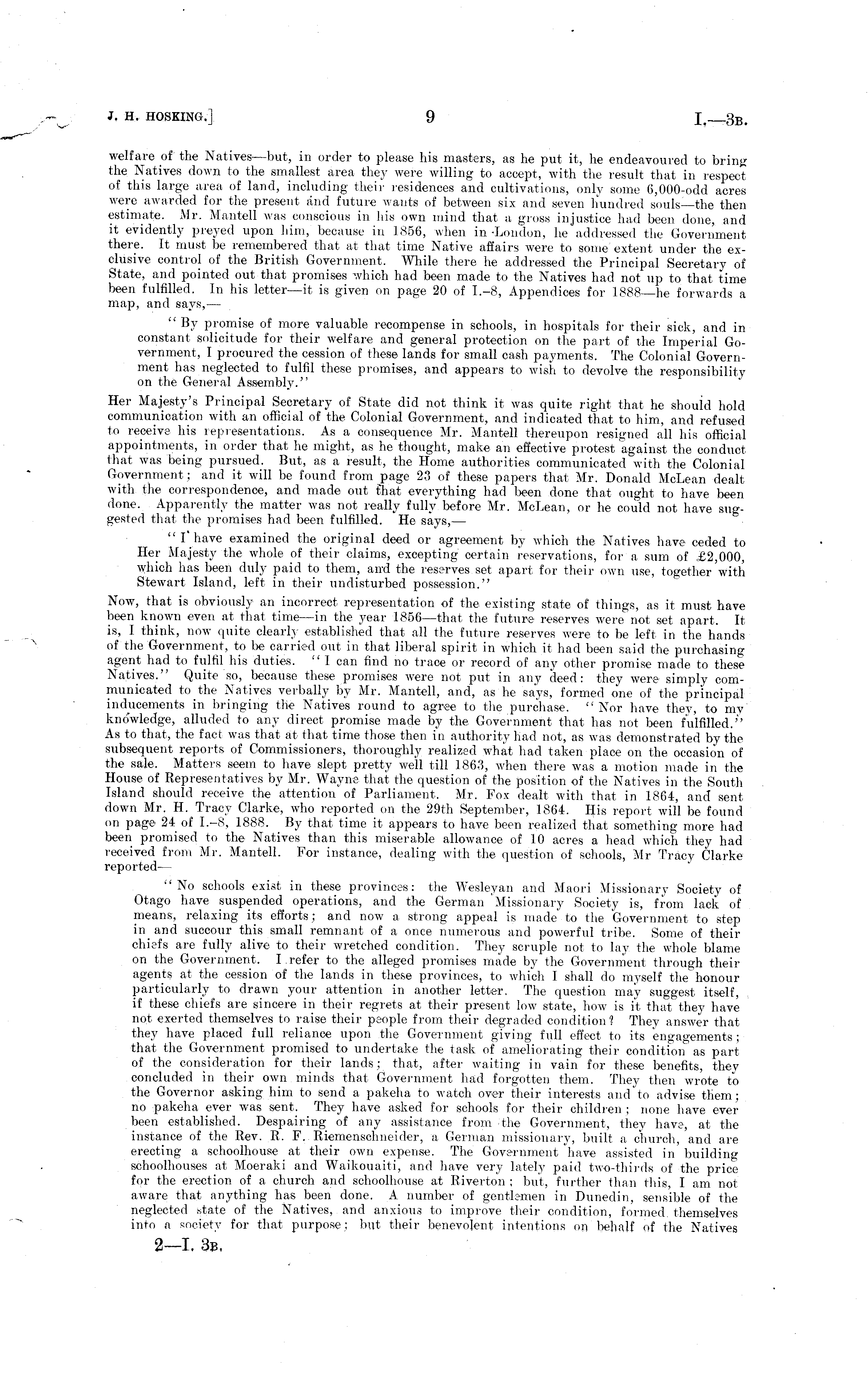 welfare of the Natives—but, in order to please his masters, as he put it, he endeavoured to bring the Natives down to the smallest area they were willing to accept, with the result that in respect of this large area of land, including their residences and cultivations, only some 6,000-odd acres were awarded for the present and future wants of between six and seven hundred souls—the then estimate. Mr. Mantell was conscious in his own mind that a gross injustice had been done, and it evidently preyed upon him, because in 1856, when in -London, he addressed the Government there. It must be remembered that at that time Native affairs were to some extent under the exclusive control of the British Government. While there he addressed the Principal Secretary of State, and pointed out that promises which had been made to the Natives had not up to that time been fulfilled. In his letter —it is given on page 20 of 1.-8, Appendices for 1888—he forwards a map, and says,— " By promise of more valuable recompense in schools, in hospitals for their sick, and in constant solicitude for their welfare and general protection on the part of the Imperial Government, I procured the cession of these lands for small cash payments. The Colonial Government has neglected to fulfil these promises, and appears to wish to devolve the responsibility on the General Assembly." Her Majesty's Principal Secretary of State did not think it was quite right that he should hold communication with an official of the Colonial Government, and indicated that to him, and refused to receive his representations. As a consequence Mr. Mantell thereupon resigned all his official appointments, in order that he might, as he thought, make an effective protest against the conduct that was being pursued. But, as a result, the Home authorities communicated with the Colonial Government; and it will be found from page 23 of these papers that Mr. Donald McLean dealt with the correspondence, and made out Chat everything had been done that ought to have been done. Apparently the matter was not really fully before Mr. McLean, or he could not have suggested that the promises had been fulfilled. He says,— "I have examined the original deed or agreement by which the Natives have ceded to Her Majesty the whole of their claims, excepting certain reservations, for a sum of £2,000, which has been duly paid to them, and the reserves set apart for their own use, together with Stewart Island, left in their undisturbed possession." Now, that is obviously an incorrect representation of the existing state of things, as it must have been known even at that time—in the year 1856—that the future reserves were not set apart. It is, I think, now quite clearly established that all the future reserves were to be left in the hands of the Government, to be carried out in that liberal spirit in which it had been said the purchasing agent had to fulfil his duties. " I can find no trace or record of any other promise made to these Natives." Quite so, because these promises were not put in any deed: they were simply communicated to the Natives verbally by Mr. Mantell, and, as he says, formed one of the principal inducements in bringing the Natives round to agree to the purchase. "Nor have they, to mv knowledge, alluded to any direct promise made by the Government that has not been fulfilled." As to that, the fact was that at that time those then in authority had not, as was demonstrated by the subsequent reports of Commissioners, thoroughly realized what had taken place on the occasion of the sale. Matters seem to have slept pretty well till 1863, when there was a motion made in the House of Representatives by Mr. Wayne that the question of the position of the Natives in the South Island should receive the attention of Parliament. Mr. Fox dealt with that in 1864, and sent down Mr. H. Tracy Clarke, who reported on the 29th September, 1864. His report will be found on page 24 of 1.-8, 1888. By that time it appears to have been realized that something more had been promised to the Natives than this miserable allowance of 10 acres a head which they had received from Mr. Mantell. For instance, dealing with the question of schools, Mr Tracy Clarke reported— "No schools exist in these provinces: the Wesleyan and Maori Missionary Society of Otago have suspended operations, and the German Missionary Society is, from lack of means, relaxing its efforts; and now a strong appeal is made' to the Government to step in and succour this small remnant of a once numerous and powerful tribe. Some of their chiefs are fully alive to their wretched condition. They scruple not to lay the whole blame on the Government. I refer to the alleged promises made by the Government through their agents at the cession of the lands in these provinces, to which I shall do myself the honour particularly to drawn your attention in another letter. The question may suggest itself, if these chiefs are sincere in their regrets at their present low state, how is it that they have not exerted themselves to raise their people from their degraded condition? They answer that they have placed full reliance upon the Government giving full effect to its engagements ; that the Government promised to undertake the task of ameliorating their condition" as part of the consideration for their lands; that, after waiting in vain for these benefits, they concluded in their own minds that Government had forgotten them. They then wrote to the Governor asking him to send a pakeha to watch over their interests and to advise them; no pakeha ever was sent. They have asked for schools for their children ; none have ever been established. Despairing of any assistance from the Government, they have, at the instance of the Rev. R. F. Riemenschneider, a German missionary, built a church, and are erecting a schoolhouse at their own expense. The Government have assisted in building schoolhouses at Moeraki and Waikouaiti, and