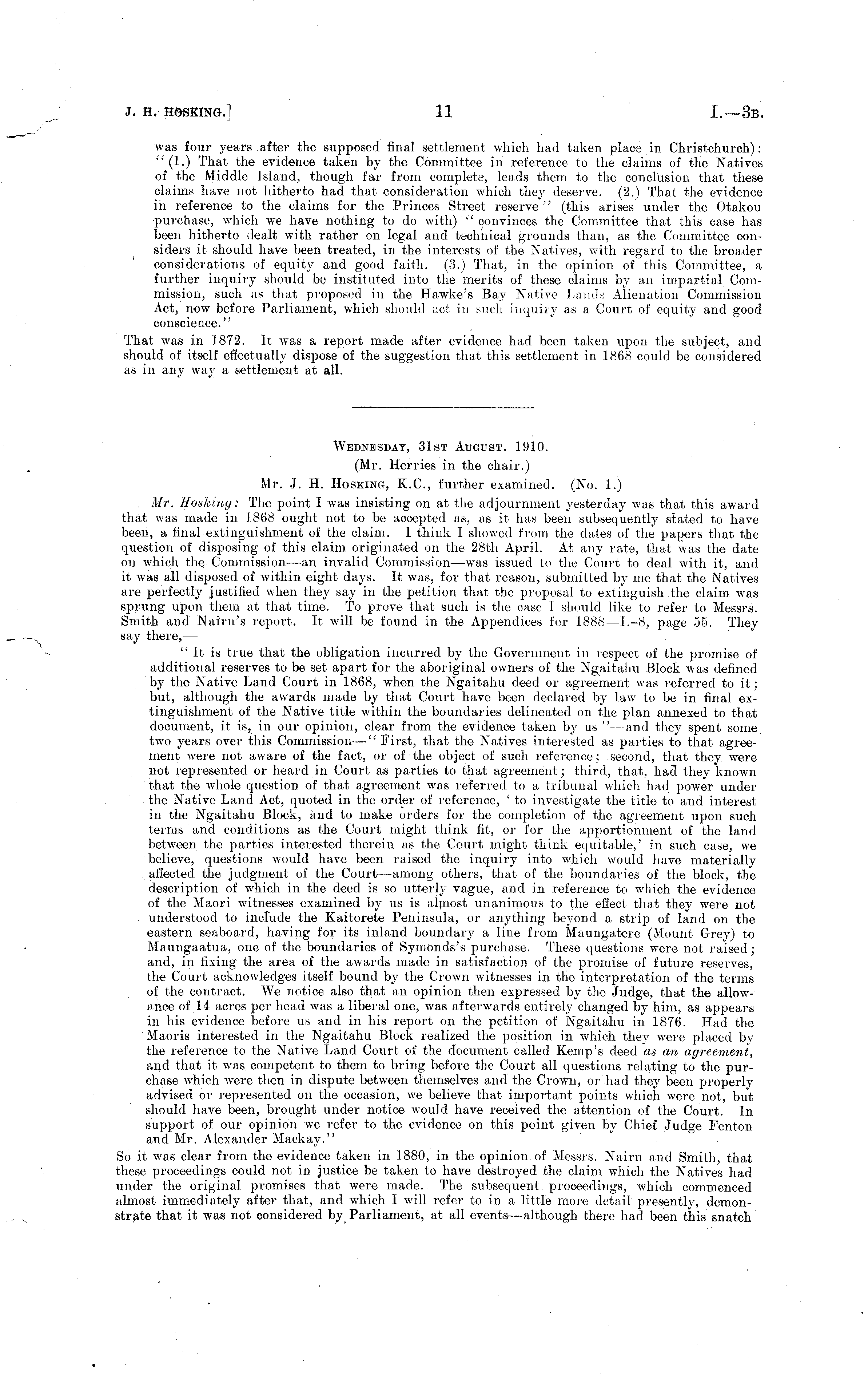 Wednesday, 31st August. 1910. (Mr. Herries in the chair.) Mr. J. H. Hosking, K.C., further examined. (No. 1.) Mr. Honking: The point I was insisting on at the adjournment yesterday was that this award that was made in 1868 ought not to be accepted as, as it lias been subsequently stated to have been, a final extinguishment of the claim. I think I showed from the dates of the papers that the question of disposing of this claim originated on the 28th April. At any rate, that was the date on which the Commission—an invalid Commission—was issued to the Court to deal with it, and it was all disposed of within eight days. It was, for that reason, submitted by me that the Natives are perfectly justified when they say in the petition that the proposal to extinguish the claim was sprung upon them at that time. To prove that such is the case I should like to refer to Messrs. Smith and Nairn's report. It will be found in the Appendices for 1888—1.-8, page 55. They say there, — " It is true that the obligation incurred by the Government in respect of the promise of additional reserves to be set apart for the aboriginal owners of the Ngaitahu Block was defined by the Native Land Court in 1868, when the Ngaitahu deed or agreement was referred to it; but, although the awards made by that Court have been declared by law to be in final extinguishment of the Native title within the boundaries delineated on the plan annexed to that document, it is, in our opinion, clear from the evidence taken by us " —and they spent some two years over this Commission —" First, that the Natives interested as parties to that agreement were not aware of the fact, or of the object of such reference; second, that they were not represented or heard in Court as parties to that agreement; third, that, ha 3 they known that the whole question of that agreement was referred to a tribunal which had power under the Native Land Act, quoted in the order of reference, ' to investigate the title to and interest in the Ngaitahu Block, and to make orders for the completion of the agreement upon such terms and conditions as the Court might think fit, or for the apportionment of the land between the parties interested therein as the Court might think equitable,' in such case, we believe, questions would have been raised the inquiry into which would have materially affected the judgment of the Court—among others, that of the boundaries of the block, the description of which in the deed is so utterly vague, and in reference to which the evidence of the Maori witnesses examined by us is almost unanimous to the effect that they were not . understood to include the Kaitorete Peninsula, or anything beyond a strip of land on the eastern seaboard, having for its inland boundary a line from Maungatere (Mount Grey) to Maungaatua, one of the boundaries of Symonds's purchase. These questions were not raised; and, in fixing the area of the awards made in satisfaction of the promise of future reserves, the Court acknowledges itself bound by the Crown witnesses in the interpretation of the terms of the contract. We notice also that an opinion then expressed by the Judge, that the allowance of 14 acres per head was a liberal one, was afterwards entirely changed by him, as appears in his evidence before us and in his report on the petition of Ngaitahu in 1876. Had the Maoris interested in the Ngaitahu Block realized the position in which they were placed by the reference to the Native Land Court of the document called Kemp's deed as an agreement, and that it was competent to them to bring before the Court all questions relating to the purchase which were then in dispute between themselves and the Crown, or had they been properly advised or represented on the occasion, we believe that important points which were not, but should have been, brought under notice would have received the attention of the Court. In support of our opinion we refer to the evidence on this point given by Chief Judge Fenton and Mr. Alexander Mackay." So it was clear from the evidence taken in 1880, in the opinion of Messrs. Nairn and Smith, that these proceedings could not in justice be taken to have destroyed the claim which the Natives had under the original promises that were made. The subsequent proceedings, which commenced almost immediately after that, and which I will refer to in a little more detail presently, demonstrate that it was not considered by Parliament, at all events—although there had been this snatch