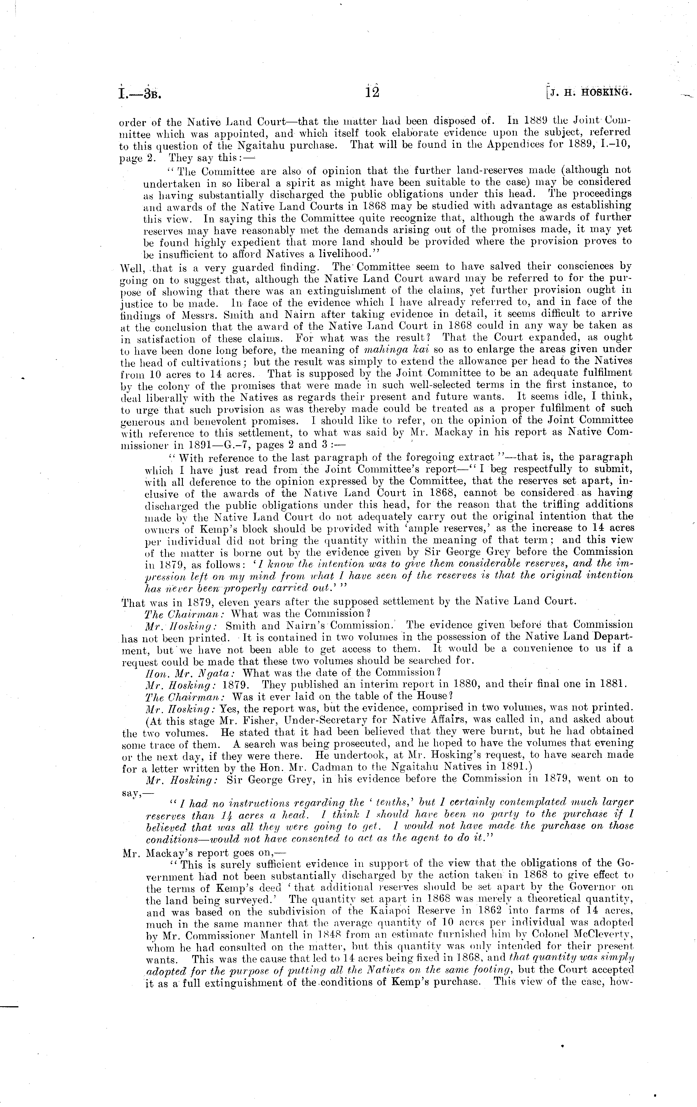 order of the Native Land Court —that the matter had been disposed of. In 1889 the Joint Committee which was appointed, and which itself took elaborate evidence upon the subject, referred to this question of the Ngaitahu purchase. That will be found in the Appendices for 1889, 1.-10, page 2. They say this: — " The Committee are also of opinion that the further land-reserves made (although not undertaken in so liberal a spirit as might have been suitable to the case) may be considered as having substantially discharged the public obligations under this head. The proceedings and awards of the Native Land Courts in 1868 may be studied with advantage as establishing this view. In saying this the Committee quite recognize that, although the awards of further reserves may have reasonably met the demands arising out of the promises made, it may yet be found highly expedient that more land should be provided where the provision proves to be insufficient to afford Natives a livelihood." Well, that is a very guarded finding. The Committee seem to have salved their consciences by going on to suggest that, although the Native Land Court award may be referred to for the purpose of showing that there was an extinguishment of the claims, yet further provision ought in justice to be made. In face of the evidence which I have already referred to, and in face of the findings of Messrs. Smith and Nairn after taking evidence in detail, it seems difficult to arrive at the conclusion that the award of the Native Land Court in 1868 could in any way be taken as in satisfaction of these claims. For what was the result? That the Court expanded, as ought to have been done long before, the meaning of mahinga kai so as to enlarge the areas given under the head of cultivations; but the result was simply to extend the allowance per head to the Natives from 10 acres to 14 acres. That is supposed by the Joint Committee to be an adequate fulfilment by the colony of the promises that were made in such well-selected terms in the first instance, to deal liberally with the Natives as regards their present and future wants. It seems idle, I think, to urge that such provision as was thereby made could be treated as a proper fulfilment of such generous and benevolent promises. I should like to refer, on the opinion of the Joint Committee with reference to this settlement, to what was said by Mr. Mackay in his report as Native Commissioner in 1891 —G.-7, pages 2 and 3 : — " With reference to the last paragraph of the foregoing extract " —that is, the paragraph which 1 have just read from the Joint Committee's report —"I beg respectfully to submit, with all deference to the opinion expressed by the Committee, that the reserves set apart, inclusive of the awards of the Native Land Court in 1868, cannot be considered as having discharged the public obligations under this head, for the reason that the trifling additions made by the Native Land Court do not adequately carry out the original intention that the owners of Kemp's block should be provided with 'ample reserves,' as the increase to 14 acres per individual did not bring the quantity within the meaning of that term; and this view of the matter is borne out by the evidence given by Sir George Grey before the Commission in 1879, as follows: '/ know the intention was to give them considerable reserves, and the impression left on my mind, from what I have seen of the reserves is that the original intention has never been properly carried out. , " That was in 1879, eleven years after the supposed settlement by the Native Land Court. The Chairman: What was the Commission ? Mr. llasking: Smith and Nairn's Commission. The evidence given before that Commission has not been printed. It is contained in two volumes in the possession of the Native Land Department, but we have not been able to get access to them. It would be a convenience to us if a request could be made that these two volumes should be searched for. Hon. Mr. Ngata: What was the date of the Commission? Mr. Hosking: 1879. They published an interim report in 1880, and their final one in 1881. The Chairman: Was it ever laid on the table of the House? Mr. Hosking: Yes, the report was, but the evidence, comprised in two volumes, was not printed. (At this stage Mr. Fisher, Under-Secretary for Native Affairs, was called in, and asked about the two volumes. He stated that it had been believed that they were burnt, but he had obtained some trace of them. A search was being prosecuted, and he hoped to have the volumes that evening or the next day, if they were there. He undertook, at Mr. Hosking's request, to have search made for a letter written by "the Hon. Mr. Cadman to the Ngaitahu Natives in 1891.) Mr. Hosking: Sir George Grey, in his evidence before the Commission in 1879, went on to say, — " / had no instructions regarding the ' tenths,' but I certainly contemplated much larger reserves than l! f acres a head. 1 think I should have been no party to the purchase if I believed that was all they were going to get. I would not have made the purchase on those conditions — woidd not have consented to act as the agent to do it. ,, Mr. Mackay's report goes on, — "This is surely sufficient evidence in support of the view that the obligations of the Government had not been substantially discharged by the action taken in 1868 to give effect to the terms of Kemp's deed ' that additional reserves should be set apart by the Governor on the land being surveyed.' The quantity set apart in 1868 was merely a theoretical quantity, and was based on the subdivision of the Kaiapoi Reserve in 1862 into farms of 14 acres, much in the same manner that the average quantity of 10 acres per individual was adopted by Mr. Commissioner Mantell in 1848 from an estimate furnished him by Colonel McCleverty, whom he had consulted on the matter, but this quantity was only intended for their present wants. This was the cause that led to 14 acres