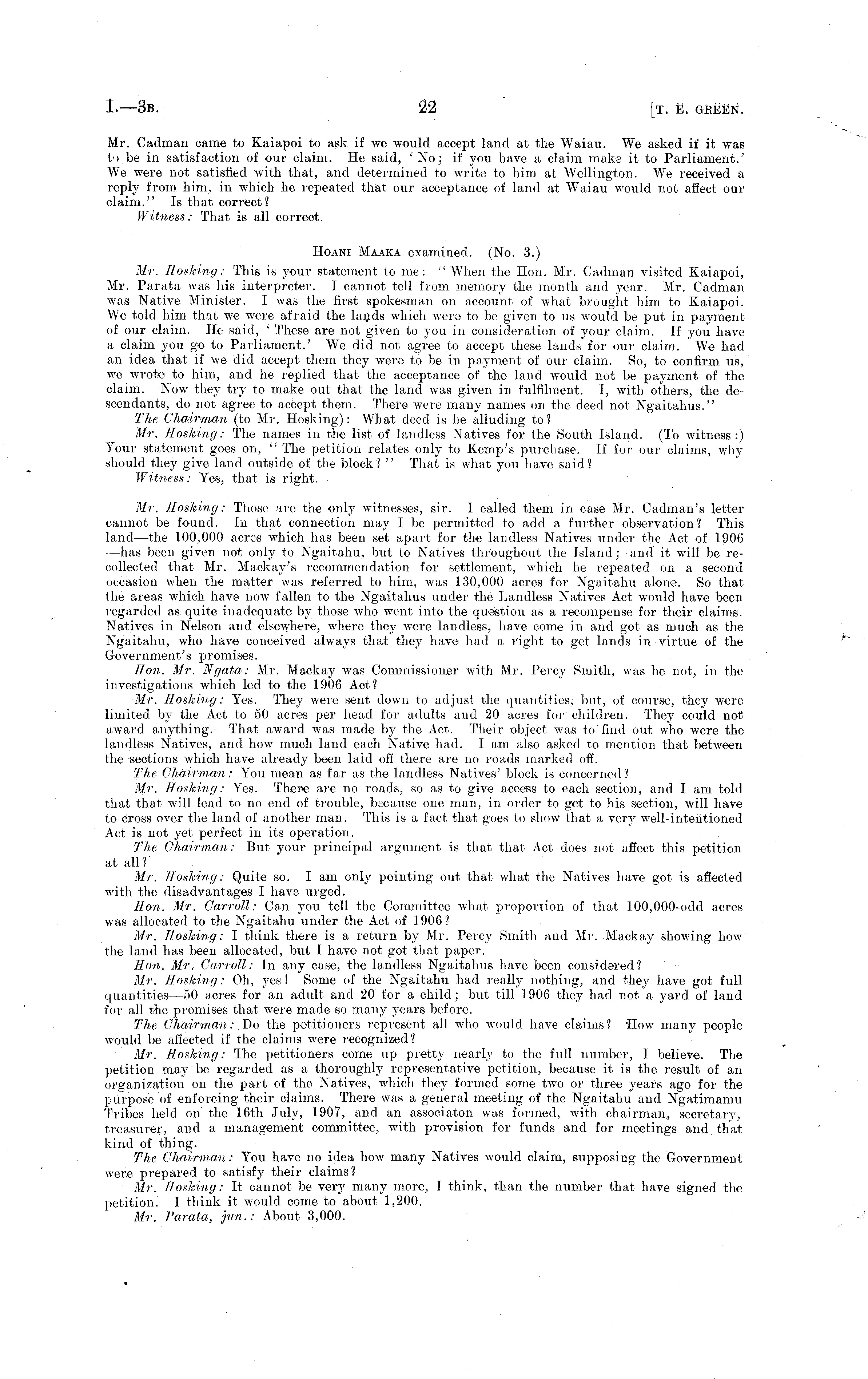 Mr. Cadman came to Kaiapoi to ask if we would accept land at the Waiau. We asked if it was to be in satisfaction of our claim. He said, ' No; if you have a claim make it to Parliament.' We were not satisfied with that, and determined to write to him at Wellington. We received a reply from him, in which he repeated that our acceptance of land at Waiau would not affect our claim." Is that correct? Witness: That is all correct. Hoani Maaka examined. (No. 3.) Mr. llasking: This is your statement to me: "When the Hon. Mr. Cadman visited Kaiapoi, Mr. Parata was his interpreter. 1 cannot tell from memory the month and year. Mr. Cadman was Native Minister. I was the first spokesman on account of what brought him to Kaiapoi. We told him that we were afraid the lands which were to be given to us would be put in payment of our claim. He said, ' These are not given to you in consideration of your claim. If you have a claim you go to Parliament.' We did not agree to accept these lands for our claim. We had an idea that if we did accept them they were to be in payment of our claim. So, to confirm us, we wrote to him, and he replied that the acceptance of the land would not be payment of the claim. Now they try to make out that the land was given in fulfilment. I, with others, the descendants, do not agree to accept them. There were many names on the deed not Ngaitahus." The Chairnwn (to Mr. Hosking): What deed is he alluding to? Mr. Hosking: The names in the list of landless Natives for the South Island. (To witness:) Your statement goes on, " The petition relates only to Kemp's purchase. If for our claims, why should they give land outside of the block? " That is what you have said? Witness: Yes, that is right. Mr. Hosking: Those are the only witnesses, sir. I called them in case Mr. Cadman's letter cannot be found. In that connection may I be permitted to add a further observation? This land —the 100,000 acres which has been set apart for the landless Natives under the Act of 1906 —has been given not only to Ngaitahu, but to Natives throughout the Island ; and it will be recollected that Mr. Mackay's recommendation for settlement, which he repeated on a second occasiou when the matter was referred to him, was 130,000 acres for Ngaitahu alone. So that the areas which have now fallen to the Ngaitahus under the Landless Natives Act would have been regarded as. quite inadequate by those who went into the question as a recompense for their claims. Natives in Nelson and elsewhere, where they were landless, have come in and got as much as the Ngaitahu, who have conceived always that they have had a right to get lands in virtue of the Government's promises. Hon. Mr. Ngata: Mr. Mackay was Commissioner with Mr. Percy Smith, was he not, in the investigations which led to the 1906 Act? Mr. Hosking: Yes. They were sent down to adjust the quantities, but, of course, they were limited by the Act to 50 acres per head for adults and 20 acres for children. They could not award anything. That award was made by the Act. Their object was to find out who were the landless Natives, and how much land each Native had. lam also asked to mention that between the sections which have already been laid off there are no roads marked off. The Chairman : You mean as far as the landless Natives' block is concerned ? Mr. Hosking: Yes. There are no roads, so as to give access to each section, and I am told that that will lead to no end of trouble, because one man, in order to get to his section, will have to cross over the land of another man. This is a fact that goes to show that a very well-intentioned Act is not yet perfect in its operation. The Chairman: But your principal argument is that that Act does not affect this petition at all? Mr. Hosking: Quite so. I am only pointing out that what the Natives have got is affected with the disadvantages I have urged. Hon. Mr. Carroll: Can you tell the Committee what proportion of that 100,000-odd acres was allocated to the Ngaitahu under the Act of 1906? Mr. Hosking: I think there is a return by Mr. Percy Smith and Mr. Mackay showing how the land has been allocated, but I have not got that paper. Hon. Mr. Carroll: In any case, the landless Ngaitahus have been considered? Mr. Hosking: Oh, yes! Some of the Ngaitahu had really nothing, and they have got full quantities —50 acres for an adult and 20 for a child; but till 1906 they had not a yard of land for all the promises that were made so many years before. The Chairman: Do the petitioners represent all who would have claims? How many people would be affected if the claims were recognized? Mr. Hosking: The petitioners come up pretty nearly to the full number, I believe. The petition may be regarded as a thoroughly representative petition, because it is the result of an organization on the part of the Natives, which they formed some two or three years ago for the purpose of enforcing their claims. There was a general meeting of the Ngaitahu and Ngatimamu Tribes held on the 16th July, 1907, and an associaton was formed, with chairman, secretary, treasurer, and a management committee, with provision for funds and for meetings and that kind of thing. The Chairman: You have no idea how many Natives would claim, supposing the Government were prepared to satisfy their claims? Mr. Hoiking: It cannot be very many more, I think, than the number that have signed the petition. I think it would come to about 1,200. Mr. Parata, jim.: About 3,000.