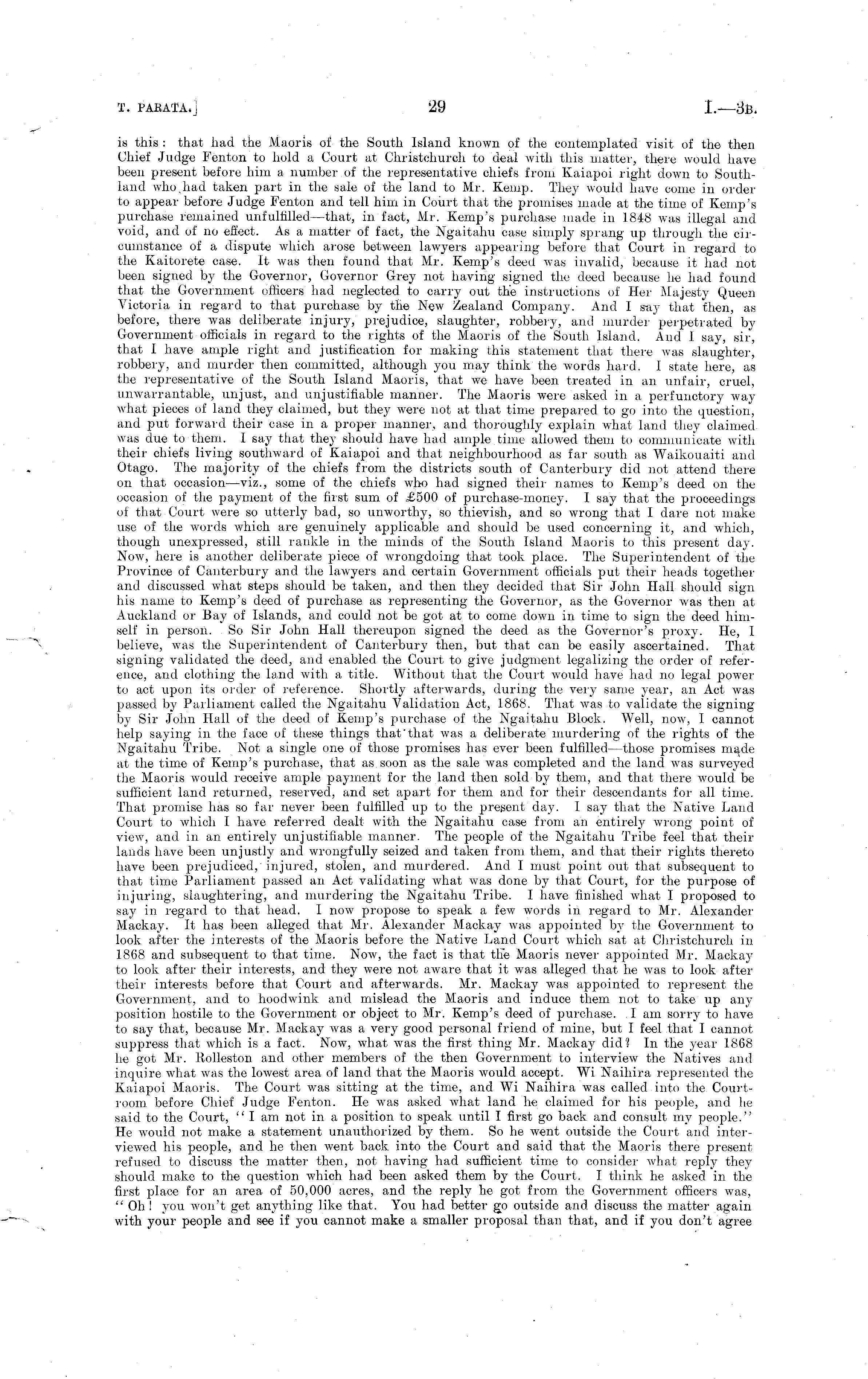 is this : that had the Maoris of the South Island known of the contemplated visit of the then Chief Judge Fenton to hold a Court at Christchurch to deal with this matter, there would have been present before him a number of the representative chiefs from Kaiapoi right down to Southland who had taken part in the sale of the land to Mr. Kemp. They would have come in order to appear before Judge Fenton and tell him in Court that the promises made at the time of Kemp's purchase remained unfulfilled —that, in fact, Mr. Kemp's purchase made in 1848 was illegal and void, and of no effect. As a matter of fact, the Ngaitahu case simply sprang up through the circumstance of a dispute which arose between lawyers appearing before that Court in regard to the Kaitorete case. It was then found that Mr. Kemp's deed was invalid, because it had not been signed by the Governor, Governor Grey not having signed the deed because he had found that the Government officers had neglected to carry out the instructions of Her Majesty Queen Victoria in regard to that purchase by the New Zealand Company. And I say that then, as before, there was deliberate injury, prejudice, slaughter, robbery, and murder perpetrated by Government officials in regard to the rights of the Maoris of the South Island. And I say, sir, that I have ample right and justification for making this statement that there was slaughter, robbery, and murder then committed, although you may think the words hard. I state here, as the representative of the South Island Maoris, that we have been treated in an unfair, cruel, unwarrantable, unjust, and unjustifiable manner. The Maoris were asked in a perfunctory way what pieces of land they claimed, but they were not at that time prepared to go into the question, and put forward their case in a proper manner, and thoroughly explain what land they claimed was due to them. I say that they should have had ample time allowed them to communicate with their chiefs living southward of Kaiapoi and that neighbourhood as far south as Waikouaiti and Otago. The majority of the chiefs from the districts south of Canterbury did not attend there on that occasion—viz., some of the chiefs who had signed their names to Kemp's deed on the occasion of the payment of the first sum of £500 of purchase-money. I say that the proceedings of that Court were so utterly bad, so unworthy, so thievish, and so wrong that I dare not make use of the words which are genuinely applicable and should be used concerning it, and which, though unexpressed, still rankle in the minds of the South Island Maoris to this present day. Now, here is another deliberate piece of wrongdoing that took place. The Superintendent of the Province of Canterbury and the lawyers and certain Government officials put their heads together and discussed what steps should be taken, and then they decided that Sir John Hall should sign his name to Kemp's deed of purchase as representing the Governor, as the Governor was then at Auckland or Bay of Islands, and could not be got at to come down in time to sign the deed himself in person. So Sir John Hall thereupon signed the deed as the Governor's proxy. He, I believe, was the Superintendent of Canterbury then, but that can be easily ascertained. That signing validated the deed, and enabled the Court to give judgment legalizing the order of reference, and clothing the land with a title. Without that the Court would have had no legal power to act upon its order of reference. Shortly afterwards, during the ver_y same year, an Act was passed by Parliament called the Ngaitahu Validation Act, 1868. That was to validate the signing by Sir John Hall of the deed of Kemp's purchase of the Ngaitahu Block. Well, now, I cannot help saying in the face of these things that'that was a deliberate murdering of the rights of the Ngaitahu Tribe. Not a single one of those promises has ever been fulfilled —those promises made at the time of Kemp's purchase, that as soon as the sale was completed and the land was surveyed the Maoris would receive ample payment for the land then sold by them, and that there would be sufficient land returned, reserved, and set apart for them and for their descendants for all time. That promise has so far never been fulfilled up to the present day. I say that the Native Land Court to which I have referred dealt with the Ngaitahu case from an entirely wrong point of view, and in an entirely unjustifiable manner. The people of the Ngaitahu Tribe feel that their lauds have been unjustly and wrongfully seized and taken from them, and that their rights thereto have been prejudiced, injured, stolen, and murdered. And I must point out that subsequent to that time Parliament passed an Act validating what was done by that Court, for the purpose of injuring, slaughtering, and murdering the Ngaitahu Tribe. I have finished what I proposed to say in regard to that head. I now propose to speak a few words in regard to Mr. Alexander Mackay. It has been alleged that Mr. Alexander Mackay was appointed by the Government to look after the interests of the Maoris before the Native Land Court which sat at Christchurch in 1868 and subsequent to that time. Noyv, the fact is that the Maoris never appointed Mr. Mackay to look after their interests, and they were not awaie that it was alleged that he was to look after their interests before that Court and afterwards. Mr. Mackay was appointed to represent the Government, and to hoodwink and mislead the Maoris and induce them not to take up any position hostile to the Government or object to Mr. Kemp's deed of purchase. I am sorry to have to say that, because Mr. Mackay was a very good personal friend of mine, but I feel that I cannot suppress that which is a fact. Now, what was the first thing Mr. Mackay did? In the year 1868 he got Mr. Rolleston and other members of the then Government to interview the Natives and inquire what was the lowest area of land that the Maoris would accep