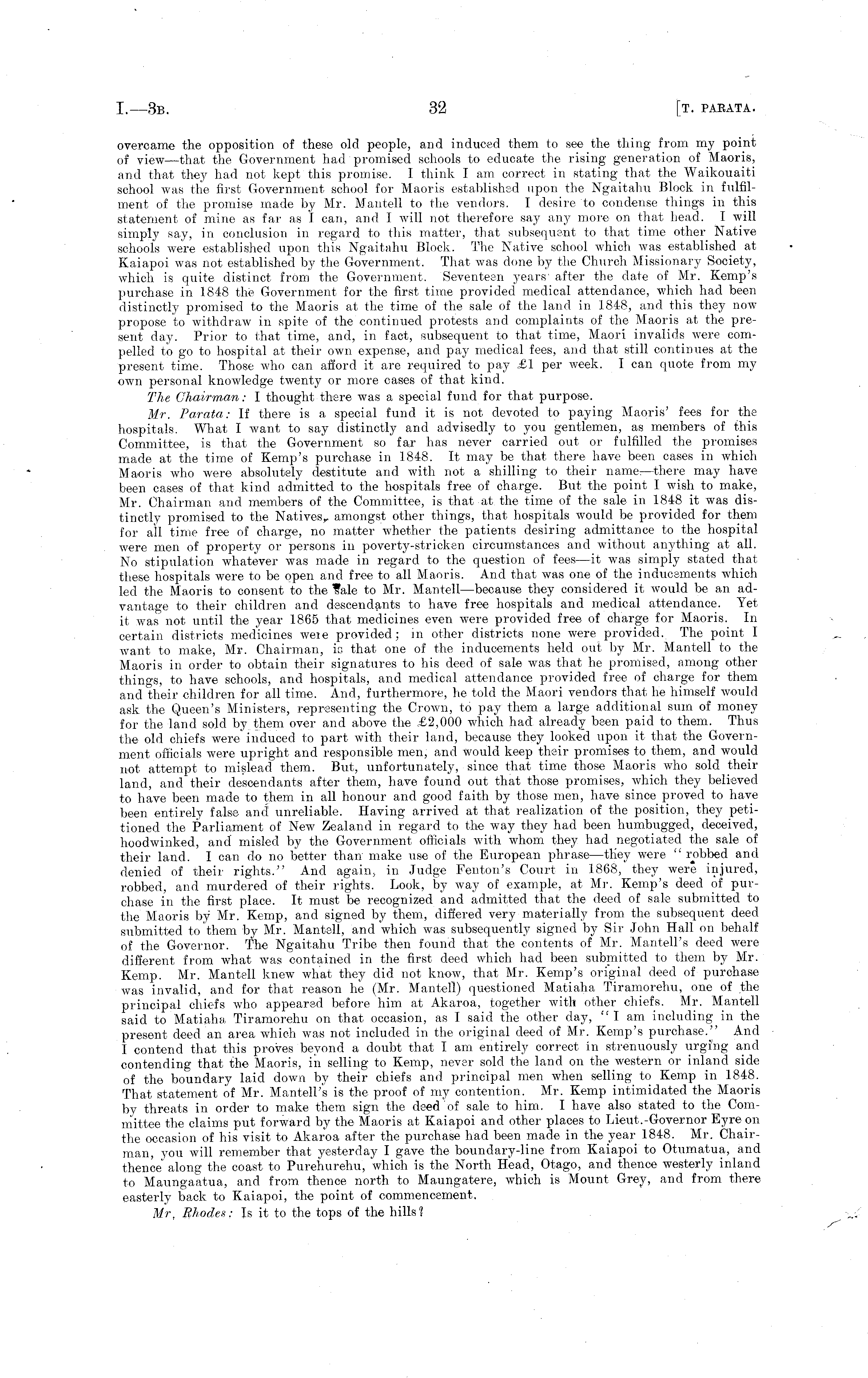 overcame the opposition of these old people, and induced them to see the thing from my point of view—that the Government had promised schools to educate the rising generation of Maoris, and that they had not kept this promise. 1 think I am correct in stating that the Waikouaiti school was the first Government school for Maoris established upon the Ngaitahu Block in fulfilment of the promise made by Mr. Mantell to the vendors. I desire to condense things in this statement of mine as far as I can, and I will not therefore say any more on that head. I will simply say, in conclusion in regard to this matter, that subsequent to that time other Native schools were established upon this Ngaitahu Block. The Native school which was established at Kaiapoi was not established by the Government. That was done by the Church Missionary Society, which is quite distinct from the Government. Seventeen years after the date of Mr. Kemp's purchase in 1848 the Government for the first time provided medical attendance, which had been distinctly promised to the Maoris at the time of the sale of the land in 1848, and this they now propose to withdraw in spite of the continued protests and complaints of the Maoris at the present day. Prior to that time, and, in fact, subsequent to that time, Maori invalids were compelled to go to hospital at their own expense, and pay medical fees, and that still continues at the present time. Those who can afford it are required to pay £1 per week. I can quote from my own personal knowledge twenty or more cases of that kind. The Chairman: I thought there was a special fund for that purpose. Mr. Parata: If there is a special fund it is not devoted to paying Maoris' fees for the hospitals. What I want to say distinctly and advisedly to you gentlemen, as members of this Committee, is that the Government so far has never carried out or fulfilled the promises made at the time of Kemp's purchase in 1848. It may be that there have been cases in which Maoris who were absolutely destitute and with not a shilling to their name—there may have been cases of that kind admitted to the hospitals free of charge. But the point I wish to make, Mr. Chairman and members of the Committee, is that at the time of the sale in 1848 it was distinctly promised to the Natives,, amongst other things, that hospitals would be provided for them for ail time free of charge, no matter whether the patients desiring admittance to the hospital were men of property or persons in poverty-stricken circumstances and without anything at all. No stipulation whatever was made in regard to the question of fees—it was simply stated that these hospitals were to be open and free to all Maoris. And that was one of the inducements which led the Maoris to consent to the fale to Mr. Mantell—because they considered it would be an advantage to their children and descendants to have free hospitals and medical attendance. Yet it was not until the year 1865 that medicines even were provided free of charge for Maoris. In certain districts medicines weie provided; in other districts none were provided. The point I want to make, Mr. Chairman, ic. that one of the inducements held out by Mr. Mantell to the Maoris in order to obtain their signatures to his deed of sale was that he promised, among other things, to have schools, and hospitals, and medical attendance provided free of charge for them and their children for all time. And, furthermore, he told the Maori vendors that he himself would ask the Queen's Ministers, representing the Crown, to pay them a large additional sum of money for the land sold by them over and above the £2,000 which had already been paid to them. Thus the old chiefs were induced to part with their land, because they looked upon it that the Government officials were upright and responsible men, and would keep their promises to them, and would not attempt to mislead them. But, unfortunately, since that time those Maoris who sold their land, and their descendants after them, have found out that those promises, which they believed to have been made to them in all honour and good faith by those men, have since proved to have been entirely false and unreliable. Having arrived at that realization of the position, they petitioned the Parliament of New Zealand in regard to the way they had been humbugged, deceived, hoodwinked, and misled by the Government officials with whom they had negotiated the sale of their land. I can do no better than make use of the European phrase—they were " robbed and denied of their rights." And again, in Judge Fenton's Court in 1868, they were injured, robbed, and murdered of their rights. Look, by way of example, at Mr. Kemp's deed of purchase in the first place. It must be recognized and admitted that the deed of sale submitted to the Maoris by Mr. Kemp, and signed by them, differed very materially from the subsequent deed submitted to them by Mr. Mantell, and which was subsequently signed by Sir John Hall on behalf of the Governor. The Ngaitahu Tribe then found that the contents of Mr. Mantell's deed were different from what was contained in the first deed which had been submitted to them by Mr. Kemp. Mr. Mantell knew what they did not know, that Mr. Kemp's original deed of purchase was invalid, and for that reason he (Mr. Mantell) questioned Matiaha Tiramorehu, one of the principal chiefs who appeared before him at Akaroa, together with other chiefs. Mr. Mantell said to Matiaha Tiramorehu on that occasion, as I said the other day, " I am including in the present deed an area which was not included in the original deed of Mr. Kemp's purchase." And I contend that this proves beyond a doubt that I am entirely correct in strenuously urging and contending that the Maoris, in selling to Kemp, never sold the land on the western or inland side of the boundary laid down by their chiefs and principal men when selling to Kemp in 1848. That statement of Mr. Mantell's is the proof of my c