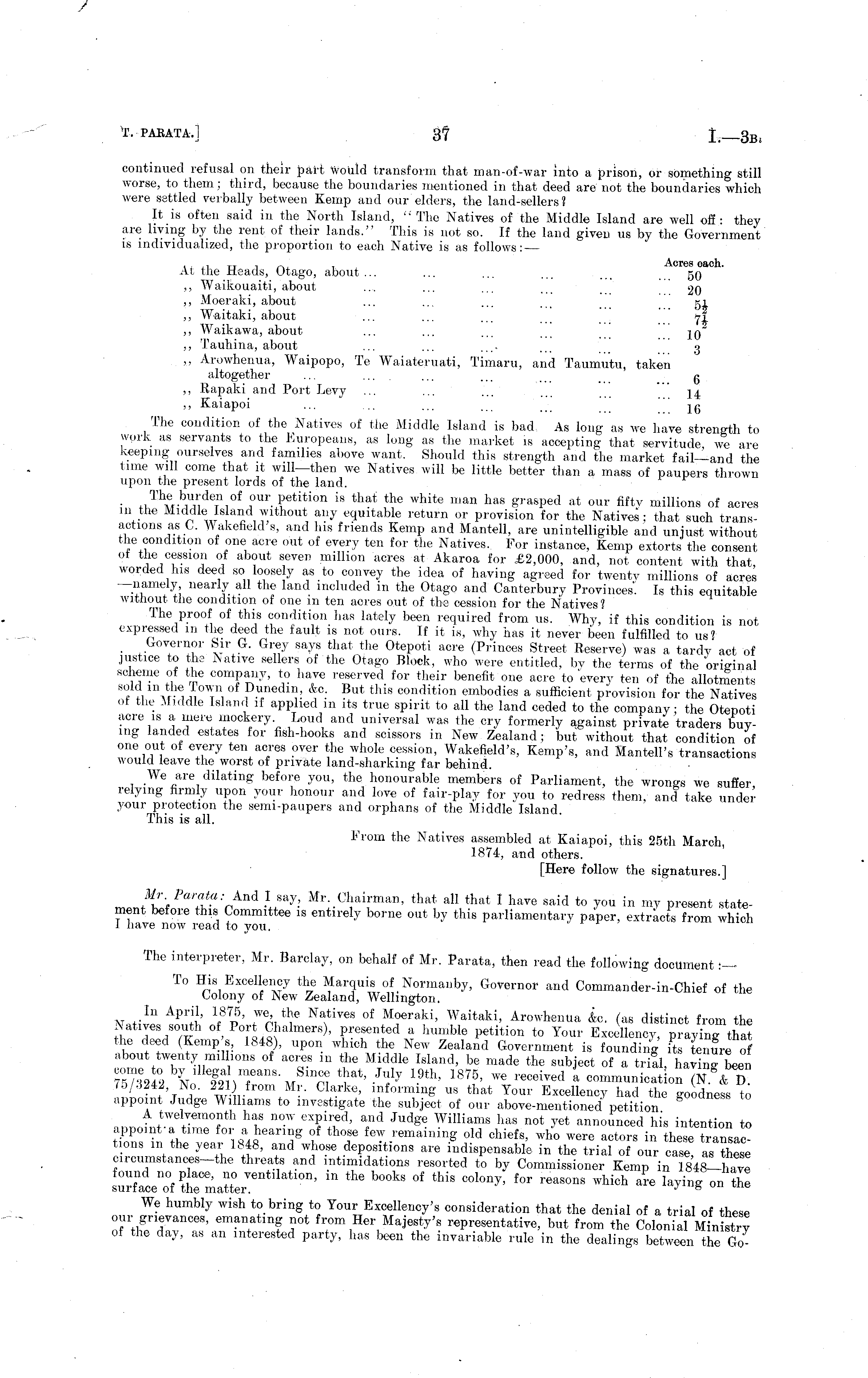 continued refusal on their part would transform that man-of-war into a prison, or something still worse, to them ; third, because the boundaries mentioned in that deed are not the boundaries which were settled verbally between Kemp and our elders, the land-sellers? It is often said in the North Island, " The Natives of the Middle Island are well off- they are living by the rent of their lands." This is not so. If the land given us by the Government is individualized, the proportion to each Native is as follows: ..,,,,,„, , Acres each. At the Heads, Otago, about ... ... ... ijq „ Waikouaiti, about ... ... ... 20 ~ Moeraki, about ... ... ... ... ... 51 ~ Waitaki, about ... ... n ~ Waikawa, about ... ... jq. ~ Tauhina, about ... ... ... 3 ~ Arowheima, Waipopo, To Waiateruati, Timaru, and Taumutu, taken altogether ... .... ... ... . g ~ Rapaki and Port Levy ... ... ... 14 ~ Kaiapoi ... ... ... ... 16 The condition of the Natives of the Middle Island is bad As long as we have strength to work as servants to the Europeans, as long as the market is accepting that servitude we are keeping ourselves and families above want. Should this strength and the market fail—and the time will come that it will—then we Natives will be little better than a mass of paupers thrown upon the present lords of the land. ■ A^, o '^™^ 011 is tbat the White nian has g™ s Ped at our fifty millions of acres 111 the Middk, Iβ and without any equitable return or provision for the Natives; that such transactions as C. Wakefield s, and his friends Kemp and Mantell, are unintelligible and unjust without the condition of one acre out of every ten for the Natives. For instance, Kemp extorts the consent ot the cession of about seven million acres at Akaroa for £2,000, and, not content with that worded his deed so loosely as to convey the idea of having agreed for twenty millions of acres —namely nearly all the land included in the Otago and Canterbury Provinces': Is this equitable without the condition of one in ten acres out of the cession for the Natives ? The proof of this condition has lately been required from us. Why,' if this condition is not expressed m the deed the fault is not ours. If it is, why has it never been fulfilled to us? Governor Sir G. Grey says that the Otepoti acre (Princes Street Reserve) was a tardy act of justice to the Native sellers of the Otago Block, who were entitled, by the terms of the original scheme of the company, to have reserved for their benefit one acre to every ten of the allotments T?. m J™ *-™ n of P.unedin, &c. But this condition embodies a sufficient provision for the Natives ot the Middle Island if applied in its true spirit to all the land ceded to the company: the Otepoti acre is a mere mockery. Loud and universal was the cry formerly against private traders buying landed estates for fish-hooks and scissors in Now Zealand; but without that condition of one out ot every ten acres over the whole cession, Wakefield's, Kemp's, and Mantell's transactions would leave the worst of private land-sharking far behind. We are dilating before you, the honourable members of Parliament, the wrongs we suffer relying firmly upon your honour and love of fair-play for you to redress them, and take under .your protection the semi-paupers and orphans of the Middle Island. This is all. From the Natives assembled at Kaiapoi, this 25th March, 1874, and others. [Here follow the signatures.] mP nt A tf Pa 'T : r And L** 7 '- Mr ;. Cl : ai r aD ' th l a V hat l have Said t0 y° u in ™y P«*»t statement before this Committee is entirely borne out by this parliamentary paper, extracts from which 1 have now read to you. The interpreter, Mr. Barclay, on behalf of Mr. Parata, then read the following document :~ To His Excellency the Marquis of Normanby, Governor and Commander-in-Chief of the Colony of New Zealand, Wellington. In April, 1875, we the Natives of Moeraki, Waitaki, Arowhentia Ac. (as distinct from the Natives south of Port Chalmers), presented a humble petition to Your Excellency, praying that the deed (Kemp s, 1848), upon which the New Zealand Government is founding its tenure of about twenty millions of acres in the Middle Island, be made the subject of a trial, having been 7?/?s£ VS/r\f Slß n T> J t 19th ' 1875 ' We received a communLat on?N g & D 75/3242, No. 221) from Mr. Clarke, informing us that Your Excellency had the goodness to appoint Judge Williams to investigate the subject of our above-mentioned petition A twelvemonth has now expired, and Judge Williams has not yet announced hi's intention to tins tth I r° r A* 7 I th T fe V emainin g ° ld cMefs ' Wh ° were actors in th ese transactions m the year 1848, and whose depositions are indispensable in the trial of our case as these circumstances-the threats and intimidations resorted to by Commissioner Kemp irT 848-have suXceTf £ C matt° e r nt tloD ' *** b °° kS ° f ** f ° r reaS ° nS wMch onZ We humbly wish to bring to Your Excellency's consideration that the denial of a trial of these our grievances, emanating not from Her Majesty's representative, but from the Colonial Ministry of the day, as an interested party, has been the invariable rule in the dealings between the Go