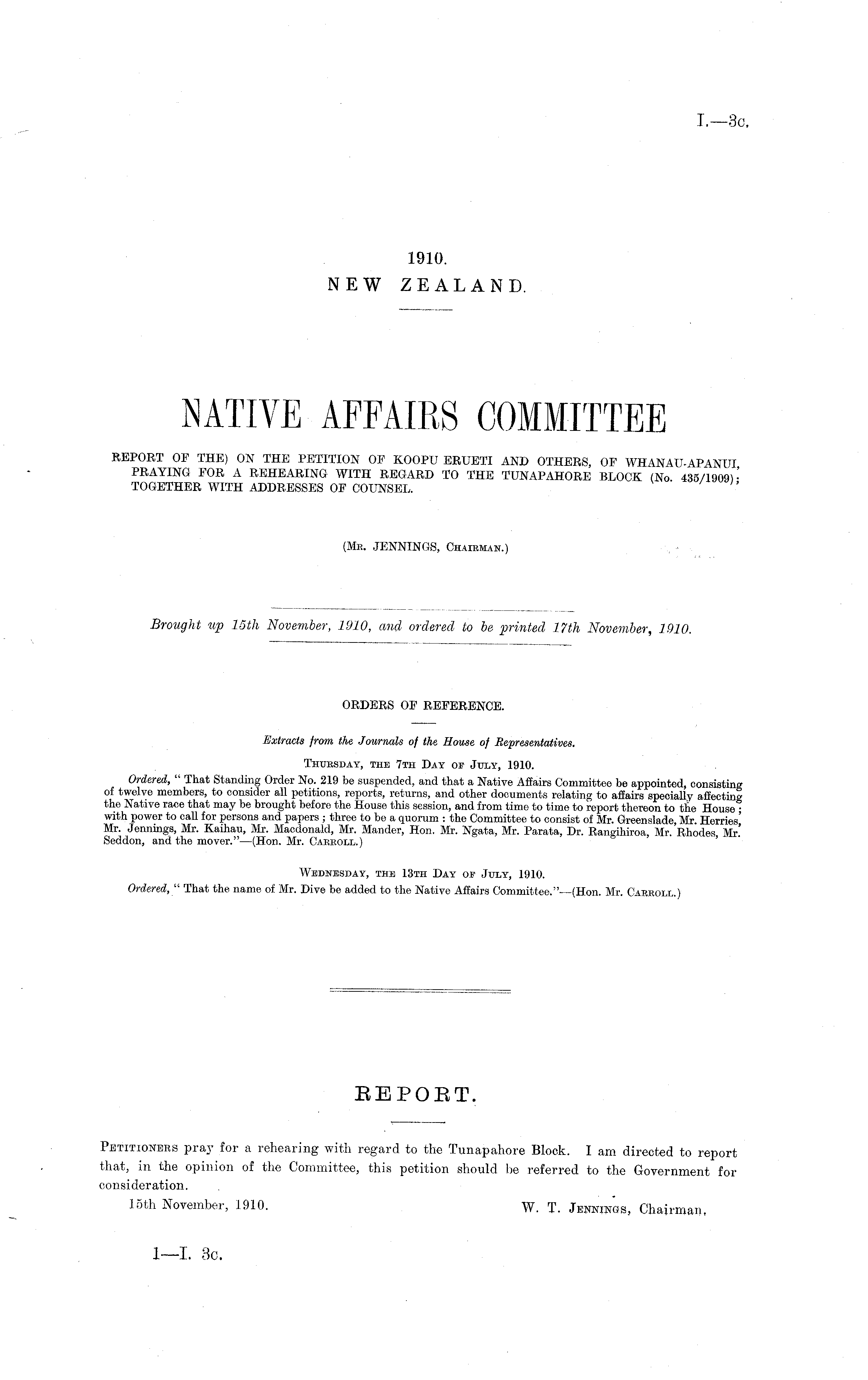ORDERS OP REFERENCE. Extracts from the Journals of the House of Representatives. Thursday, the 7th Day of July, 1910. Ordered, " That Standing Order No. 219 be suspended, and that a Native Affairs Committee be appointed, consisting of twelve members, to consider all petitions, reports, returns, and other documents relating to affairs specially affecting the Native race that may be brought before the House this session, and from time to time to report thereon to the House ■ with power to call for persons and papers ; three to be a quorum : the Committee to consist of Mr. Greenslade Mr Herries' Mr. Jennings, Mr. Kaihau, Mr. Macdonald, Mr. Mander, Hon. Mr. Ngata, Mr. Parata, Dr. Rangihiroa, Mr. Rhodes Mr! Seddon, and the mover." —(Hon. Mr. Carroll.) Wednesday, the 13th Day of July, 1910. Ordered," That the name of Mr. Dive be added to the Native Affairs Committee."—(Hon. Mr. Carroll.)