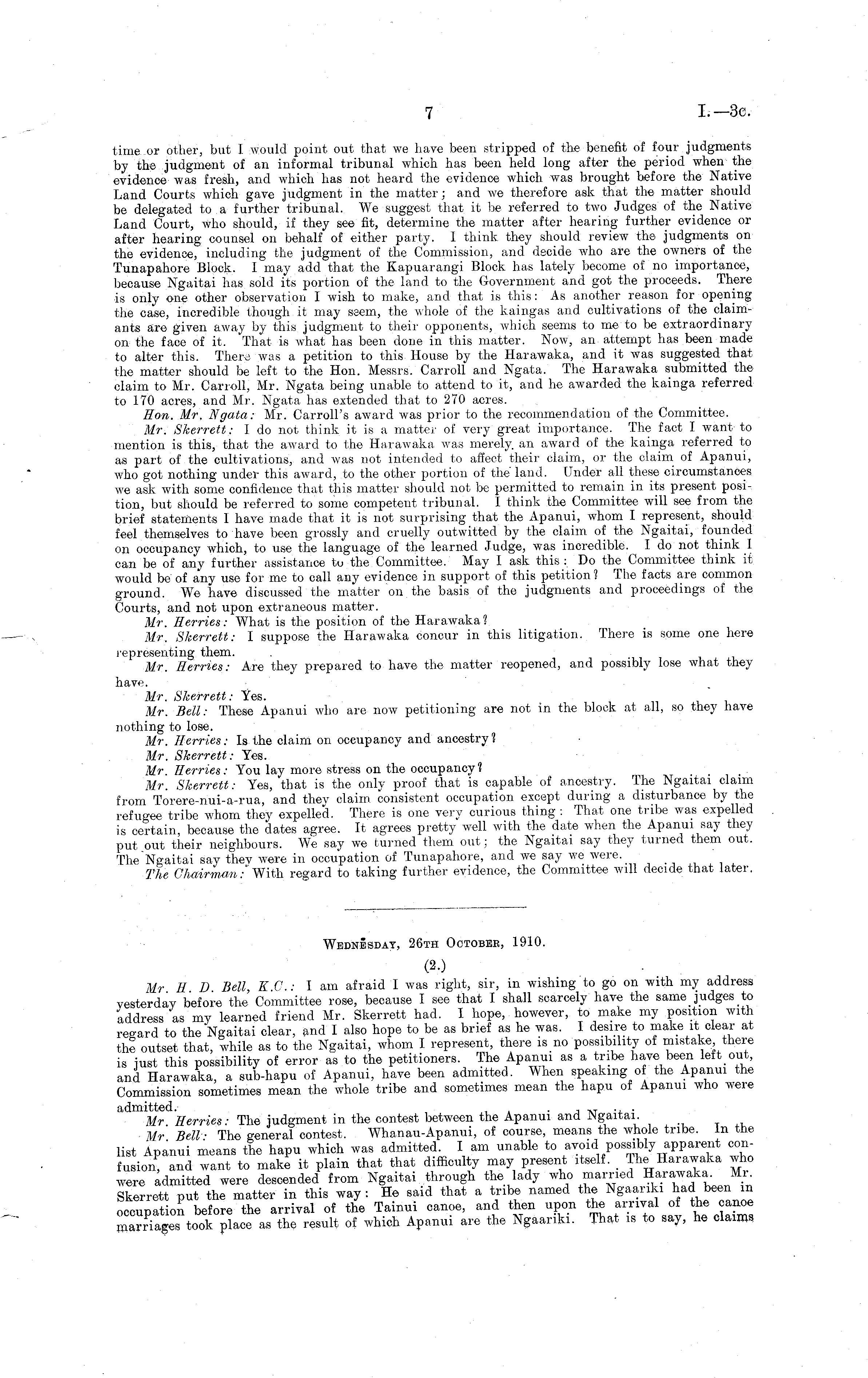 Wednesday, 26th October, 1910. (2.) Mr H D Bell XC. : I am afraid I was right, sir, in wishing to go on with my address yesterday before the Committee rose, because I see that I shall scarcely have the same judges to "address as my learned friend Mr. Skerrett had. I hope, however, to make my position with regard to the Ngaitai clear, and I also hope to be as brief as he was. I desire to make it clear at the outset that, while as to the Ngaitai, whom I represent, there is no possibility of mistake there is just this possibility of error as to the petitioners. The Apanui as a tribe have been left out, and Harawaka, a sub-hapu of Apanui, have been admitted. When speaking of the Apanui the Commission sometimes mean the whole tribe and sometimes mean the hapu of Apaniu who were admitted. . . _ T . . Mr Herries: The judgment in the contest between the Apanui and Ngaitai. Mr Bell ■ The general contest. Whanau-Apanui, of course, means the whole tribe. In the list Apanui means the hapu which was admitted. I am unable to avoid possibly apparent confusion" and want to make it plain that that difficulty may present itself. _ The Harawaka who were admitted were descended from Ngaitai through the lady who married Harawaka. Mr. Skerrett put the matter in this way : He said that a tribe named the Ngaanki had been m occupation before the arrival of the Tainui canoe, and then upon the arrival of the canoe marriages took place as the result of which Apanui are the Ngaanki. That is to say, he claims