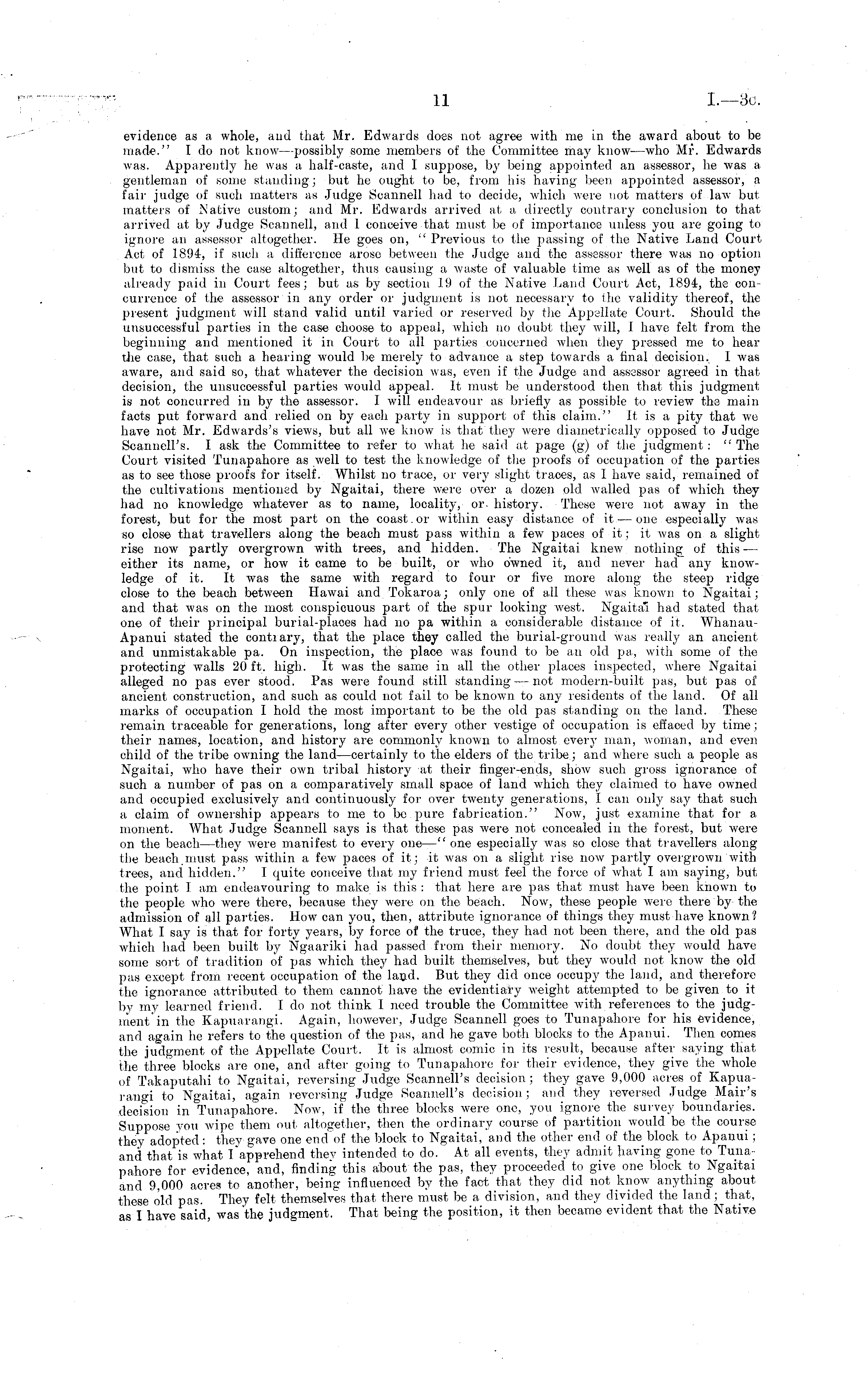 evidence as a whole, and that Mr. Edwards does not agree with me in the award about to be made." I do not know—possibly some members of the Committee may know —who Mr. Edwards was. Apparently he was a half-caste, and I suppose, by being appointed an assessor, he was a gentleman of some standing; but he ought to be, from his having been appointed assessor, a fair judge of such matters as Judge Soaniiell had to decide, which were not matters of law but matters of Native custom; and Mr. Edwards arrived at a directly contrary conclusion to that arrived at by Judge Seannell, and I conceive that must be of importance unless you are going to ignore an assessor altogether. He goes on, " Previous to the passing of the Native Land Court Act of 1894, if such a difference arose between the Judge and the assessor there was no option but to dismiss the case altogether, thus causing a waste of valuable time as well as of the money already paid in Court fees; but as by section 19 of the Native Land Court Act, 1894, the concurrence of the assessor in any order or judgment is not necessary to the validity thereof, the present judgment will stand valid until varied or reserved by the Appellate Court. Should the unsuccessful parties in the case choose to appeal, which no doubt they will, I have felt from the beginning and mentioned it in Court to all parties concerned when they pressed me to hear the case, that such a hearing would be merely to advance a step towards a final decision. I was aware, and said so, that whatever the decision was, even if the Judge and assessor agreed in that decision, the unsuccessful parties would appeal. It must be understood then that this judgment is not concurred in by the assessor. 1 will endeavour as briefly as possible to review the main facts put forward and relied on by each party in support of this claim." It is a pity that we have not Mr. Edwards's views, but all we know is that they were diametrically opposed to Judge ScaimelPs. I ask the Committee to refer to what he said at page (g) of the judgment : " The Court visited Tunapahore as well to test the knowledge of the proofs of occupation of the parties as to see those proofs for itself. Whilst no trace, or very slight traces, as 1 have said, remained of the cultivations mentioned by Ngaitai, there were over a dozen old walled pas of which they had no knowledge whatever as to name, locality, or history. These were not away in the forest, but for the most part on the coast. or within easy distance of it — one especially was so close that travellers along the beach must pass within a few paces of it; it was on a slight rise now partly overgrown with trees, and hidden. The Ngaitai knew nothing of this — either its name, or how it came to be built, or who owned it, and never had any knowledge of it. It was the same with regard to four or five more along the steep ridge close to the beach between Hawai and Tokaroa; only one of ail these was known to Ngaitai; and that was on the most conspicuous part of the spur looking west. Ngaitai had stated that one of their principal burial-places had no pa within a considerable distance of it. WhanauApanui stated the contiary, that the place they called the burial-ground was really an ancient and unmistakable pa. On inspection, the place was found to be an old pa, with some of the protecting walls 20 ft. high. It was the same in all the other places inspected, where Ngaitai alleged no pas ever stood. Pas were found still standing — not modern-built pas, but pas of ancient construction, and such as could not fail to be known to any residents of the land. Of all marks of occupation I hold the most important to be the old pas standing on the land. These remain traceable for generations, long after every other vestige of occupation is effaced by time; their names, location, and history are commonly known to almost every man, woman, and even child of the tribe owning the land—certainly to the elders of the tribe; and where such a people as Ngaitai, who have their own tribal history at their finger-ends, show such gross ignorance of such a number of pas on a comparatively small space of land which they claimed to have owned and occupied exclusively and continuously for over twenty generations, I can only say that such a claim of ownership appears to me to be pure fabrication." Now, just examine that for a moment. What Judge Scannell says is that these pas were not concealed in the forest, but were on the beach—they were manifest to every one—" one especially was so close that travellers along the beach must pass within a few paces of it; it was on a slight rise now partly overgrown with trees, and hidden." I quite conceive that my friend must feel the force of what lam saying, but the point I am endeavouring to make is this : that here are pas that must have been known to the people who were there, because they were on the beach. Now, these people were there by the admission of all parties. How can you, then, attribute ignorance of things they must have known? What I say is that for forty years, by force of the truce, they had not been there, and the old pas which had been built by Ngaariki had passed from their memory. No doubt they would have some sort of tradition of pas which they had built themselves, but they would not know the old pas except from recent occupation of the land. But they did once occupy the land, and therefore the ignorance attributed to them cannot have the evidentiary weight attempted to be given to it by my learned friend. Ido not think I need trouble the Committee with references to the judgment'in the Kapuarangi. Again, however, Judge Scannell goes to Tunapahore for his evidence, and again lie refers to the question of the pas, and he gave both blocks to the Apanui. Then comes the judgment of the Appellate Court. It is almost comic in its result, because after saying that the three blocks are one, and after going to Tunapahore for their evidence