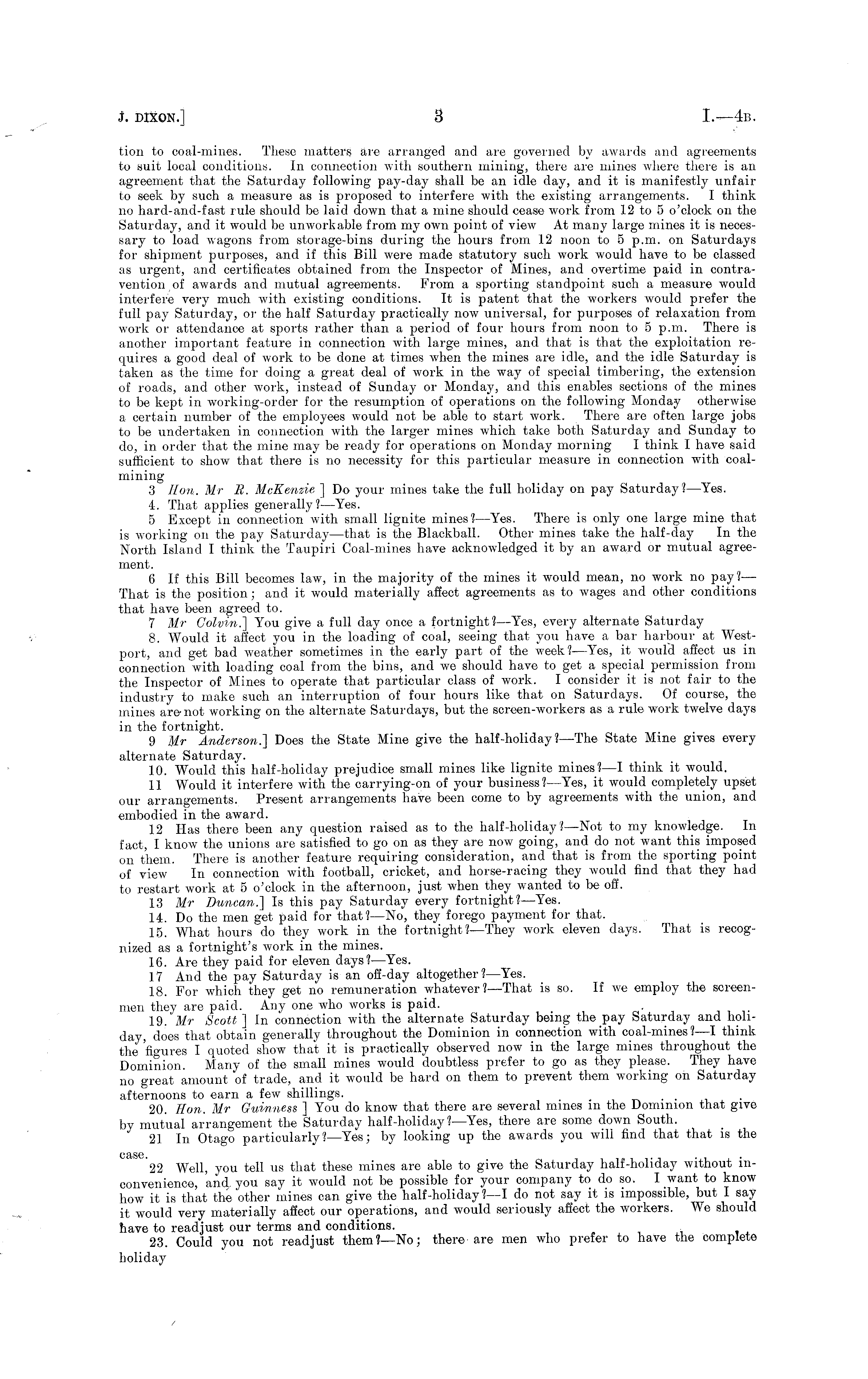 tion to coal-mines. These matters are arranged and are governed by awards and agreements to suit local conditions. In connection with southern mining, there are mines where there is an agreement that the Saturday following pay-day shall be an idle day, and it is manifestly unfair to seek by such a measure as is proposed to interfere with the existing arrangements. I think no hard-and-fast rule should be laid down that a mine should cease work from 12 to 5 o'clock on the Saturday, and it would be unworkable from my own point of view At many large mines it is necessary to load wagons from storage-bins during the hours from 12 noon to 5 p.m. on Saturdays for shipment purposes, and if this Bill were made statutory such work would have to be classed as urgent, and certificates obtained from the Inspector of Mines, and overtime paid in contravention of awards and mutual agreements. From a sporting standpoint such a measure would interfere very much with existing conditions. It is patent that the workers would prefer the full pay Saturday, or the half Saturday practically now universal, for purposes of relaxation from work or attendance at sports rather than a period of four hours from noon to 5 p.m. There is another important feature in connection with large mines, and that is that the exploitation requires a good deal of work to be done at times when the mines are idle, and the idle Saturday is taken as the time for doing a great deal of work in the way of special timbering, the extension of roads, and other work, instead of Sunday or Monday, and this enables sections of the mines to be kept in working-order for the resumption of operations on the following Monday otherwise a certain number of the employees would not be able to start work. There are often large jobs to be undertaken in connection with the larger mines which take both Saturday and Sunday to do, in order that the mine may be ready for operations on Monday morning I think I have said sufficient to show that there is no necessity for this particular measure in connection with coalmining 3 Hon. Mr 11. McKenzie ] Do your mines take the full holiday on pay Saturday?—Yes. 4. That applies generally? —Yes. 5 Except in connection with small lignite mines? —Yes. There is only one large mine that is working on the pay Saturday —that is the Blackball. Other mines take the half-day In the North Island I think the Taupiri Coal-mines have acknowledged it by an award or mutual agreement. 6 If this Bill becomes law, in the majority of the mines it would mean, no work no pay? — That is the position; and it would materially affect agreements as to wages and other conditions that have been agreed to. 7 Mr Colvin.] You give a full day once a fortnight? —Yes, every alternate Saturday 8. Would it affect you in the loading of coal, seeing that you have a bar harbour at Westport, and get bad weather sometimes in the early part of the week? —Yes, it would affect us in connection with loading coal from the bins, and we should have to get a special permission from the Inspector of Mines to operate that particular class of work. I consider it is not fair to the industry to make such an interruption of four hours like that on Saturdays. Of course, the mines are not working on the alternate Saturdays, but the screen-workers as a rule work twelve days in the fortnight. 9 Mr Anderson.] Does the State Mine give the half -holiday ?—The State Mine gives every alternate Saturday. 10. Would this half-holiday prejudice small mines like lignite mines? —I think it would. 11 Would it interfere with the carrying-on of your business ?—Yes, it would completely upset our arrangements. Present arrangements have been come to by agreements with the union, and embodied in the award. 12 Has there been any question raised as to the half-holiday ?—Not to my knowledge. In fact, I know the unions are satisfied to go on as they are now going, and do not want this imposed on them. There is another feature requiring consideration, and that is from the sporting point of view In connection with football, cricket, and horse-racing they would find that they had to restart work at 5 o'clock in the afternoon, just when they wanted to be off. 13 Mr Duncan.] Is this pay Saturday every fortnight? —Yes. 14. Do the men get paid for that? —No, they forego payment for that. 15. What hours do they work in the fortnight?—They work eleven days. That is recognized as a fortnight's work in the mines. 16. Are they paid for eleven days?—Yes. 17 And the pay Saturday is an off-day altogether ?—Yes. 18. For which they get no remuneration whatever? —That is so. If we employ the screenmen they are paid. Any one who works is paid. 19. Mr Scott ] In connection with the alternate Saturday being the pay Saturday and holiday, does that obtain generally throughout the Dominion in connection with coal-mines?—l think the 'figures I quoted show that it is practically observed now in the large mines throughout the Dominion. Many of the small mines would doubtless prefer to go as they please. They have no great amount of trade, and it would be hard on them to prevent them working on Saturday afternoons to earn a few shillings. . . , 20. Hon. Mr Guinness ] You do know that there are several mines in the Dominion that give by mutual arrangement the Saturday half-holiday ?—Yes, there are some down South. 21 In Otago particularly? —Yes; by looking up the awards you will find that that is the 22 Well, you tell us that these mines are able to give the Saturday half-holiday without inconvenience, and. you say it would not be possible for your company to do so. I want to know how it is that the other mines can give the half-holiday ?—I do not say it is impossible, but I say it would very materially affect our operations, and would seriously affect the workers. We should have to readjust our terms and conditions. 23. Could you not readjust them?—No; there are men who prefer to have the