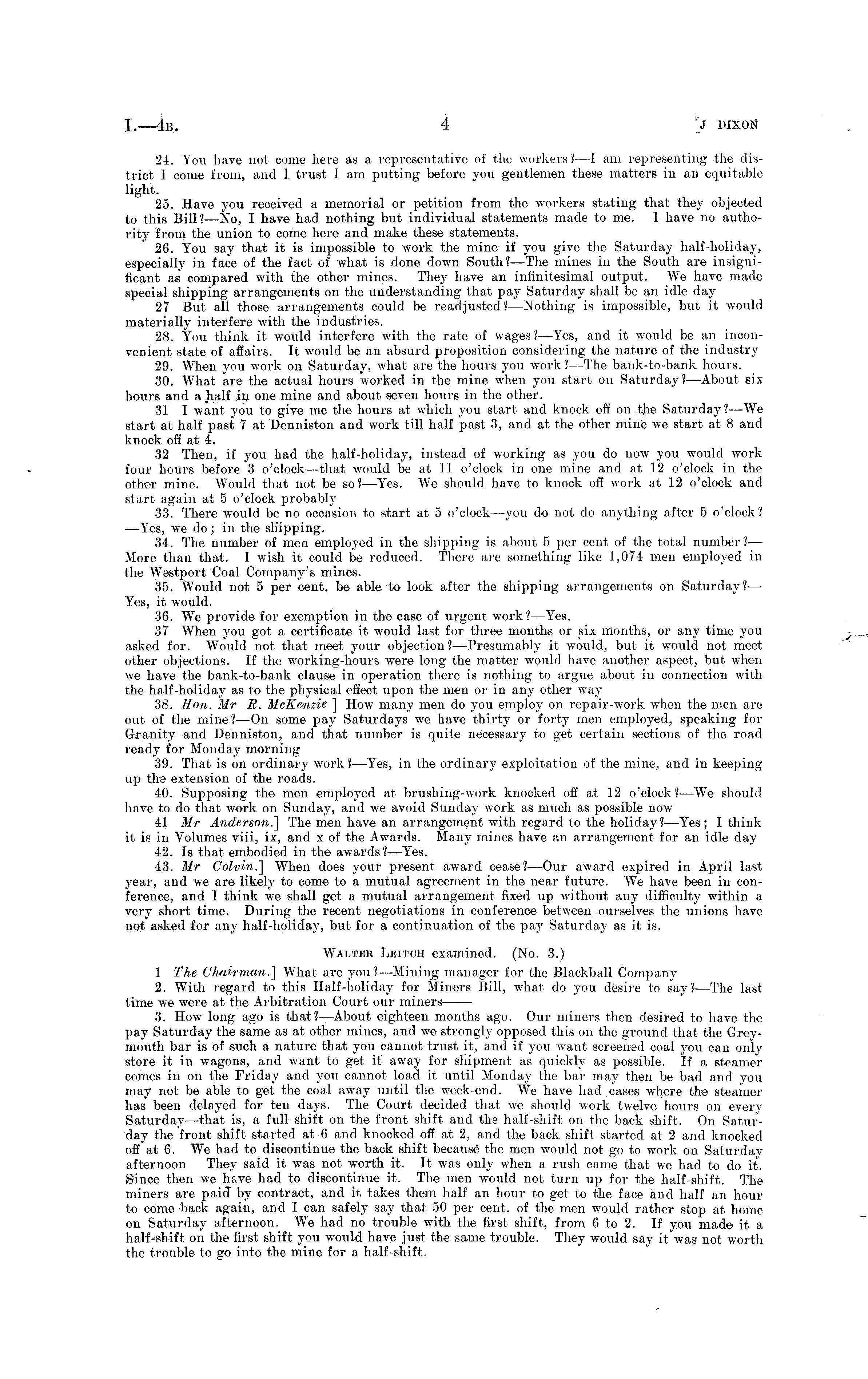 24. You have not come here as a representative of the workers?—l am representing the district I come from, and 1 trust I am putting before you gentlemen these matters in an equitable light. 25. Have you received a memorial or petition from the workers stating that they objected to this Bill? —No, I have had nothing but individual statements made to me. 1 have no authority from the union to come here and make these statements. 26. You say that it is impossible to work the mine if you give the Saturday half-holiday, especially in face of the fact of what is done down South? —The mines in the South are insignificant as compared with the other mines. They have an infinitesimal output. We have made special shipping arrangements on the understanding that pay Saturday shall be an idle day 27 But all those arrangements could be readjusted?—Nothing is impossible, but it would materially interfere with the industries. 28. You think it would interfere with the rate of wages?—Yes, and it would be an inconvenient state of affairs. It would be an absurd proposition considering the nature of the industry 29. When you work on Saturday, what are the hours you work?—The bank-to-bank hours. 30. What are the actual hours worked in the mine when you start on Saturday? —About six hours and a half in one mine and about seven hours in the other. 31 I want you to give me the hours at which you start and knock off on the Saturday?—We start at half past 7 at Denniston and work till half past 3, and at the other mine we start at 8 and knock off at 4. 32 Then, if you had the half-holiday, instead of working as you do now you would work four hours before 3 o'clock—that would be at 11 o'clock in one mine and at 12 o'clock in the other mine. Would that not be so?—Yes. W"e should have to knock off work at 12 o'clock and start again at 5 o'clock probably 33. There -would be no occasion to start at 5 o'clock —you do not do anything after 5 o'clock? —Yes, we do; in the shipping. 34. The number of men employed in the shipping is about 5 per cent of the total number?- — More than that. I wish it could be reduced. There are something like 1,074 men employed in the Westport Coal Company's mines. 35. Would not 5 per cent, be able to look after the shipping arrangements on Saturday? — Yes, it would. 36. W T e provide for exemption in the case of urgent work? —Yes. 37 When you got a certificate it would last for three months or six months, or any time you asked for. Would not that meet your objection? —Presumably it would, but it would, not meet other objections. If the working-hours were long the matter would have another aspect, but when we have the bank-to-bank clause in operation there is nothing to argue about in connection with the half-holiday as to the physical effect upon the men or in any other way 38. Hon. Mr R. McKenzie ] How many men do you employ on repair-work when the men are out of the mine? —On some pay Saturdays we have thirty or forty men employed, speaking for Granity and Denniston, and that number is quite necessary to get certain sections of the road ready for Monday morning 39. That is on ordinary work?—Yes, in the ordinary exploitation of the mine, and in keeping up the extension of the roads. 40. Supposing the men employed at brushing-work knocked off at 12 o'clock?—We should have to do that work on Sunday, and we avoid Sunday work as much as possible now 41 Mr Anderson.] The men have an arrangement with regard to the holiday?—Yes; I think it is in Volumes viii, ix, and xof the Awards. Man}- mines have an arrangement for an idle day 42. Is that embodied in the awards? —Yes. 43. Mr Golvin.] When does your present award cease? —Our award expired in April last year, and we are likely to come to a mutual agreement in the near future. We have been in conference, and I think we shall get a mutual arrangement fixed up without any difficulty within a very short time. During the recent negotiations in conference between ourselves the unions have not asked for any half-holiday, but for a continuation of the pay Saturday as it is. Walter Leitoh examined. (No. 3.) 1 The Chairman.] What are you?—Mining manager for the Blackball Company 2. With regard to this Half-holiday for Miners Bill, what do you desire to say?—The last time we were at the Arbitration Court our miners 3. How long ago is that? —About eighteen months ago. Our miners then desired to have the pay Saturday the same as at other mines, and we strongly opposed this on the ground that the Greymouth bar is of such a nature that you cannot trust it, and if you want screened coal you can only store it in wagons, and want to get it away for shipment as quickly as possible. If a steamer comes in on the Friday and you cannot load, it until Monday the bar may then be bad and you may not be able to get the coal away until the week-end. We have had cases where the steamer has been delayed for ten days. The Court decided that we should work twelve hours on every Saturday —-that is, a full shift on the front shift and the half-shift on the back shift. On Saturday the front shift started at 6 and knocked off at 2, and the back shift started at 2 and knocked off at 6. We had to discontinue the back shift because the men would not go to work on Saturday afternoon They said it was not worth it. It was only when a rush came that we had to do it. Since then we hf.ve had to discontinue it. The men would not turn up for the half-shift. The miners are paid" by contract, and it takes them half an hour to get to the face and half an hour to come back again, and I can safely say that 50 per cent, of the men would rather stop at home on Saturday afternoon. We had no trouble with the first shift, from 6to 2. If you made it a half-shift on the first shift you would have just the same trouble. They would say it was not worth the trouble to go into the mine for a half-shift.