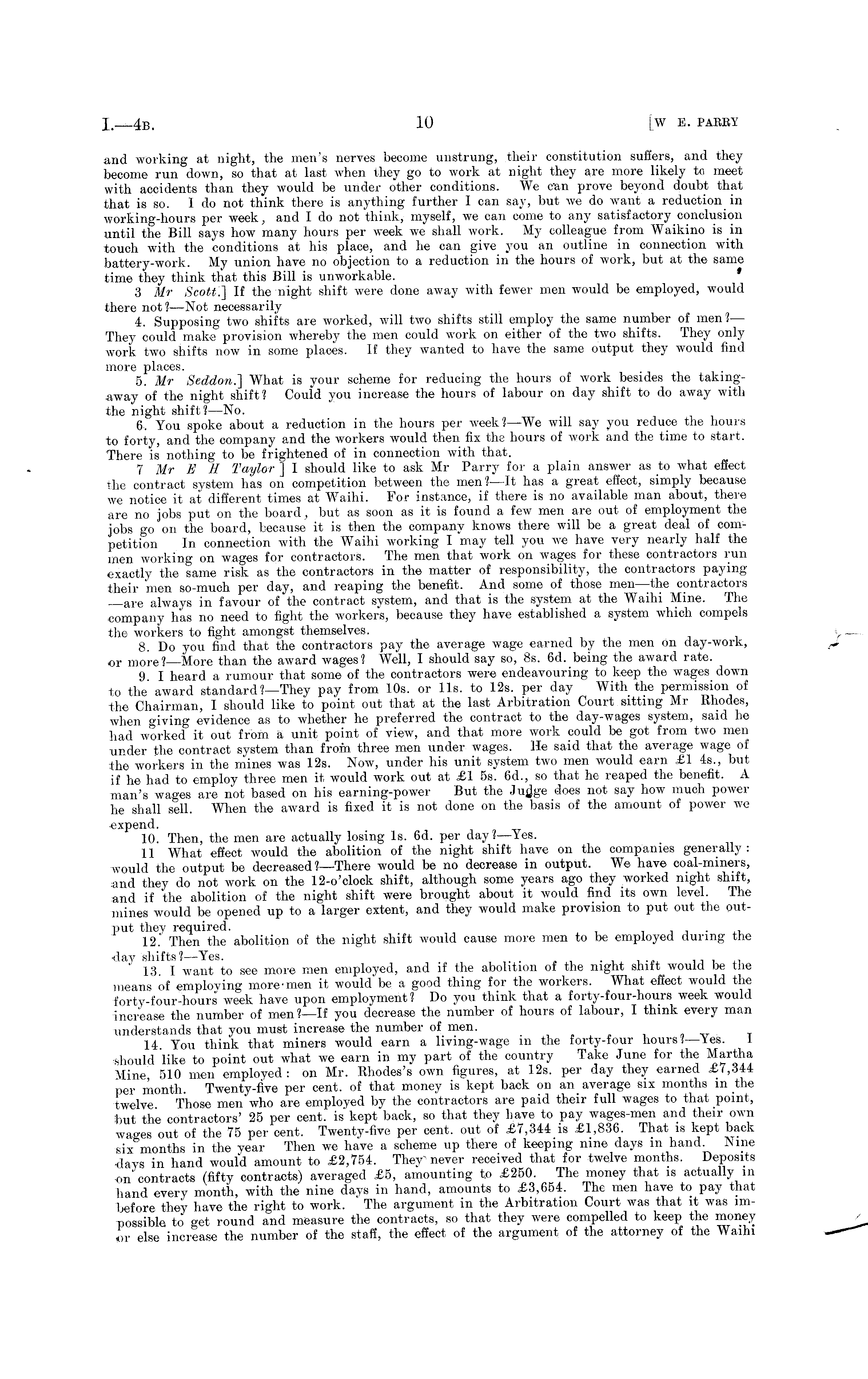 and working at night, the men's nerves become unstrung, their constitution suffers, and they become run down, so that at last when they go to work at night they are more likely to meet with accidents than they would be under other conditions. We can prove beyond doubt that that is so. Ido not think there is anything further I can say, but we do want a reduction in working-hours per week, and I do not think, myself, we can come to any satisfactory conclusion until the Bill says how many hours per week we shall work. My colleague from Waikino is in touch with the conditions at his place, and he can give you an outline in connection with battery-work. My union have no objection to a reduction in the hours of work, but at the same time they think that this Bill is unworkable. 3 Mr Scott.] If the night shift were done away with fewer men would be employed, would there not?—Not necessarily 4. Supposing two shifts are worked, will two shifts still employ the same number of men? — They could make provision whereby the men could work on either of the two shifts. They only work two shifts now in some places. If they wanted to have the same output they would find more places. 5. Mr Seddon.] What is your scheme for reducing the hours of work besides the takingaway of the night shift? Could you increase the hours of labour on day shift to do away with the night shift? —No. 6. You spoke about a reduction in the hours per week? —We will say you reduce the hours to forty, and the company and the workers would then fix the hours of work and the time to start. There is nothing to be frightened of in connection with that. 7 Mr E H Taylor ] I should like to ask Mr Parry for a plain answer as to what effect the contract system has on competition between the men? —It has a great effect, simply because we notice it at different times at Waihi. For instance, if there is no available man about, there are no jobs put on the board, but as soon as it is found a few men are out of employment the jobs go on the board, because it is then the company knows there will be a great deal of competition In connection with the Waihi working I may tell you we have very nearly half the men working on wages for contractors. The men that work on wages for these contractors run exactly the same risk as the contractors in the matter of responsibility, the contractors paying their men so-much per day, and reaping the benefit. And some of those men—the contractors are always in favour of the contract system, and that is the system at the Waihi Mine. The company has no need to fight the workers, because they have established a system which compels the workers to fight amongst themselves. 8. Do you find that the contractors pay the average wage earned by the men on day-work, or more?—More than the award wages? Well, I should say so, Bs. 6d. being the award rate. 9 I heard a rumour that some of the contractors were endeavouring to keep the wages down to the award standard?—They pay from 10s. or lis. to 12s. per day With the permission of the Chairman, I should like to point out that at the last Arbitration Court sitting Mr Rhodes, when giving evidence as to whether he preferred the contract to the day-wages system, said he had worked it out from a unit point of view, and that more work could be got from two men under the contract system than from three men under wages. He said that the average wage of the workers in the mines was 12s. Now, under his unit system two men would earn £1 45., but if he had to employ three men it would work out at £1 ss. 6d., so that he reaped the benefit. A man's wages are not based on his earning-power But the Judge does not say how much power he shall sell. When the award is fixed it is not done on the basis of the amount of power we expend. 10. Then, the men are actually losing Is. 6d. per day? —Yes. 11 What effect would the abolition of the night shift have on the companies generally: would the output be decreased ?—There would be no decrease in output. We have coal-miners, and they do not work on the 12-o'clock shift, although some years ago they worked night shift, and if the abolition of the night shift were brought about it would find its own level. The mines would be opened up to a larger extent, and they would make provision to put out the output they required. . 12." Then the abolition of the night shift would cause more men to be employed during the ■day shifts? —Yes. . ... ~ 13. I want to see more men employed, and if the abolition of the night shift would be the means of employing more-men it would be a good thing for the workers. What effect would the forty-four-hours' week have upon employment? Do you think that a forty-four-hours week would increase the number of men ?—lf you decrease the number of hours of labour, I think every man understands that you must increase the number of men. 14 You think that miners would earn a living-wage in the forty-four hours !— Yes. 1 should like to point out what we earn in my part of the country Take June for the Martha Mine 510 men employed : on Mr. Rhodes's own figures, at 12s. per day they earned £7,344 per month. Twenty-five per cent, of that money is kept back on an average six months m the twelve Those men who are employed by the contractors are paid their full wages to that point, but the contractors' 25 per cent, is kept back, so that they have to pay wages-men and their own wages out of the 75 per cent. Twenty-five per cent, out of £7,344 is £1,836. That is kept back six months in the year Then we have a scheme up there of keeping nine days in hand. Nine -days in hand would amount to £2,754. Ther never received that for twelve months. Deposits on contracts (fifty contracts) averaged £5, amounting to £250. The money that is actually in hand every month, with the nine days in hand, amounts to £3,654. The men have to pay that before they have the right to work. The argument in the Arbitration Court was that it was