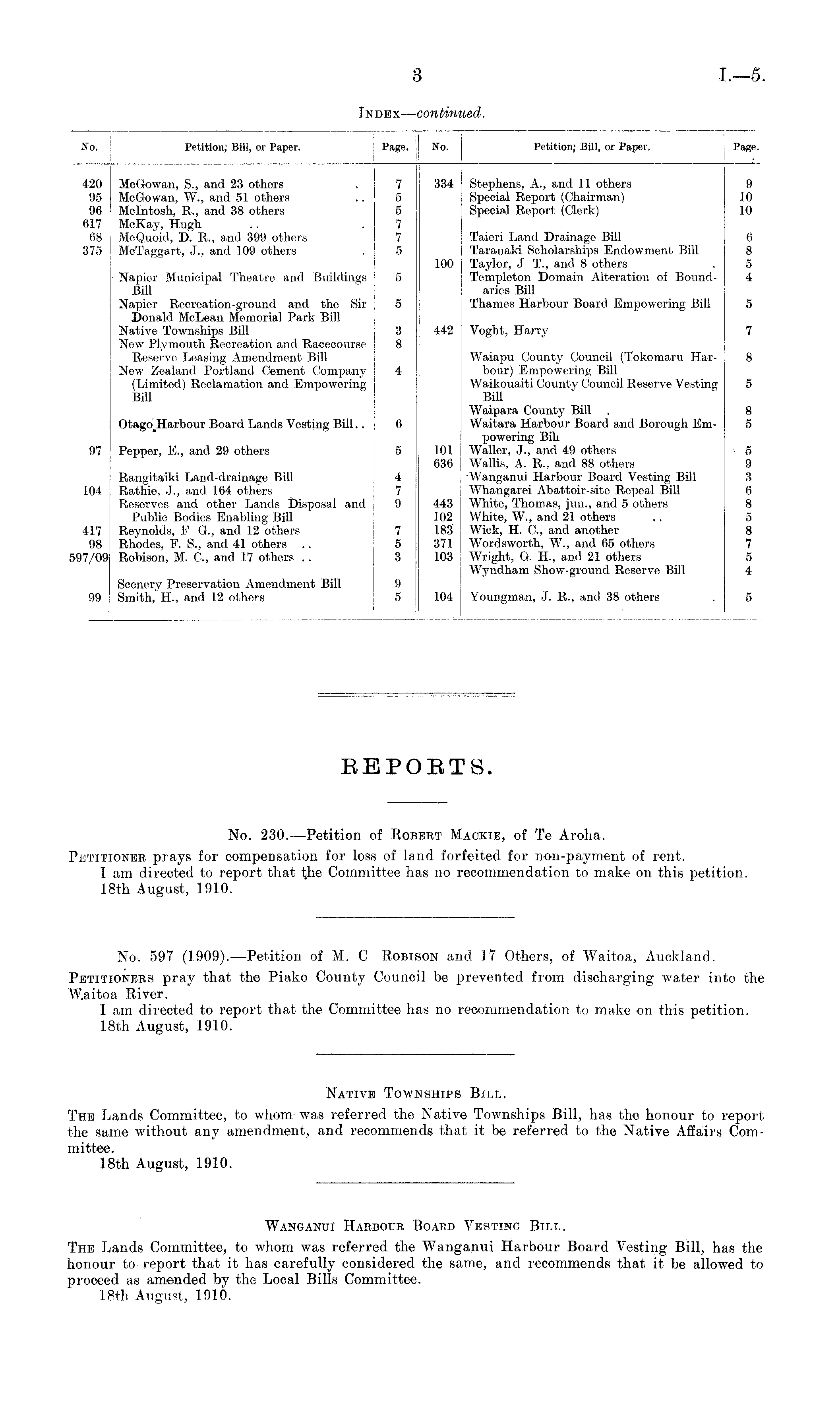 BEPOBTS. No. 230.—Petition of Robert Mackib, of Te Aroha. Petitioner prays for compensation for loss of land forfeited for non-payment of rent. I am directed to report that the Committee has no recommendation to make on this petition. 18th August, 1910.