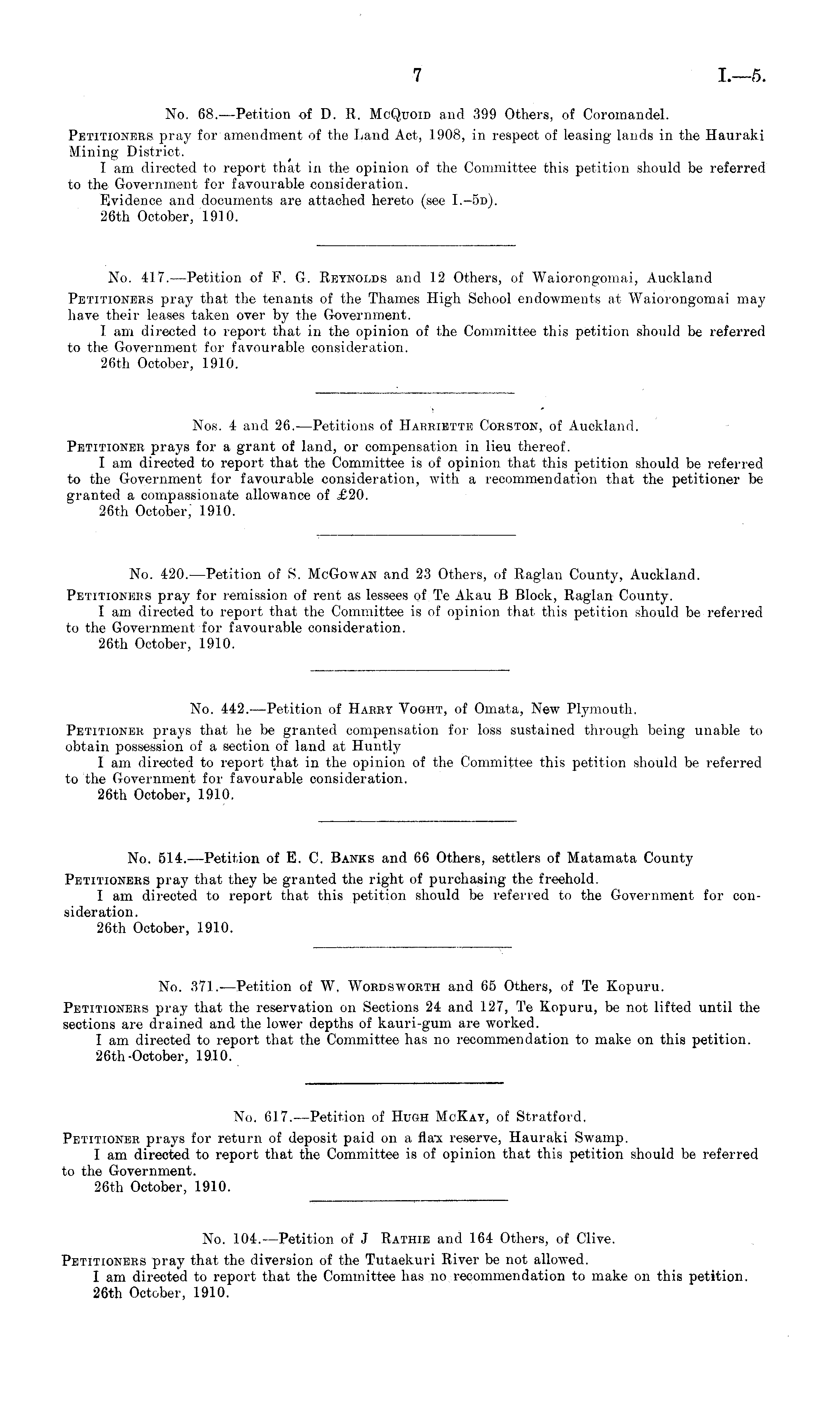 No. 68. —Petition of D. R. McQuoid and 399 Others, of Coromandel. Petitioners pray for amendment of the Land Act, 1908, in respect of leasing lands in the Hauraki Mining District. I am directed to report that in the opinion of the Committee this petition should be referred to the Government for favourable consideration. Evidence and documents are attached hereto (see I.— sd). 26th October, 1910.