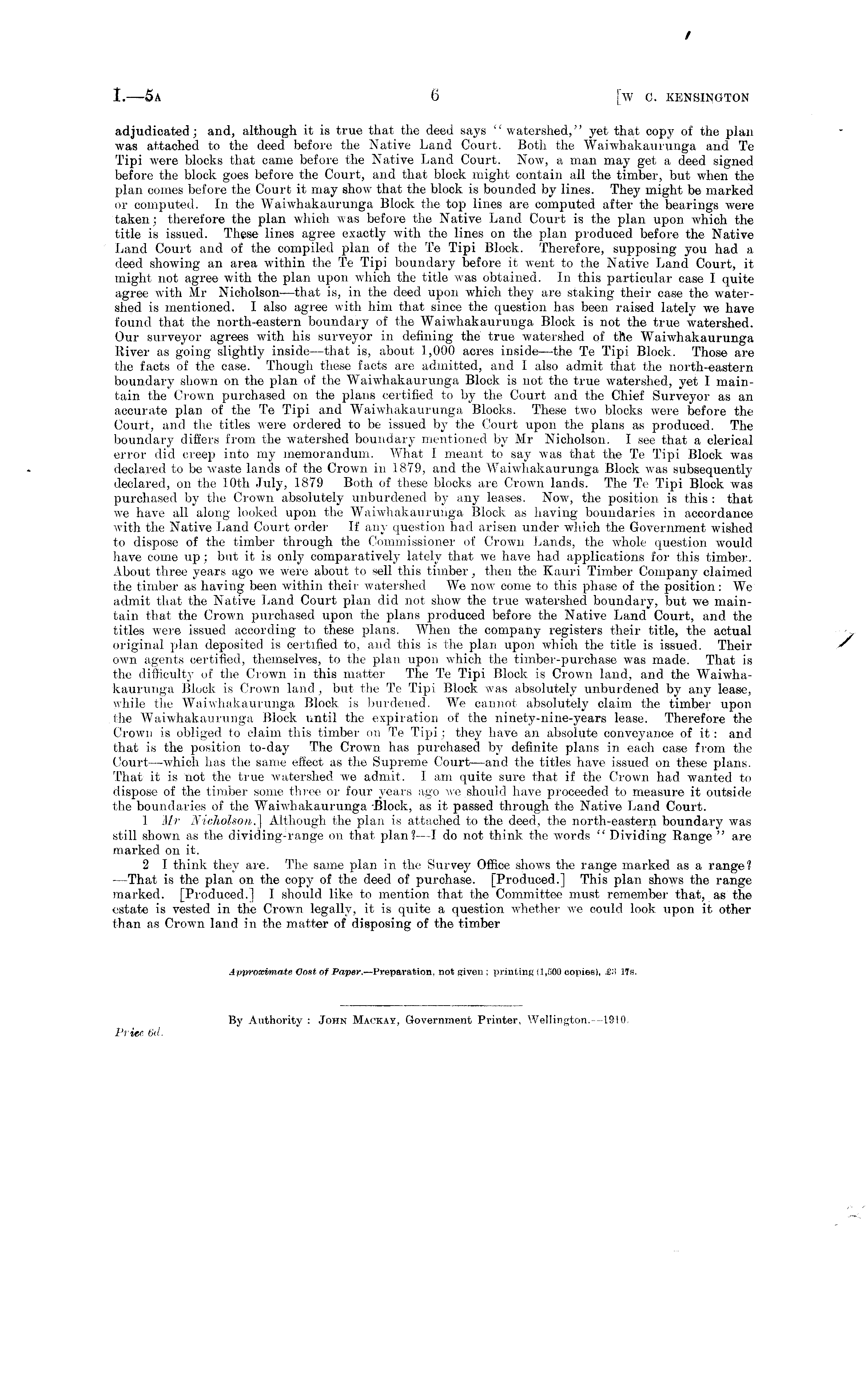 adjudicated; and, although it is true that the deed says " watershed," yet that copy of the plan was attached to the deed before the Native Land Court. Botii the Waiwhakaurunga and Te Tipi were blocks that came before the Native Land Court. Now, a man may get a deed signed before the block goes before the Court, and that block might contain all the timber, but when the plan comes before the Court it may show that the block is bounded by lines. They might be marked or computed. In the Waiwhakaurunga Block the top lines are computed after the bearings were taken; therefore the plan which was before the Native Land Court is the plan upon which the title is issued. These lines agree exactly with the lines on the plan produced before the Native Land Court and of the compiled plan of the Te Tipi Block. Therefore, supposing you had a deed showing an area within the Te Tipi boundary before it went to the Native Land Court, it might not agree with the plan upon which the title was obtained. In this particular case I quite agree with Mr Nicholson—that is, in the deed upon which they are staking their case the watershed is mentioned. I also agree with him that since the question has been raised lately we have found that the north-eastern boundary of the Waiwhakaurunga Block is not the true watershed. Our surveyor agrees with his surveyor in defining the true watershed of the Waiwhakaurunga River as going slightly inside—that is, about 1,000 acres inside—the Te Tipi Block-, Those are the facts of the case. Though these facts are admitted, and I also admit that the north-eastern boundary shown on the plan of the Waiwhakaurunga Block is not the true watershed, yet I maintain the Crown purchased on the plans certified to by the Court and the Chief Surveyor as an accurate plan of the Te Tipi and Waiwhakaurunga Blocks. These two blocks were before the Court, and the titles were ordered to be issued by the Court upon the plans as produced. The boundary differs from the watershed boundary mentioned by Mr Nicholson. I see that a clerical error did creep into my memorandum. What 1 meant to say was that the Te Tipi Block was declared to be waste lands of the Crown in 1879, and the Waiwhakaurunga Block was subsequently declared, on the 10th July, 1879 Both of these blocks are Crown lands. The Te Tipi Block was purchased by the Crown absolutely unburdened by any leases. Now, the position is this : that we have all along looked upon the Waiwhakaurunga Block as having boundaries in accordance with the Native Land Court order If any question had arisen under which the Government wished to dispose of the timber through the Commissioner of Crown Lands, the whole question would have come up; but it is only comparatively lately that we have had applications for this timber. About three years ago we were about to sell this timber, then the Kauri Timber Company claimed the timber as having been within their watershed We now come to this phase of the position: We admit that the Native Land Court plan did not show the true watershed boundary, but we maintain that the Crown purchased upon the plans produced before the Native Land Court, and the titles were issued according to these plans. When the company registers their title, the actual original plan deposited is certified to, and this is the plan upon which the title is issued. Their own agents certified, themselves, to the plan upon which the timber-purchase was made. That is the difficulty of the Gown in this matter The Te Tipi Block is Crown land, and the Waiwhakaurunga Block is Crown land, but the Te Tipi Block was absolutely unburdened by any lease, while the Waiwhakaurunga Block is burdened. We cannot absolutely claim the timber upon the Waiwhakaurunga Block until the expiration of the ninety-nine-years lease. Therefore the Crown is obliged to claim this timber on Te Tipi ; they have an absolute conveyance of it : and that is the position to-day The Crown has purchased by definite plans in each case from the Court—which has the same effect as the Supreme Court—and the titles have issued on these plans. That it is not the true watershed we admit, I am quite sure that if the Crown had wanted to dispose of the timber some three or four years ago we should have proceeded to measure it outside the boundaries of the Waiwhakaurunga -Block, as it passed through the Native Land Court. 1 Mr Nicholson.] Although the plan is attached to the deed, the north-eastern boundary was still shown as the dividing-range on that plan?—-I do not think the words " Dividing Range " are marked on it. 2 I think the}" are. The same plan in the Survey Office shows the range marked as a range? —That is the plan on the copy of the deed of purchase. [Produced.] This plan shows the range marked. [Produced.] I should like to mention that the Committee must remember that, as the estate is vested in the Crown legally, it is quite a question whether we could look upon it other than as Crown land in the matter of disposing of the timber Approximate Cost of Paper. —Preparation, not given ; printing (1,500 copies), £'•< 17s.