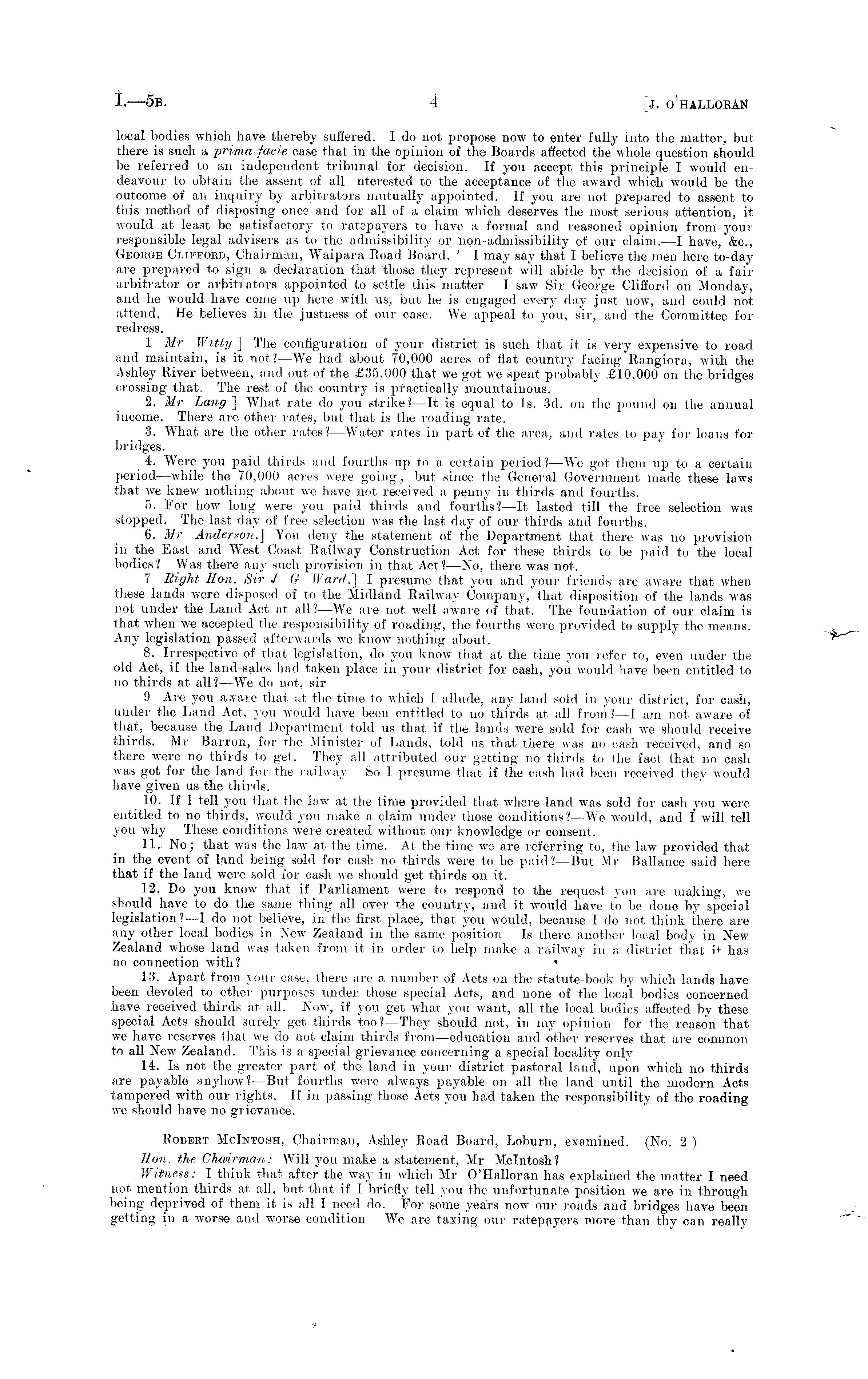 local bodies which have thereby suffered. Ido not propose now to enter fully into the matter, but there is such a prima facie case that in the opinion of the Boards affected the whole question should be referred to an independent tribunal for decision. If you accept this principle I would endeavour to obtain the assent of all nterested to the acceptance of the award which would be the outcome of an inquiry by arbitrators mutually appointed. If you are not prepared to assent to this method of disposing once and for all of a claim which deserves the most serious attention, it would at least be satisfactory to ratepayers to have a formal and reasoned opinion from your responsible legal advisers as to the admissibility or non-admissibility of our claim.—l have, <fec, George Ci.if.foiu:>, Chairman, Waipara Road Board. ' I may say that I believe the men here to-day-are prepared to sign a declaration that those they represent will abide by the decision of a fair arbitrator or arbitrators appointed to settle this matter I saw Sir George Clifford on Monday, and he would have come up here with us, but he is engaged every clay just now, and could not attend. He believes in the justness of our case. We appeal to you, sir, and the Committee for redress. 1 Mr Witty ] The configuration of your district is such that it is very expensive to road and maintain, is it not?—We had about 70,000 acres of flat country facing Rangiora, with the Ashley River between, and out of the £35,000 that we got we spent probably £10,000 on the bridges crossing that. The rest of the country is practically mountainous. 2. Mr Lang ] What rate do you strike? —It is equal to Is. 3d. on the pound on the annual income. There are other rates, but that is the roading rate. 3. What are the other rates?—Water rates in part of the area, and rates to pay for loans for bridges. 4. Were you paid thirds and fourths up to a, certain period?—We got them up to a certain period—while the 70,000 acres were going, but since the General Government made these laws that we knew nothing about we have not received a penny in thirds and fourths. 5. For how long were you paid thirds and fourths? —It lasted till the free selection was stopped. The last day of free selection was the last day of our thirds and fourths. 6. Mr Anderson.] You deny the statement of the Department that there was no provision in the East and West Coast Railway Construction Act for these thirds to be paid to the local bodies? Was there any such provision in that Act?—No, there was not. 7 Right Hon. Sir J G Ward.] J presume that you and your friends are aware that when these lands were disposed of to the Midland Railway Company, that disposition of the lands was not under the Land Act at all? —We are not well aware of that. The foundation of our claim is that when we accepted the responsibility of roading, the fourths were provided to supply the means. Any legislation passed afterwards we know nothing about. 8. Irrespective of that legislation, do you know that at the time you refer to, even under the old Act, if the land-sales had taken place in your district for cash, you would have been entitled to no thirds at all?—We do not, sir 9 Are you aware that at the time to which I allude, any land sold in your district, for cash, under the Land Act, you would have been entitled to no thirds at all from?—l am not aware of that, because the Land Department told us that if the lauds were sold for cash we should receive thirds. Mr Barron, for the Minister of Lands, told us that there was no cash received, and so there were no thirds to get. They all attributed our getting no thirds to the fact that no cash was got for the land for the railway So 1. presume that if the cash had been received they would have given us the thirds. 10. If I tell you that the law at the time provided that where land was sold for cash you were entitled to no thirds, would you make a claim under those conditions?—We would, and I will tell you why These conditions were created without our knowledge or consent. 11. No; that was the law at the time. At the time wo are referring to, the law provided that in the event of land being sold for cash no thirds were to be paid?—But Mr Ballance said here that if the land were sold for cash we should get thirds on it. 12. Do you know that if Parliament were to respond, to the request you are making, we should have to do the same thing all over the country, and it would have to be done by special legislation ?—I do not believe, in the first place, that you would, because I do not think there are any other local bodies in New Zealand in the same position Is there another local body in New Zealand whose land was taken from it in order to help make a railway in a district that b has no connection with? • 13. Apart from your case, there are a number of Acts on the statute-book by which lands have been devoted to other purposes under those special Acts, and none of the local bodies concerned have received thirds at all. Now, if you get what you want, all the local bodies affected by these special Acts should surely get thirds too?—They should not, in my opinion for the reason that we have reserves that we do not claim thirds from—education and other reserves that are common to all. New Zealand. This is a special grievance concerning a special locality only 14. Is not the greater part of the land in your district pastoral land, upon which no thirds are payable anyhow? —But fourths were always payable on all the land until the modern Acts tampered with our rights. If in passing those Acts you had taken the responsibility of the roading we should have no grievance. Robert Molntosh, Chairman, Ashley Road Board, Loburn, examined. (No. 2 ) Hon. the Chairman: Will you make a statement, Mr Mcintosh? Witness: I think that after the way in which Mr O'Halloran has explained the matter I need not mention thirds at all, but that if I briefly tell you the 