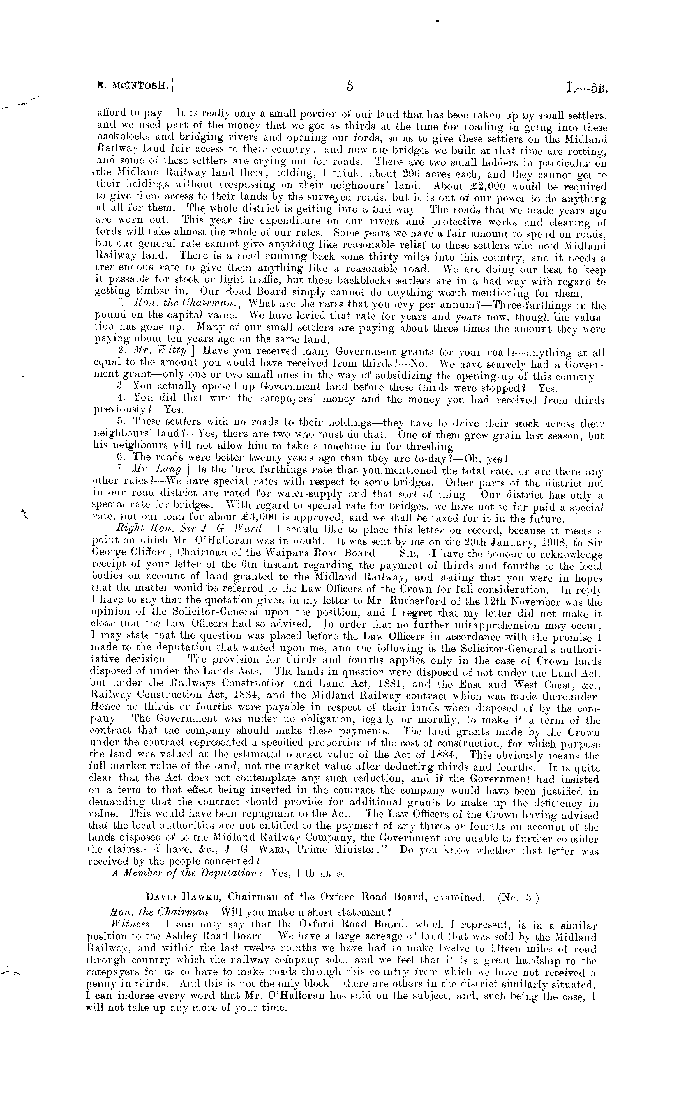 afford to pay- It is really only a small portion of our land that has been taken up by small settlers, and we used part of the money that we got as thirds at the time for roading in going into these backblocks and bridging rivers and opening out fords, so as to give these settlers on the Midland Railway land fair access to their country, and now the bridges we built at that time are rotting, and some of these settlers are crying out for roads. There are two small holders in particular 011 .the Midland Railway land there, holding, 1 think, about 200 acres each, and they cannot get to their holdings without trespassing on their neighbours' land. About £2,00U would be required to give them access to their lands by the surveyed roads, but it is out of our power to do anything at all for them. The whole district is getting into a bad way The roads that we made years ago are worn. out. This year the expenditure on our rivers and protective works and clearing of fords will take almost the whole of our rates. Some years we have a fair amount to spend on roads, but our general rate cannot give anything like reasonable relief to these settlers who hold Midland Railway land. There is a road, running back some thirty miles into this country, and it needs a tremendous rate to give them anything like a reasonable road. We are doing "our best to keep it passable for stock or light traffic, but these backblocks settlers are in a bad way with regard to getting timber in. Our Road Board simply cannot do anything worth mentioning for them. 1 Hon. the Chairman.] What are the rates that you levy per annum?—Throe-farthings in the pound on the capital value. We have levied that rate for years and years now, though the valuation has gone up. Many of our small settlers are paying about three times the amount they were paying about ten years ago on the same land. 2. Mr. Witty J Have you received many Government grants for your roads—anything at all equal to the amount you would have received from thirds?—No. We have scarcely had a Government grant —only one or two small ones in the way of subsidizing the opeiiing-up of this country 3 You actually opened up Government land before these thirds were stopped?—Yes. 4. You did that with the ratepayers' money and the money you had received from thirds previously ?—Yes. 5. These settlers with no roads to their holdings —they have to drive their stock across their neighbours' land?—Yes, there are two who must do that. One of them grew grain last season, but his neighbours will not allow him to take a machine in for threshing 6. The roads were better twenty years ago than they are to-day? —Oh, yes! 7 Mr Lang ] Is the three-farthings rate that you mentioned the total rate, or are there any other rates '!— We have special rates with respect to some bridges. Other parts of the district not in our road district are rated for water-supply and that sort of thing Our district lias only a special rate for bridges. With regard to special rate for bridges, we have not so far paid a special rate, but our loan for about £3,000 is approved, and we shall be taxed for it in the future. Right Hon. Sir J G Ward I should like to place this letter on record, because it meets a point on which Mr OTlalloran was in doubt. It was sent by me on the 29th January, 1908, to Sir George Clifford, Chairman of the Waipara Road Board Sir, —1 have the honour to acknowledge receipt of your letter of the 6th instant regarding the payment of thirds and fourths to the local bodies on account of land granted to the Midland Railway, and stating that you were in hopes that the matter would be referred to the Law Officers of the Crown for full consideration. In reply 1 have to say that the quotation given in my letter to Mr Rutherford of the 12th November was the opinion of the Solicitor-General upon the position, and I regret that my letter did not make it clear that the Law Officers had so advised. In order that no further misapprehension may occur, 1 may state that the question was placed before the Law Officers in accordance with the promise 1 made to the deputation that waited upon me, and the following is the Solicitor-General s authoritative decision The provision for thirds and fourths applies only in the case of Crown lands disposed of under the Lands Acts. The lands in question were disposed of not under the Land Act, but under the Railways Construction, and Land Act, 1881, and the East and West Coast, &c, Railway Construction Act, 1884, and the Midland Railway contract which was made thereunder Hence no thirds or fourths were payable in respect of their lands when disposed of by the company The Government was under no obligation, legally or morally, to make it a term of the contract that the company should make these payments. The land grants made by the Crown under the contract represented a specified proportion of the cost of construction, for which purpose the land was valued at the estimated market value of the Act of 1884. This obviously means the full market value of the land, not the market value after deducting thirds and fourths. It is quite clear that the Act does not contemplate any such reduction, and if the Government had insisted on a term to that effect being inserted in the contract the company would have been justified in demanding that the contract should provide for additional grants to make up the deficiency in value. This would have been repugnant to the Act. The Law Officers of the Crown having advised that the local authorities are not entitled to the payment of any thirds or fourths on account of the lands disposed of to the Midland Railway Company, the Government are unable to further consider the claims.—l. have, <tc, J G Ward, Prime Minister." Do you know whether that letter was received by the people concerned ? A Member of the Deputation: Yes, I think so. David Hawke, Chairman of the Oxford Road Board, examined. (No. 3 ) Hon. the Chairman Will you 