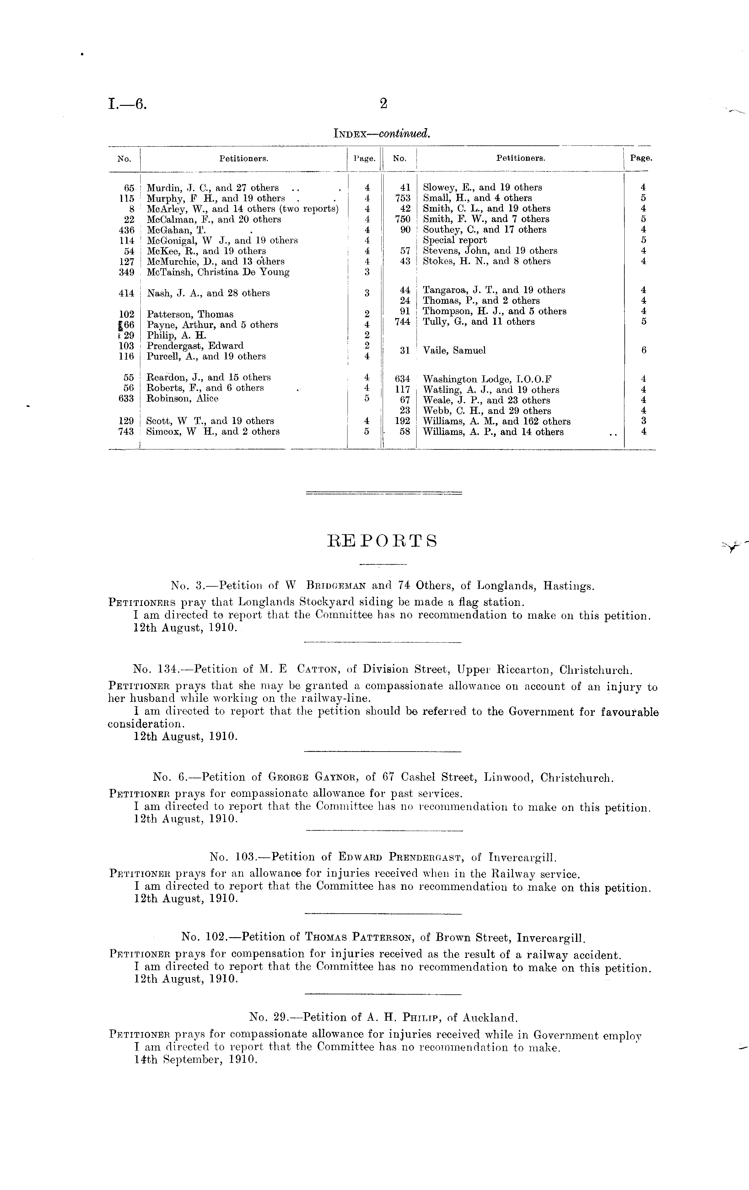 No. 6.—Petition of George Gaynor, of 67 Cashel Street, Linwood, Christchurch. Petitioner prays for compassionate allowance for past services. I am directed to report that the Committee has no recommendation to make on this petition 12th August, 1910.