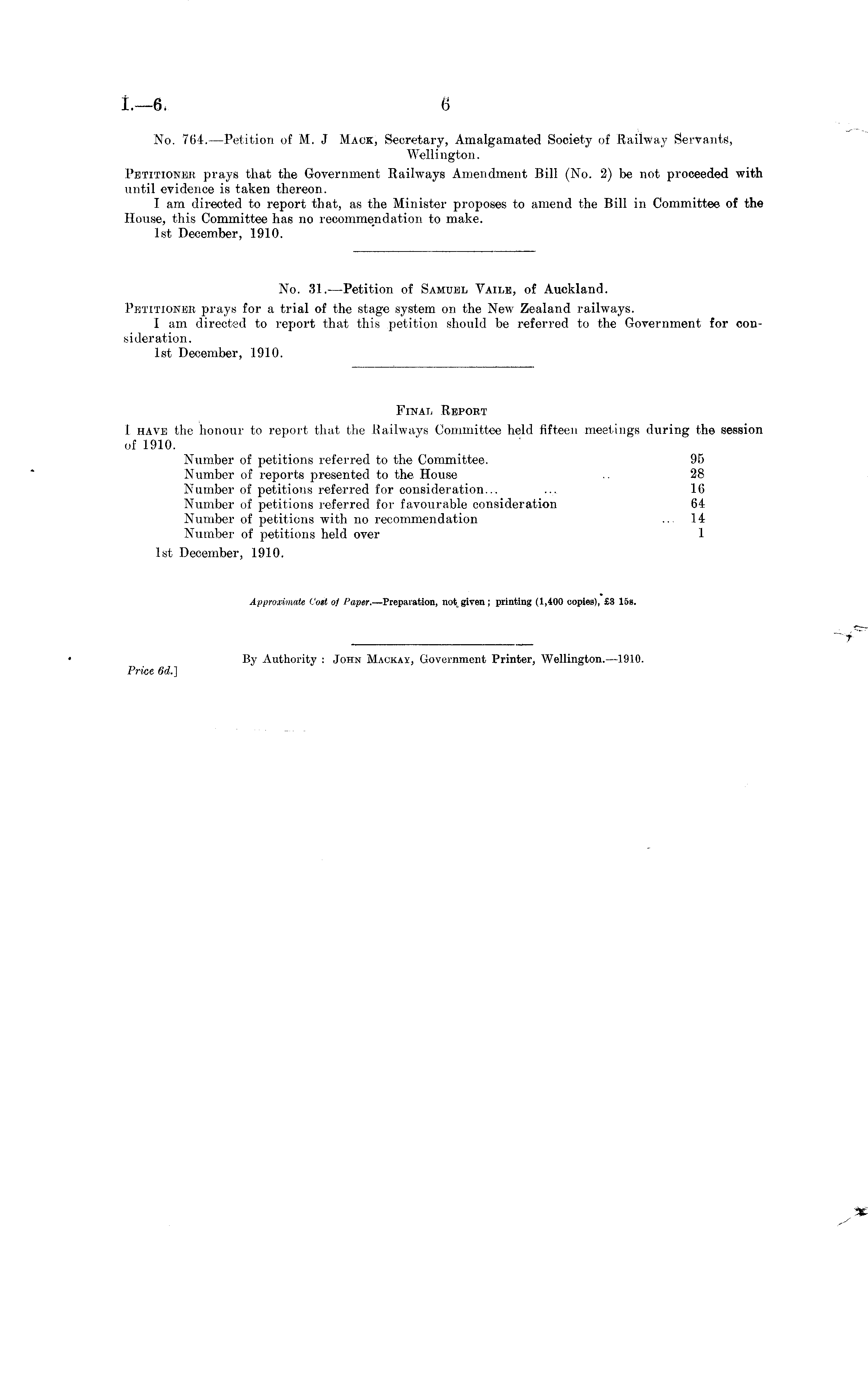 No. 764. —Petition of M. J Mack, Secretary, Amalgamated Society of Railway Servants, Wellington. Petitioner prays that the Government Railways Amendment Bill (No. 2) be not proceeded with until evidence is taken thereon. I am directed to report that, as the Minister proposes to amend the Bill in Committee of the House, this Committee has no recommendation to make. Ist December, 1910. No. 31. —Petition of Samuel Vaile, of Auckland. Petitioner prays for a trial of the stage system on the New Zealand railways. I am directed to report that this petition should be referred to the Government for consideration. Ist December, 1910. Final Report I have the honour to report that the Railways Committee held fifteen meetings during the session of 1910. Number of petitions referred to the Committee. 95 Number of reports presented to the House .. 28 Number of petitions referred for consideration... ... 16 Number of petitions referred for favourable consideration 64 Number of petitions with no recommendation ... 14 Number of petitions held over 1 Ist December, 1910. Approximate Cost of Paper. —Preparation, not given; printing (1,400 copies), £3 15s.