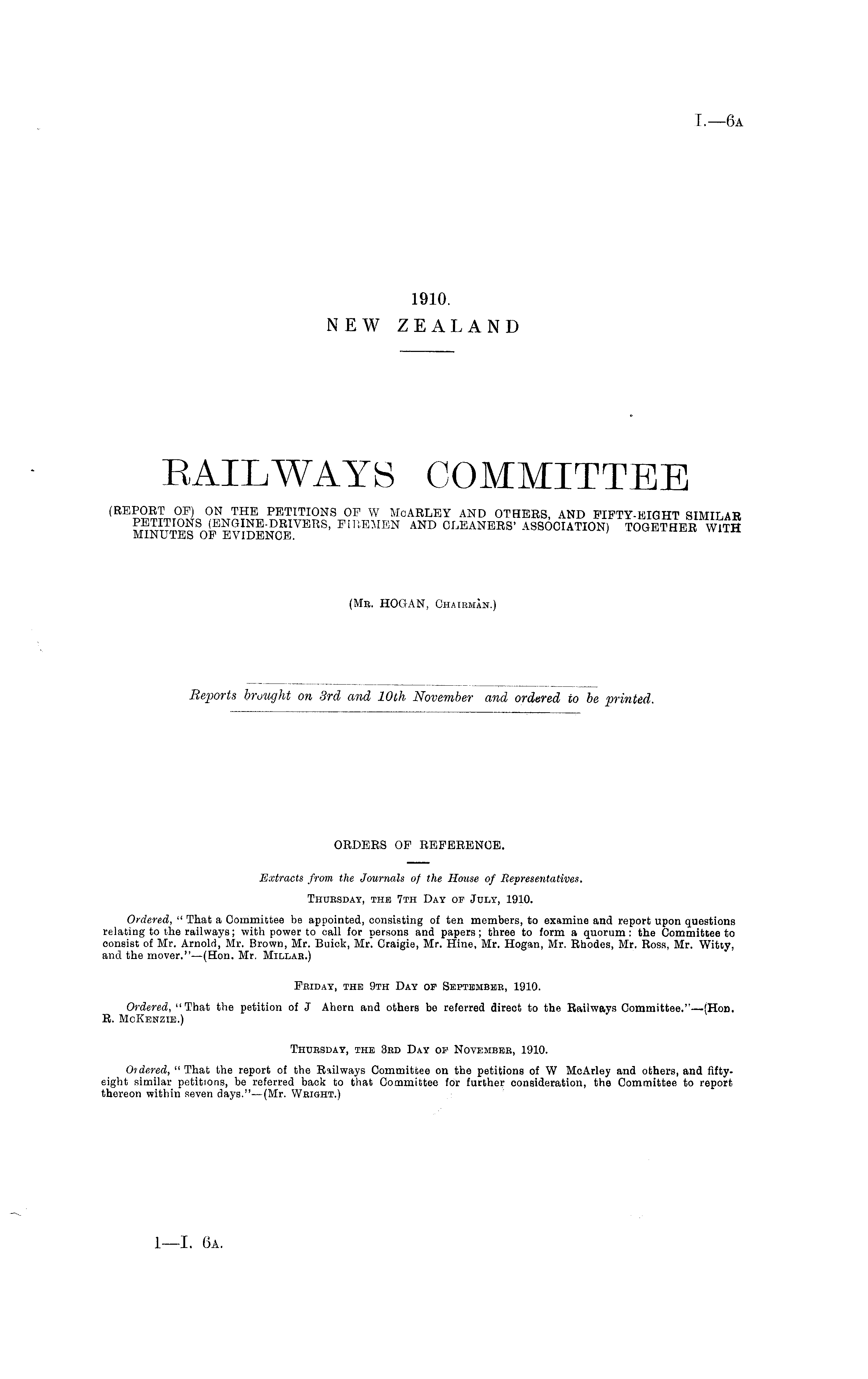 ORDERS OP REFERENCE. Extracts from the Journals of the House of Representatives. Thursday, the 7th Day of July, 1910. Ordered, " That a Committee be appointed, consisting of ten members, to examine and report upon questions relating to the railways; with power to call for persons and papers; three to form a quorum: the Committee to consist of Mr. Arnold, Mr. Brown, Mr. Buick, Mr! Craigie, Mr. Hine, Mr. Hogan, Mr. Rhodes, Mr. Ross, Mr. Witty, and the mover."—(Hon. Mr. Millab.) Ebiday, the 9th Day op Septembeb, 1910. Ordered, "That the petition of J Ahem and others be referred direct to the Railways Committee.''—(Hon. R. McKenzie.) Thursday, the 3rd Day of Novembeb, 1910. Ordered, " That the report of the Railways Committee on the petitions of W McArley and others, and fiftyeight similar petitions, be referred back to that Committee for further consideration, the Committee to report thereon within seven days."—(Mr. Wright.)