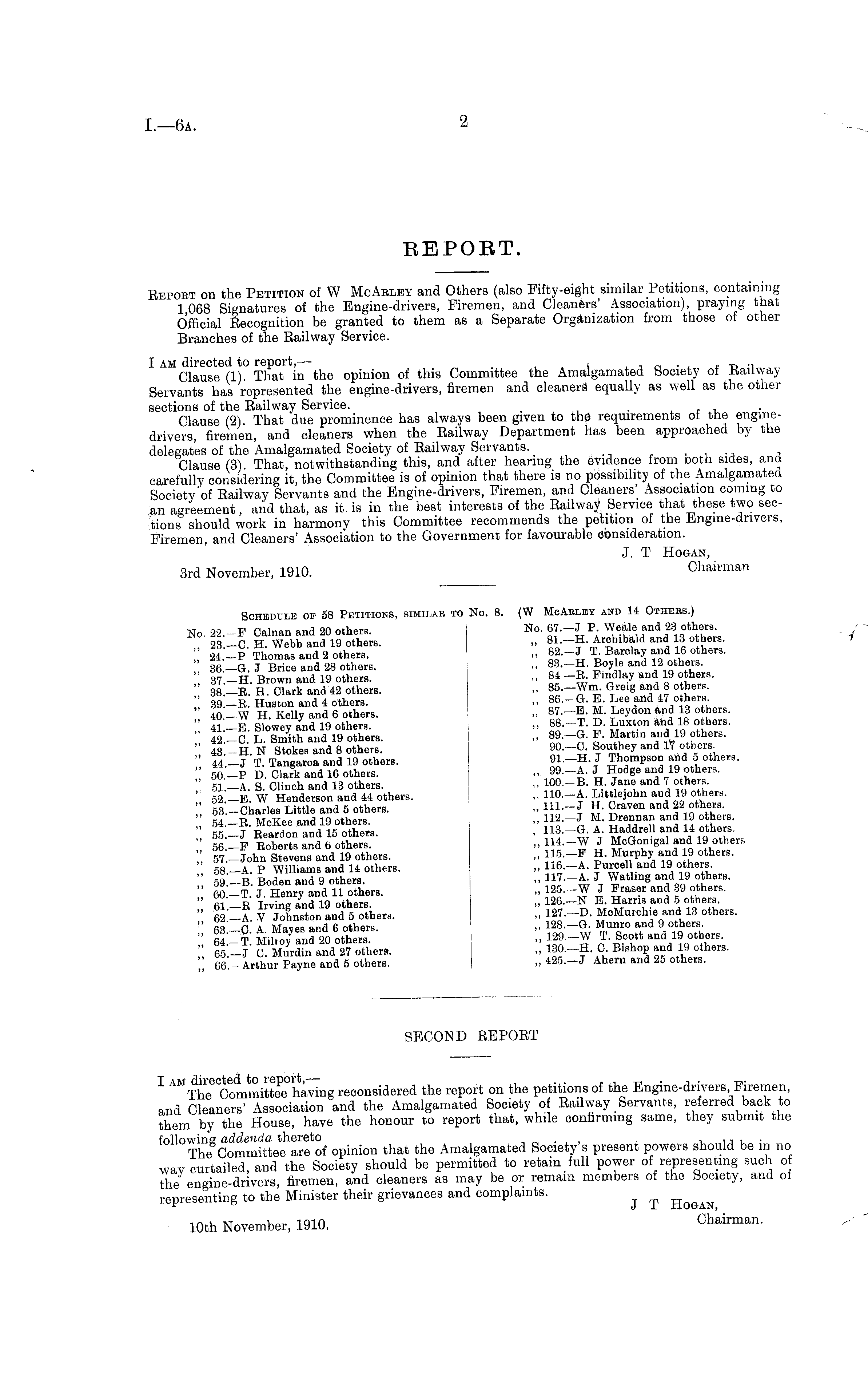 REPOET. Repokt on the Petition of W McAbley and Others (also Fifty-eight similar Petitions, containing 1 068 Signatures of the Engine-drivers, Firemen, and Cleaners' Association), praying that Official Recognition be granted to them as a Separate Organization from those of other Branches of the Railway Service. I am directed to report,— . .. Clause (1) That in the opinion of this Committee the Amalgamated Society ot Railway Servants has represented the engine-drivers, firemen and cleaners equally as well as the other sections of the Railway Service. . Clause (2). That due prominence has always been given to the requirements ot the enginedrivers, firemen, and cleaners when the Railway Department has been approached by the delegates of the Amalgamated Society of Railway Servants. Clause (3). That, notwithstanding this, and after hearing the evidence from both sides, and carefully considering it, the Committee is of opinion that there is no possibility of the Amalgamated Society'of Railway Servants and the Engine-drivers, Firemen, and Cleaners' Association coming to an agreement, and that, as it is in the best interests of the Railway Service that these two sections should work in harmony this Committee recommends the petition of the Engine-drivers, Firemen, and Cleaners' Association to the Government for favourable consideration. J. T Hogan, 3rd November, 1910. Chairman