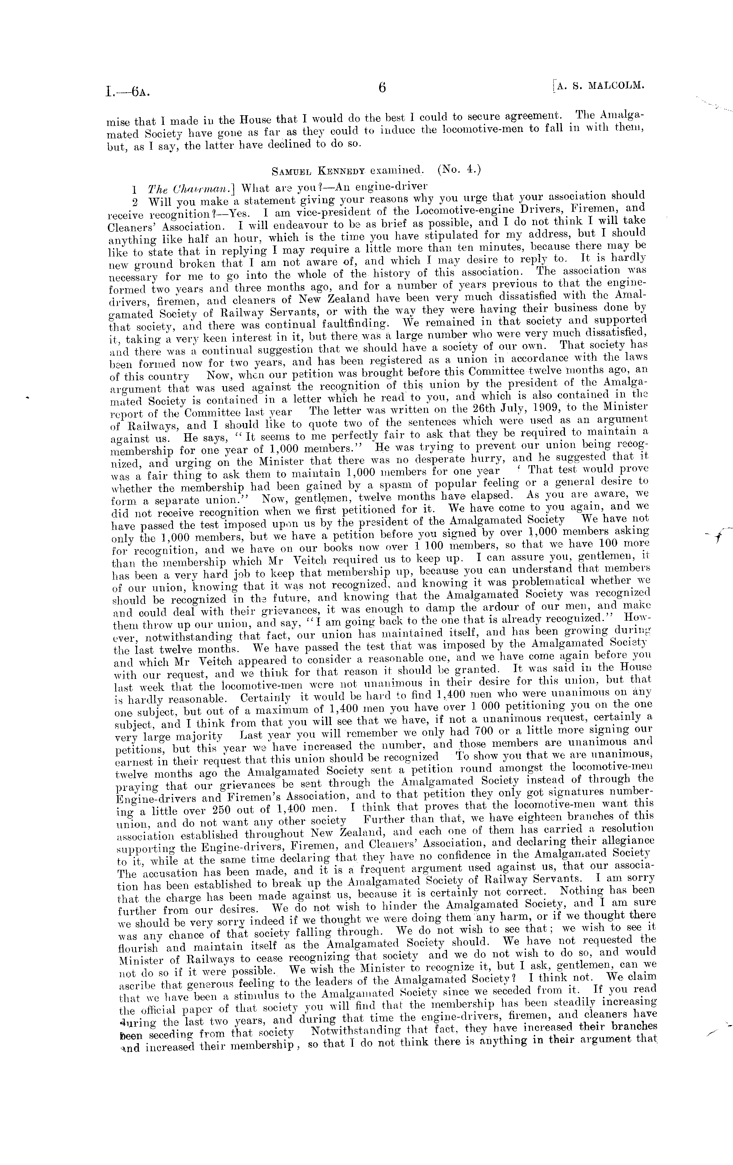 raise that I made in the House that I would do the best I could to secure agreement _ The Amalgamated Society have gone as far as they could to induce the locomotive-men to fall in with them, but, as I say, the latter have declined to do so. Samuel Kennedy examined. (No. 4.) 1 The Chairman.] What are you ?—An engine-driver 2 Will you make a statement giving your reasons why you urge that your association should receive recognition ?—Yes. lam vice-president of the Locomotive-engine Drivers Firemen, and Cleaners' Association. I will endeavour to be as brief as possible and Ido not think I will Ufa anything like half an hour, which is the time you have stipulated for my address, but I should like to state that in replying I may require a little more than ten minutes, because there may be new ground broken that I am not aware of, and which I may desire to reply to. It is hardly necessary for me to go into the whole of the history of this association. The association was formed two years and three months ago, and for a number of years previous to that the enginedrivers firemen, and cleaners of New Zealand have been very much dissatisfied with the Amalgamated Society of Railway Servants, or with the way they were having their business done by that society, and there was continual faultfinding. We remained m that society and supported it taking a very keen interest in it, but there was a large number who were very much dissatisfied, and there was a continual suggestion that we should have a society of our own That society has been formed now for two years, and has been registered as a union m accordance with the laws of this country Now, when our petition was brought before this Committee twelve months ago an argument that was used against the recognition of this union by the president of the Amalgamated Society is contained in a letter which, he read to you, and which is a*o contained m_ th, report of the Committee last year The letter was written on the 26th July, 1909, to the Minister of Railways, and I should like to quote two of the sentences which were used as an argument against us He says, "It seems to me perfectly fair to ask that they be required to maintain a membership for one year of 1,000 members." He was trying to prevent our union being recognized and urging on the Minister that there was no desperate hurry, and he suggested that it was a fair thing to ask them to maintain 1,000 members for one year That test would prove whether the membership had been gained by a spasm of popular feeling or a general desire to form a separate union." Now, gentlemen, twelve months have elapsed. As you areaware we did not receive recognition when we first petitioned for it. We have come to you again and we have passed the test imposed upon us by the president of the Amalgamated Society We have not nly thel,ooo members" but we have a petition before you signed by over 1,000 members asking for recognition, and we have on our books now over 1 100 members, so that we have 00 more than the membership which Mr Veitch required us to keep up. I can assure you has been a very hard job to keep that membership up, because you can understand that members of our union, knowing that it was not recognized, and knowing it was problematical whether we should be recognized in the future, and knowing that the Amalgamated Society was recognized and could deal with their grievances, it was enough to damp the ardour of our men, and make them throw up our union, and say, "lam going back to the one that is already recognized. However, notwithstanding that fact, our union has maintained itself and has been growing during the last twelve months. We have passed the test that was imposed by the Amalgamated Societj and which Mr Veitch appeared to consider a reasonable one, and we have come again before you with our request, and we think for that reason it should be granted. It was said m the House Ist week that the locomotive-men were not unanimous in their desire for this union, but that s hardly reasonable. Certainly it would be hard to find 1,400 men who were unanimous on any one subfect! but out of a maximum of 1,400 men you have over 1 000 petitioning you on the one s biect and I think from that you will see that we have, if not a unanimous request, certainly a verylarge majority Last year you will remember we only had 700 or a little more signing our petitions but this year we'have' increased the number, and those members are unanimous and ea nest n their request that this union should be recognized To show you that we are unanimous Xc months ago the Amalgamated Society sent a petition round amongst the locomotive-men pTayTng that our grievances be sent through the Amalgamated Society instead of through the EnTine S driver S and Firemen's Association, and to that petition they only got signatures numbering a little over 250 out of 1,400 men. I think that proves that the locomotive-men want this union and do not want any other society Further than that, we have eighteen branches of this ss k -it on established throughout New Zealand, and each one of them lias carried a resolution supper ng the Engine-dr verl Firemen, and Cleaners' Association, and declaring their allegiance o It whifeathe same time declaring that they have no confidence in the Amalgamated Society The accusation has been made, and it is a frequent argument used against us, that our association has been established to break up the Amalgamated Society of Railway Servants I am sorry ~ t he charge has been made against us, because it is certainly not correct. Nothing has been £ her from our deS. We cfo not wish to hinder the Amalgamated Society, and I am sure we shouH tovery sorry indeed if we thought we were doing them any harm or if we thought there asany chance of tljt society falling through. We do not wish to see that; we wish to see it flourish and maintain itself as the Amalgamated Society should. We have not requested the Minister of Railways to