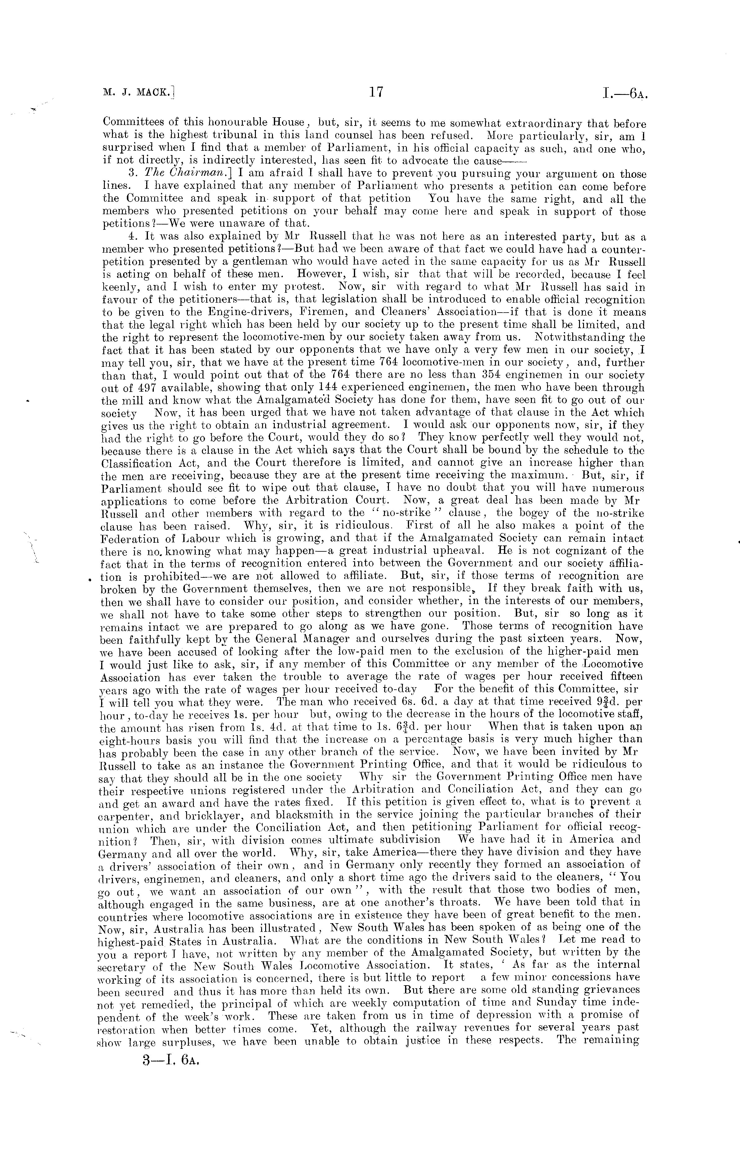 Committees of this honourable House , but, sir, it seems to me somewhat extraordinary that before what is the highest tribunal in this land counsel has been refused. More particularly, sir, am 1 surprised when I find that a member of Parliament, in his official capacity as such, and one who, if not directly, is indirectly interested, has seen fit to advocate the cause 3. The Chairman.] I am afraid I shall have to prevent you pursuing your argument on those lines. I have explained that any member of Parliament who presents a petition can come before the Committee and speak in support of that petition You have the same right, and all the members who presented petitions on your behalf may come here and speak in support of those petitions?—We were unaware of that. 4. It was also explained by Mr Russell that ha was not here as an interested party, but as a member who presented petitions? —But had we been aware of that fact we could have had a counterpetition presented by a gentleman who would have acted in the same capacity for us as Mr .Russell is acting on behalf of these men. However, I wish, sir that that will be recorded, because I feel keenly, and I wish to enter my protest. Now, sir with regard to what Mr Russell has said in favour of the petitioners—that is, that legislation shall be introduced to enable official recognition to be given to the Engine-drivers, Firemen, and Cleaners' Association —if that is done it means that the legal right which has been held by our society up to the present time shall be limited, and the right to represent the locomotive-men by our society taken away from us. Notwithstanding the fact that it has been stated by our opponents that we have only a very few men in our society, I may tell you, sir, that we have at the present time 764 locomotive-men in our societ}', and, further than that, I. would point out that of the 764 there are no less than 354 enginemen in our society out of 497 available, showing that only 144 experienced enginemen, the men who have been through the mill and know what the Amalgamated Society has done for them, have seen fit to go out of our society Now, it has been urged that we have not taken advantage of that clause in the Act which gives us the right to obtain an industrial agreement. I would ask our opponents now, sir, if they had the right to go before the Court, would they do so? They know perfectly well they would not, because there is a clause in the Act which says that the Court shall be bound by the schedule to the Classification Act, and the Court therefore is limited, and cannot give an increase higher than the men are receiving, because they are at the present time receiving the maximum. But, sir, if Parliament should see fit to wipe out that clause, I have no doubt that you will have numerous applications to come before the Arbitration Court. Now, a great deal has been made by Mr Russell and other members with regard to the "no-strike" clause, the bogey of the no-strike clause has been raised. Why, sir, it is ridiculous. First of all he also makes a point of the Federation of Labour which is growing, and that if the Amalgamated Society can remain intact there is no. knowing what may happen—a great industrial upheaval. He is not cognizant of the fact that in the terms of recognition entered into between the Government and our society affiliation is prohibited —we are not allowed to affiliate. But, sir, if those terms of recognition are broken by the Government themselves, then we are not responsible. If they break faith with us, then we shall have to consider our position, and consider whether, in the interests of our members, we shall not have to take some other steps to strengthen our position. But, sir so long as it remains intact we are prepared to go along as we have gone. Those terms of recognition have been faithfully kept by the General Manager and ourselves during the past sixteen years. Now, we have been accused of looking after the low-paid men to the exclusion of the higher-paid men I would just like to ask, sir, if any member of this Committee or any member of the Locomotive Association has ever taken the trouble to average the rate of wages per hour received fifteen years ago with the rate of wages per hour received to-day For the benefit of this Committee, sir I will tell you what they were. The man who received 6s. 6d. a day at that time received 9|d. per hour, to-day he receives Is. per hour but, owing to the decrease in the hours of the locomotive staff, the amount has risen from Is. 4d. at that time to Is. 6fd. per hour When that is taken upon an eight-hours basis you will find that the increase on a percentage basis is very much higher than has probably been the case in any other branch of the service. Now, we have been invited by Mr Russell to take as an instance the Government Printing Office, and that it would be ridiculous to say that they should all be in. the one society Why sir the Government Printing Office men have their respective unions registered under the Arbitration and Conciliation Act, and they can go and get an award and have the rates fixed. If this petition is given effect to, what is to prevent a carpenter, and bricklayer, and blacksmith in the service joining the particular branches of their union which are under the Conciliation Act, and then petitioning Parliament for official recognition? Then, sir, with division comes ultimate subdivision We have had it in America and Germany and all over the world. Why, sir, take America—there they have division and they have a drivers' association of their own , and in Germany only recently they formed an association of drivers, enginemen, and cleaners, and only a short time ago the drivers said to the cleaners, " You go out, we want an association of our own", with the result that those two bodies of men, although engaged in the same business, are at one another's throats. We have been told that in countries where locomotive