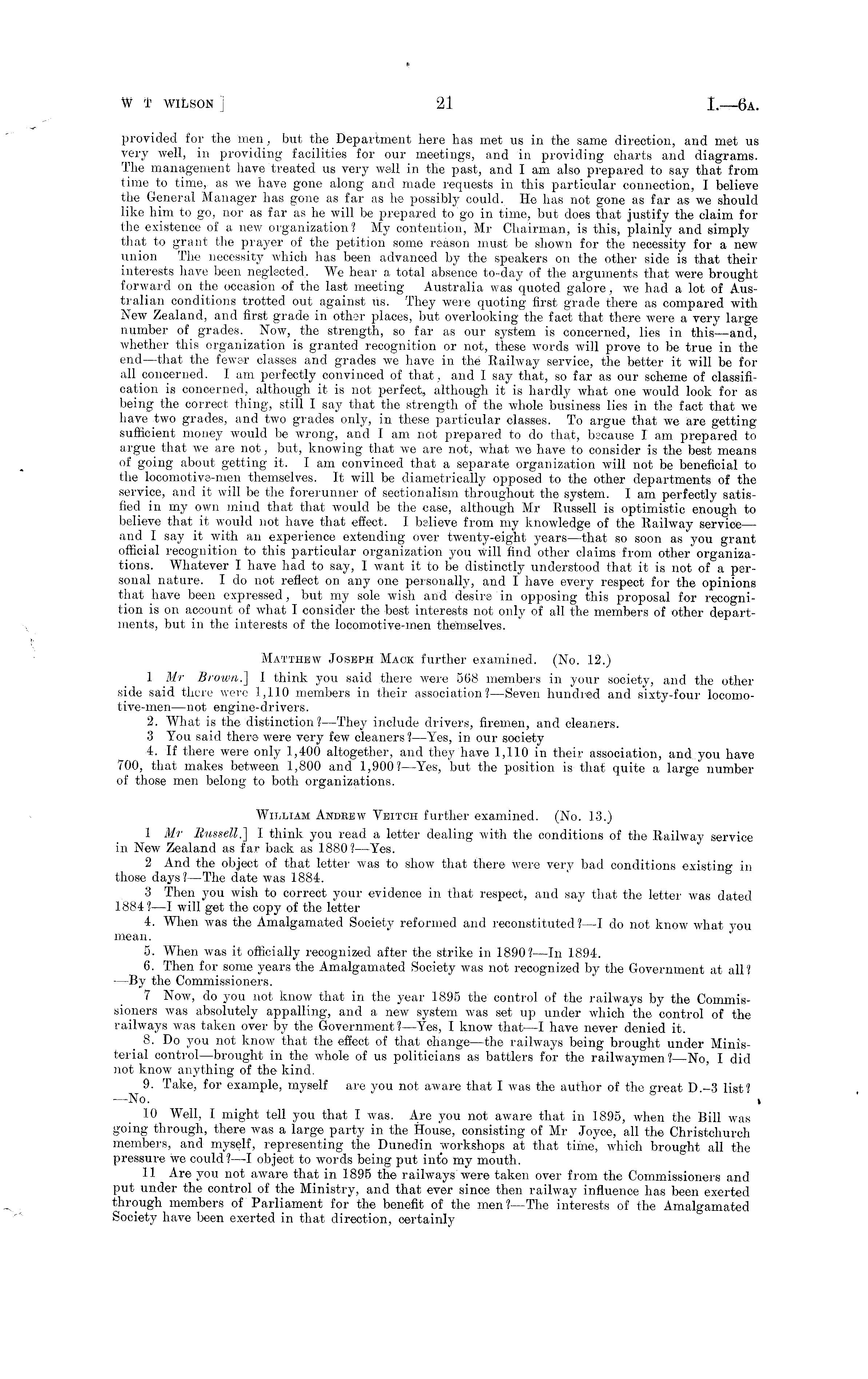 provided for the men, but the Department here has met us in the same direction, and met us very well, in providing facilities for our meetings, and in providing charts and diagrams. The management have treated us very well in the past, and I am also prepared to say that from time to time, as we have gone along and made requests in this particular connection, I believe the General Manager has gone as far as he possibly could. He lias not gone as far as we should like him to go, nor as far as he will be prepared to go in time, but does that justify the claim for the existence of a new organization? My contention, Mr Chairman, is this, plainly and simply that to grant the prayer of the petition some reason must be shown for the necessity for a new union The necessity which has been advanced by the speakers on the other side is that their interests have been neglected. We hear a total absence to-day of the arguments that were brought forward on the occasion of the last meeting Australia was "quoted galore, we had a lot of Australian conditions trotted out against us. They were quoting first grade there as compared with New Zealand, and first grade in other places, but overlooking the fact that there were a very large number of grades. Now, the strength, so far as our system is concerned, lies in this—and, whether this organization is granted recognition or not, these words will prove to be true in the end—that the fewer classes and grades we have in the Railway service, the better it will be for all concerned. lam perfectly convinced of that, and I say that, so far as our scheme of classification is concerned, although it is not perfect, although it is hardly what one would look for as being the correct thing, still I say that the strength of the whole business lies in the fact that we have two grades, and two grades only, in these particular classes. To argue that we are getting sufficient money would be wrong, and I am not prepared to do that, because I am. prepared to argue that we are not, but, knowing that we are not, what we have to consider is the best means of going about getting it. lam convinced that a separate organization will not be beneficial to the locomotive-men themselves. It will be diametrically opposed to the other departments of the service, and it will be the forerunner of sectionalism throughout the system. lam perfectly satisfied in my own mind that that would be the case, although Mr Russell is optimistic enough to believe that it would not have that effect. I believe from my knowledge of the Railway service— I say it with an experience extending over twenty-eight years —that so soon as you grant official recognition to this particular organization you will find other claims from other organizations. Whatever I have had to say, I want it to be distinctly understood that it is not of a personal nature. I do not reflect on any one personally, and I have every respect for the opinions that have been expressed, but my sole wish and desire in opposing this proposal for recognition is on account of what I consider the best interests not only of all the members of other departments, but in the interests of the locomotive-men themselves. Matthew Joseph Mack further examined, (No. 12.) 1 Mr Brown.] I think, you said there were 568 members in your society, and the other side said there were 1,110 members in their association? —Seven hundred and sixty-four locomo-tive-men—not engine-drivers. 2. What is the distinction?— They include drivers, firemen, and cleaners. 3 You said there were very few cleaners ?—Yes, in our society 4. If there were only 1,400 altogether, and they have 1,110 in their association, and you have 700, that makes between 1,800 and 1,900? —Yes, but the position is that quite a large number of those men belong to both organizations. William Andrew Veitch further examined. (No. 13.) 1 Mr Russell.] I think you read a letter dealing with the conditions of the Railway service in New Zealand as far back as 1880?— Yes. 2 And the object of that letter was to show that there were very bad conditions existing in those days?—The date was 1884. 3 Then you wish to correct your evidence in that respect, and say that the letter was dated 1884?— I will get the copy of the letter 4. When was the Amalgamated Society reformed and reconstituted?—l do not know what you mean. 5. When was it officially recognized after the strike in 1890?— In 1894. 6. Then for some years the Amalgamated Society was not recognized by the Government at all? —By the Commissioners. 7 Now, do you not know that in the year 1895 the control of the railways by the Commissioners was absolutely appalling, and a new system was set up under which the control of the railways was taken over by the Government ?—Yes, I know that—l have never denied it. 8. Do you not know that the effect of that change—the railways being brought under Ministerial control—brought in the whole of us politicians as battlers for the railwaymen?—No, I did not know anything of the kind. 9. Take, for example, myself are you not aware that I was the author of the great D—3 list? —No. 10 Well, I might tell you that I was. Are you not aware that in 1895, when the Bill was going through, there was a large party in the House, consisting of Mr Joyce, all the Christchurch members, and myself, representing the Dunedin workshops at that time, which brought all the pressure we could?—l object to words being put into my mouth. 11 Are you not aware that in 1895 the railways were taken over from the Commissioners and put under the control of the Ministry, and that ever since then railway influence has been exerted through members of Parliament for the benefit of the men?—The interests of the Amalgamated Society have been exerted in that direction, certainly