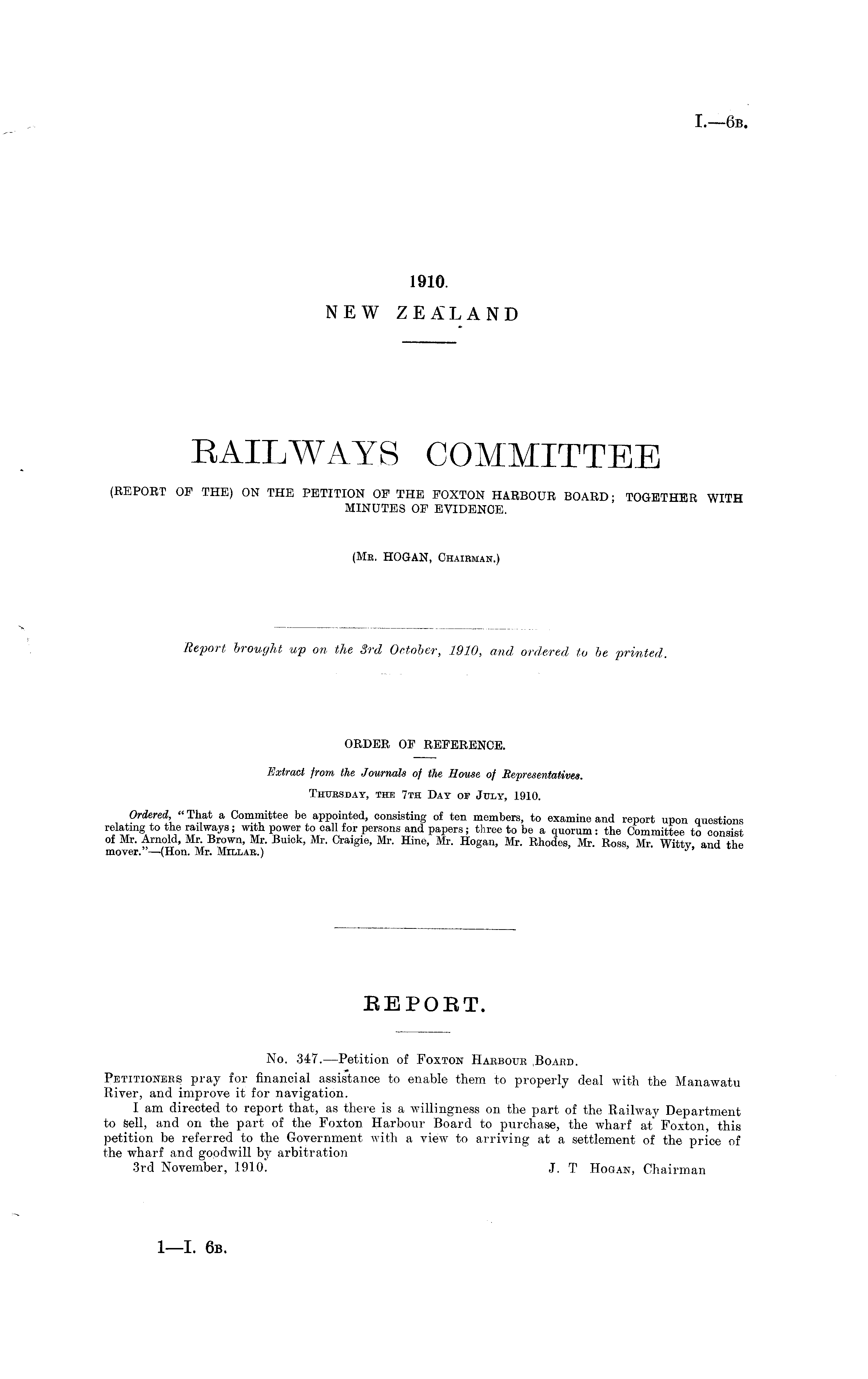 Report brought up on the 3rd October, 1910, and ordered to be printed. ORDER OF REFERENCE. Extract from the Journals of the House of Representatives. Thttbsday, the 7th Day ov July, 1910. Ordered, "That a Committee be appointed, consisting of ten members, to examine and report upon questions relating to the railways; with power to call for persons and papers; three to be a quorum: the Committee to consist of Mr. Arnold, Mr. Brown, Mr. Buick, Mr. Craigie, Mr. Hine, Mr. Hogan, Mr. Rhodes, Mr. Ross Mr Witty and the mover."—(Hon. Mr. Millab.)