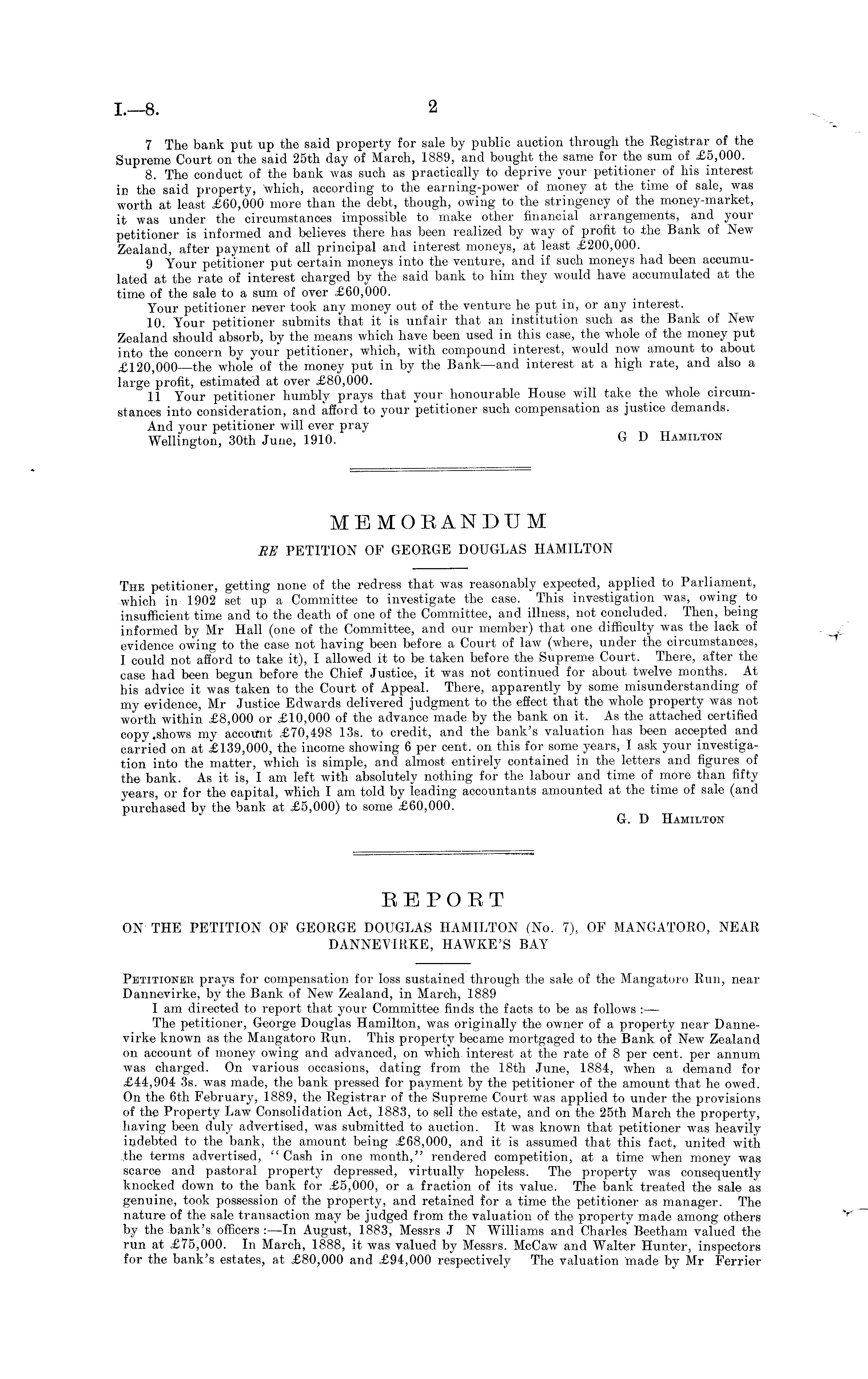 Petitioner prays for compensation for loss sustained through the sale of the Mangatoro Run, near Dannevirke, by the Bank of New Zealand, in March, 1889 I am directed to report that your Committee finds the facts to be as follows :— The petitioner, George Douglas Hamilton, was originally the owner of a property near Dannevirke known as the Mangatoro Run. This property became mortgaged to the Bank of New Zealand on account of money owing and advanced, on which, interest at the rate of 8 per cent, per annum was charged. On various occasions, dating from the 18th June, 1884, when a demand for £44,904 3s. was made, the bank pressed for payment by the petitioner of the amount that he owed. On the 6th February, 1889, the Registrar of the Supreme Court was applied to under the provisions of the Property Law Consolidation Act, 1883, to sell the estate, and on the 25th March the property, having been duly advertised, was submitted to auction. It was known that petitioner was heavily indebted to the bank, the amount being £68,000, and it is assumed that this fact, united with the terms advertised, " Cash in one month," rendered competition, at a time when money was scarce and pastoral property depressed, virtually hopeless. The property was consequently knocked down to the bank for £5,000, or a fraction of its value. The bank treated the sale as genuine, took possession of the property, and retained for a time the petitioner as manager. The nature of the sale transaction may be judged from the valuation of the property made among others by the bank's officers :—ln August, 1883, Messrs J N Williams and Charles" Beetham valued the run at £75,000. In March, 1888, it was valued by Messrs. McCaw and Walter Hunter, inspectors for the bank's estates, at £80,000 and £94,000 respectively The valuation made by Mr Ferrier